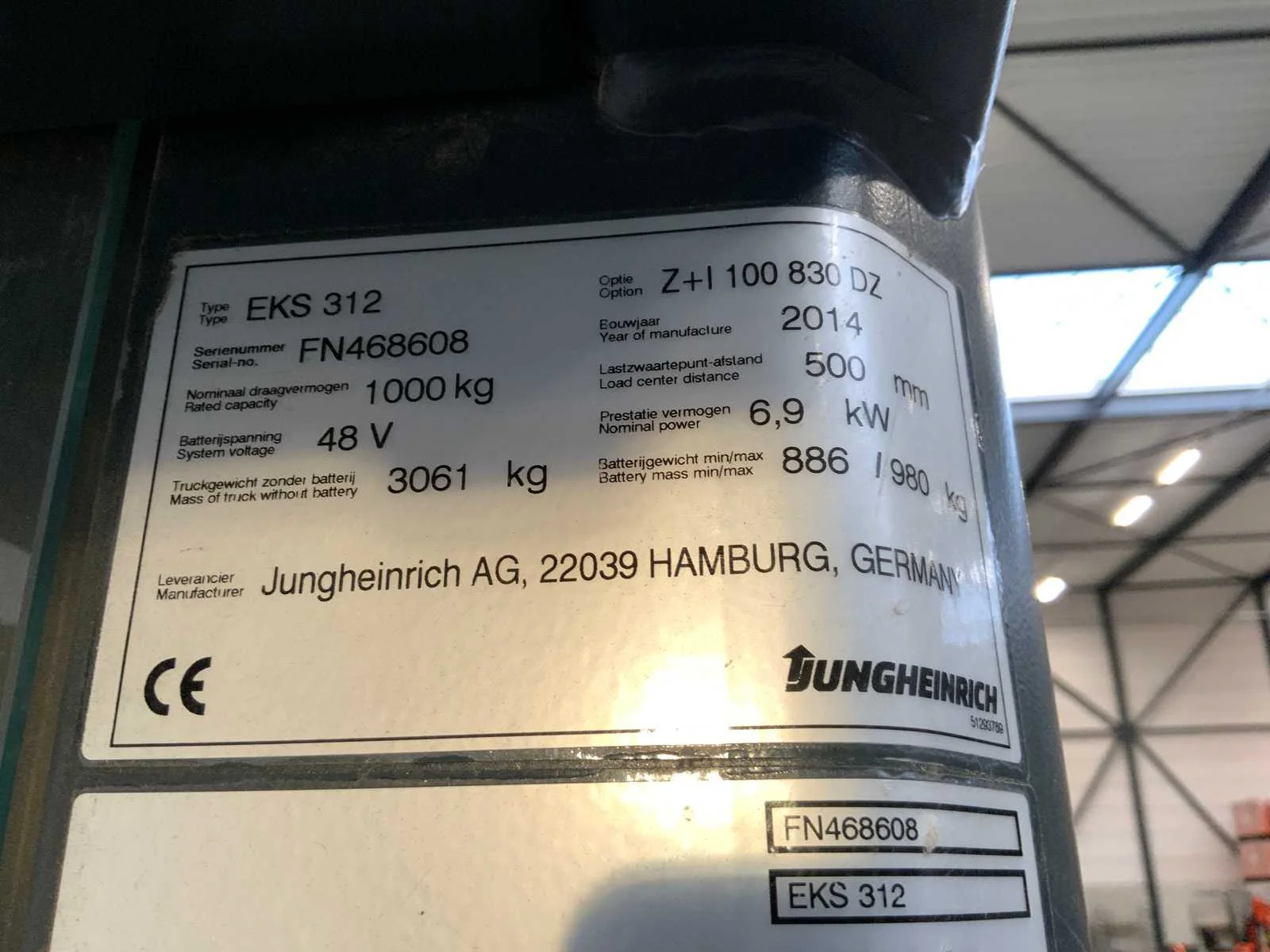 48V; hefhoogte vanaf vloer; 825mm; totale hefhoogte 9110mm; met red spot; inclusief acculader; Merk: Jungheinrich Type: EKS312 Bouwjaar: 2014 Serienummer: FN468608 Hefvermogen: 1000kg Hefhoogte: 9110mm Lepellengte: 1200mm Accu lader: true Eigen gewicht: 4010kg Totale afmeting L: 3400mm Totale afmeting Breedte: 1320mm Totale afmeting Hoogte: 3600mm