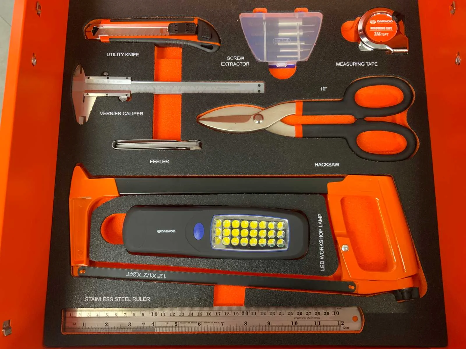 Let op; beschadigd; wat deukjes en schrammen; ; gereedschap in plastic verpakt; 12-delig tangenset; 13-delig hamerset; 14-delig meetset; 36-delig slagmoersleutel set; 21-delig sleutels met T-greep; 41-delig schroevendraaierset; 29-delig combinatiesleutels; 12-delig ringsleutels; 125-delig deppenset; 84-delig bitjes set; 6443 Merk: Daewoo Type: DAMW387