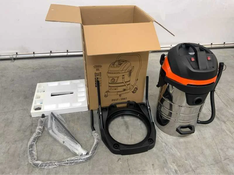 Vermogen: 2000W; zakloos: ja; nat/droog zuiger: ja; aansluiting: 230 V; omschrijving: ongebruikt in doos; v.v. 2 zwenkwielen; diverse hulpstukken; rvs reservoir van 80 liter inhoud; 3967; Type: 80L