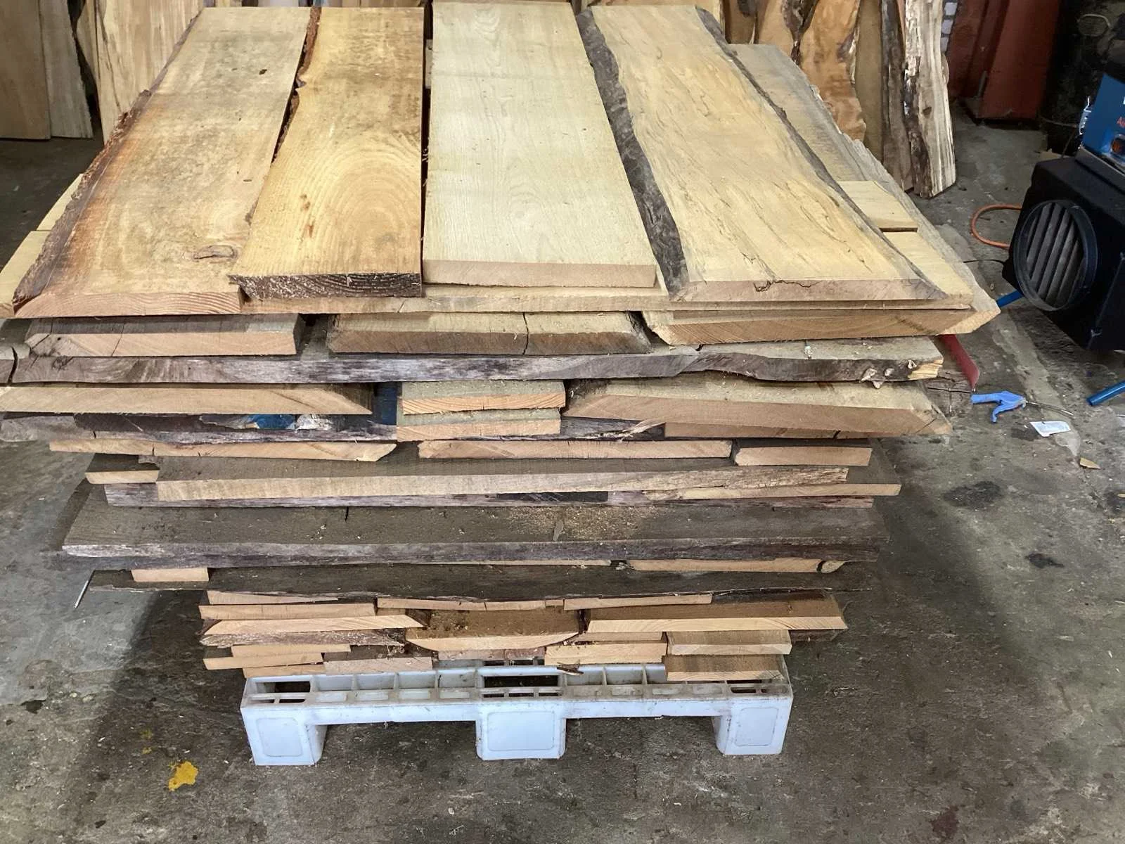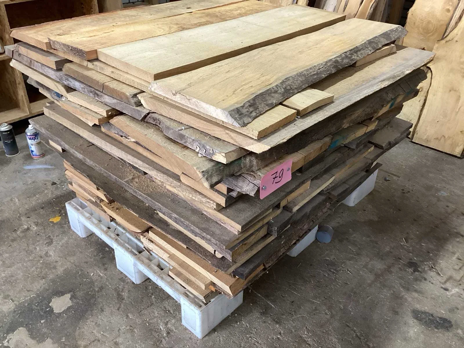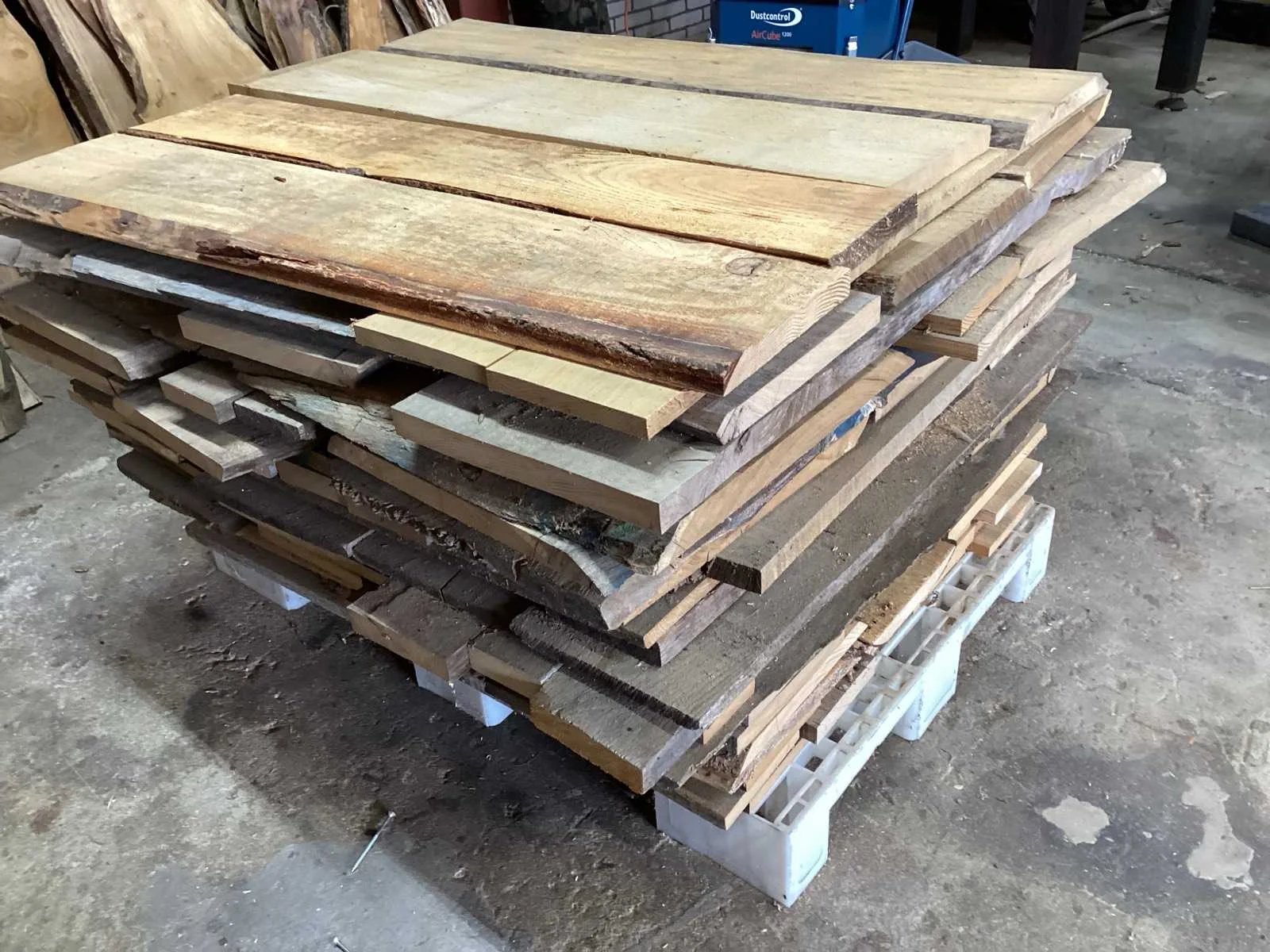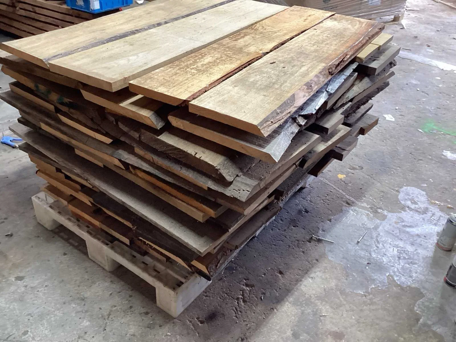 Diverse houten schaaldelen ; herkomst Nederland ; Totale pakket inhoud bij benadering 0,84 m3; plastic pallet inbegrepen Type: Eiken , Douglas, Lengte: 1100mm Breedte: 1170mm Hoogte: 800mm