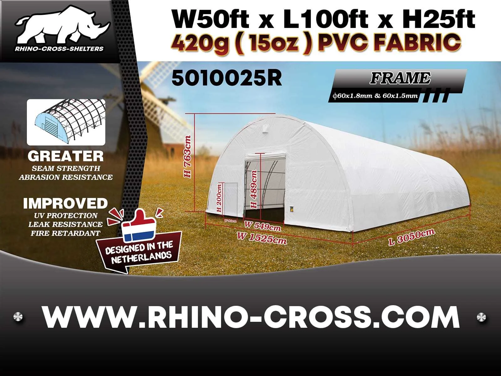 Voorzien van opslagtent / opslag shelter; dubbel trussen-/buizensysteem; gegalvaniseerd; beide uiteinden een deur; materiaal 420 gram PVC cover; kleur wit; inclusief montage handleiding; ongebruikt in 3 metalen kisten (transport afmetingen kist 1 348x110x126 cm, kist 2, kist 3) Merk: Rhino-Cross-Shelter Type: 5010025R 30,5x15,25x7,625 m Bouwjaar: 2025 Eigen gewicht: 1620kg Totale afmeting L: 30500mm Totale afmeting Breedte: 15250mm Totale afmeting Hoogte: 7625mm