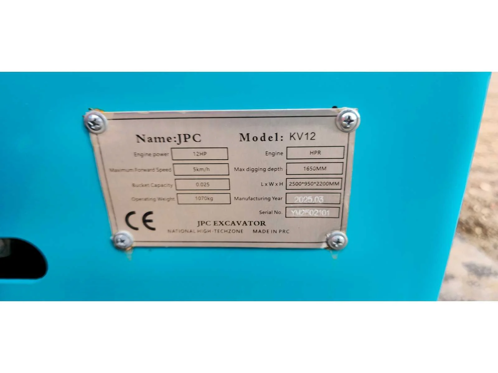 Voorzien van Motor 12HP; maximale Snelheid 5km/h; maximaal graaf diepte 1650MM; diesel motor; extra hydraulische functie; verlichting; ongebruikt Merk: JPC Type: KV12 Bouwjaar: 2025 Merk motor: HPR Motorvermogen (kW): 9kW Brandstof: Diesel Bedrijfsgewicht: 1020kg Max. werkbereik: 1650mm Max. graafdiepte: 1650mm Inclusief graafbak: Yes Rups breedte: 180mm Eigen gewicht: 1070kg Totale afmeting L: 2500mm Totale afmeting Breedte: 950mm Totale afmeting Hoogte: 2200mm