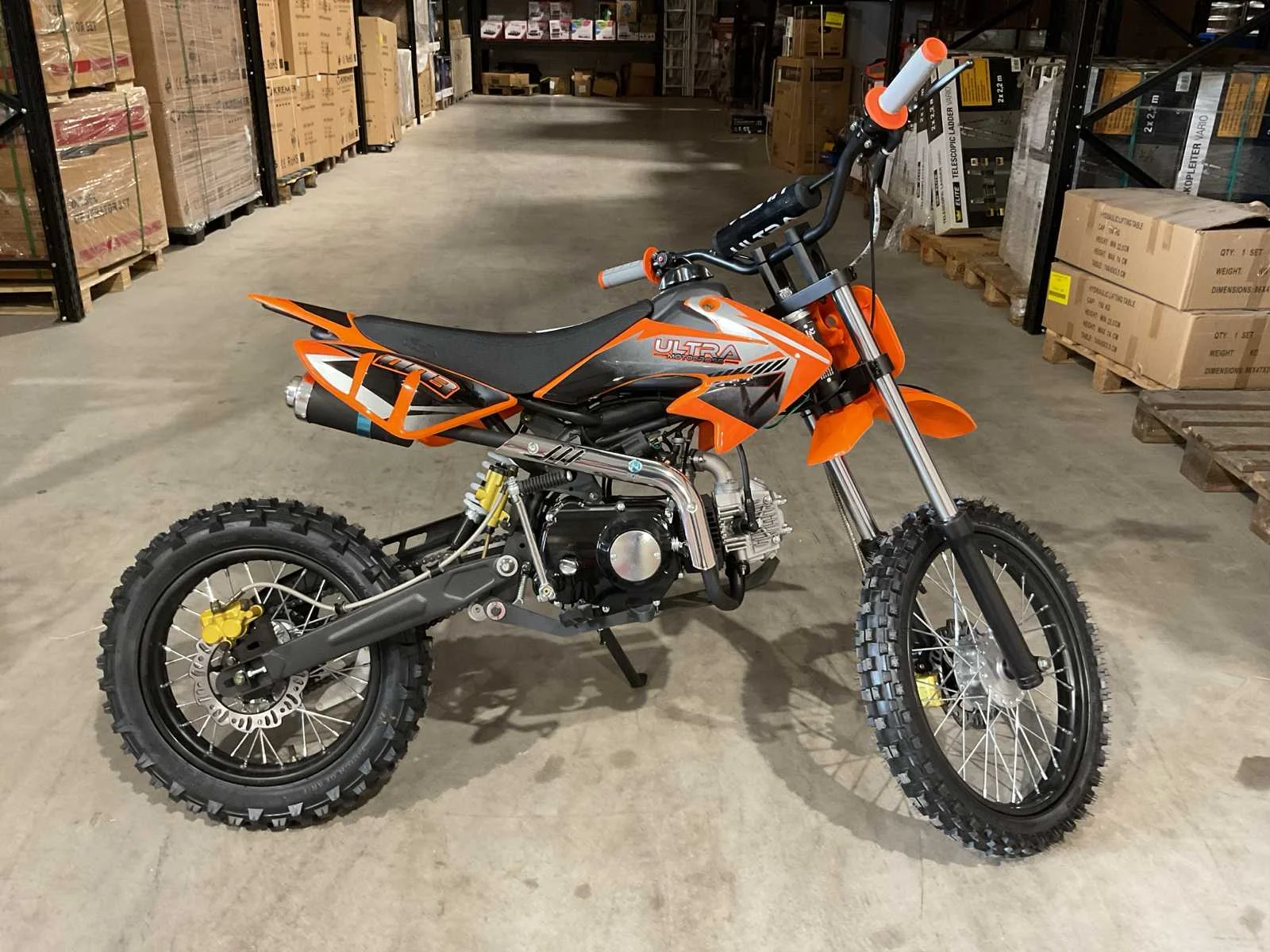 Voorzien van 110cc motor; Manuele koppeling; kickstart; Wiel/velg: V: 90/100-14 (14") A: 70/100-17 (17"); Hydraulische schijfrem; olieschokdemper; Enkele stalen uitlaatpijp; Maximale snelheid: 70 km/u; Ongebruikt in doos (Transport verpakking: 1295 x 375 x 620 mm 75kg) Merk: Ultra Motocross Model: DB001 OR Type: 110CC Cilinderinhoud: 110cc Gewicht: 68kg Kleur: Oranje zwarte zadel Transmissie: Manuele Bouwjaar: 2025