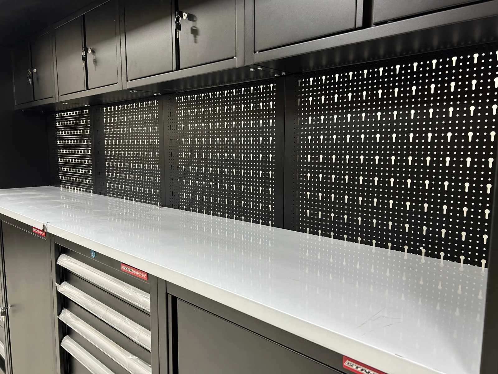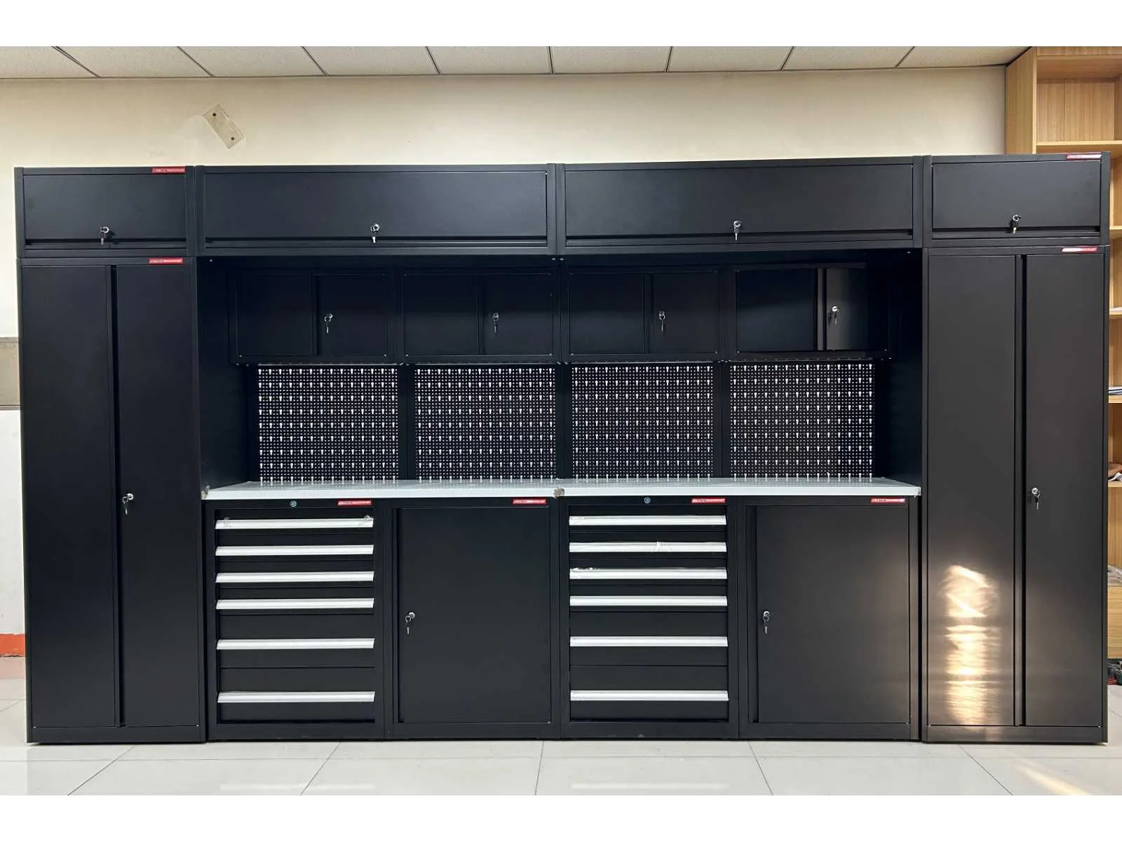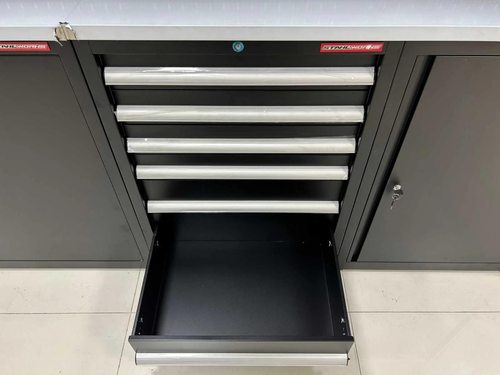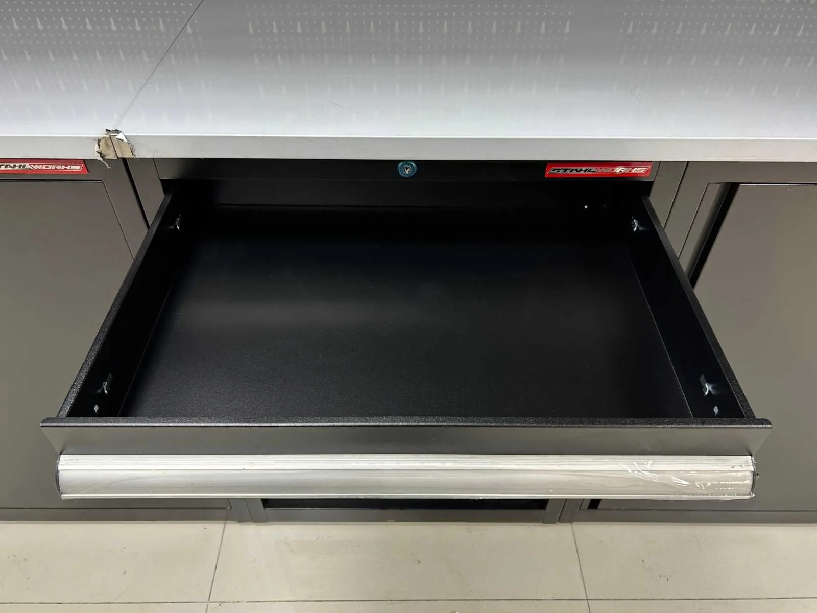 Voorzien van poeder coating; 30 mm houten werkblad binnenkant, buitenkant werkblad stainless steel; kleur zwart; ongebruikt in dozen (transport afmeting 2,1 m3) Merk: Stahlworks Model: TC-207 Product type: 420x55x203 cm Materiaal: SPCC steel