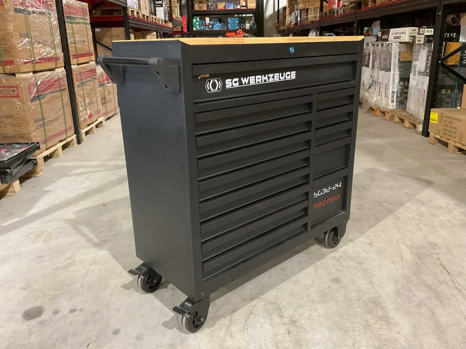 Voorzien van 14 lades waarvan 11 gevuld met gereedschap; professioneel chroom-vanadium gereedschap; heavy duty gereedschapswagen; houten werkblad; 4 wielen; stevig handvat; ongebruikt in doos (transport afmetingen 110x50x100 cm) Merk: SG Werkzeuge Type: SG32-24 Pro Max Bouwjaar: 2025 Aantal laden: 14 Met inhoud: true Eigen gewicht: 159kg Totale afmeting L: 1100mm Totale afmeting Breedte: 500mm Totale afmeting Hoogte: 1000mm