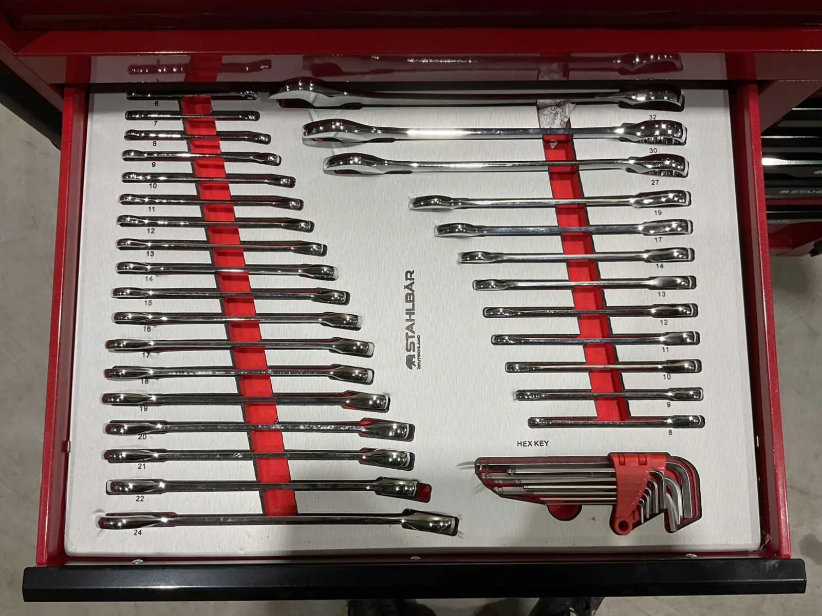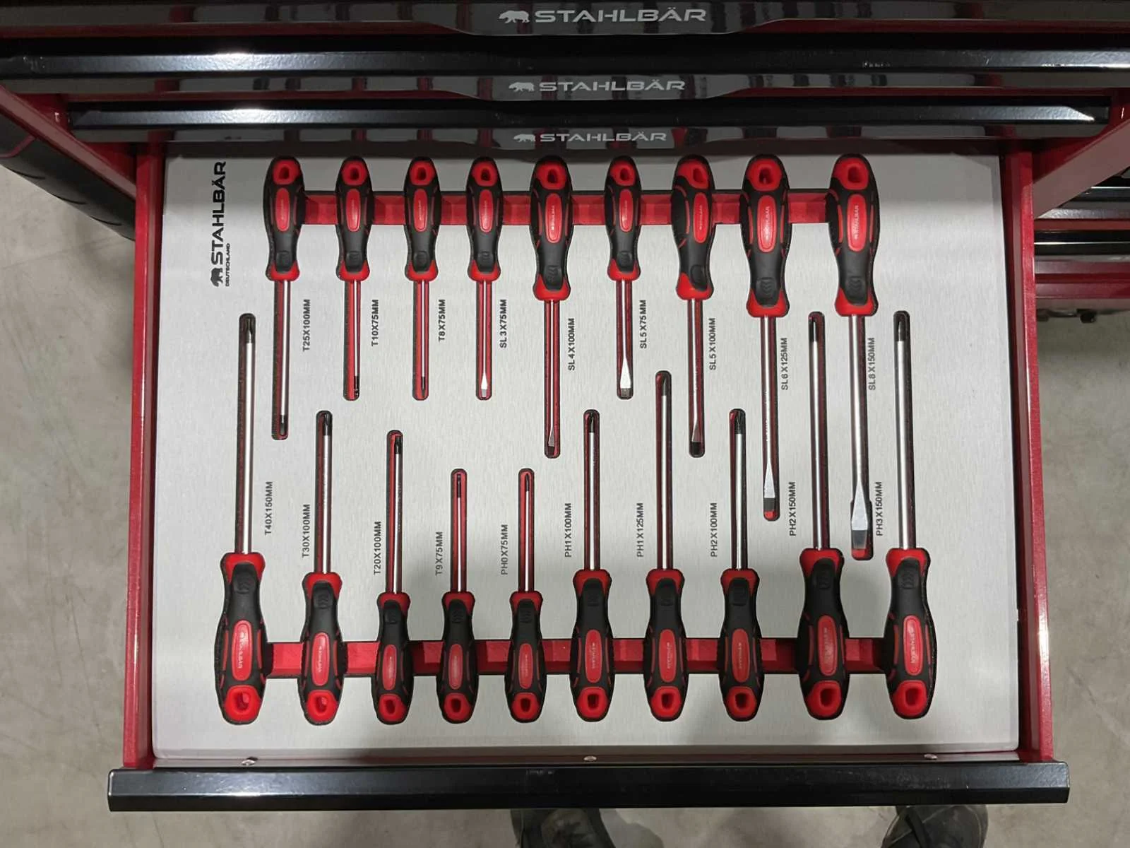 Voorzien van 13 lades waarvan 10 gevuld met gereedschap; professioneel chroom-vanadium gereedschap; heavy duty gereedschapswagen; houten werkblad; 4 wielen; stevig handvat; ongebruikt in doos (transport afmetingen 115x50x100 cm) Merk: Stahlbär Type: Deutschland XXXL PRO Bouwjaar: 2025 Aantal laden: 13 Met inhoud: true Eigen gewicht: 138kg Totale afmeting L: 1150mm Totale afmeting Breedte: 500mm Totale afmeting Hoogte: 1000mm