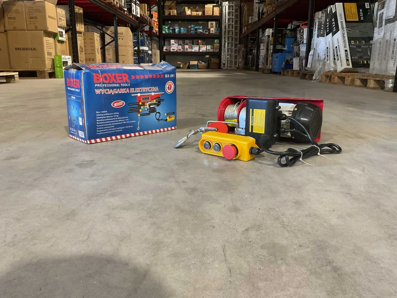Voorzien van katrol; Motorvermogen: 1500 W; Maximale Laadcapaciteit (enkel / dubbel-kabel): ca. 125kg / 250kg; Maximale Hefhoogte (125kg / 250kg): 12m / 6m; Gem. hijssnelheid: 10 m/min;Aansluiting: 230V; 1 x elektrische lier; 1 x katrol met haak; 1 x montagebeugels; 1 x Bekabelde afstandbediening 1,45; Ongebruikt in doos (Afmeting transport verpakking 355x190x235 mm lxbxh, gewicht 11.36 kg) Merk: Boxer Type: BX-561 250kg Bouwjaar: 2025 Capaciteit.: 1000kg Hijshoogte: 12m Afstandsbediening: true Aansluiting: 220V Totale afmeting L: 355mm Totale afmeting Breedte: 190mm Totale afmeting Hoogte: 235mm Eigen gewicht: 11.36kg