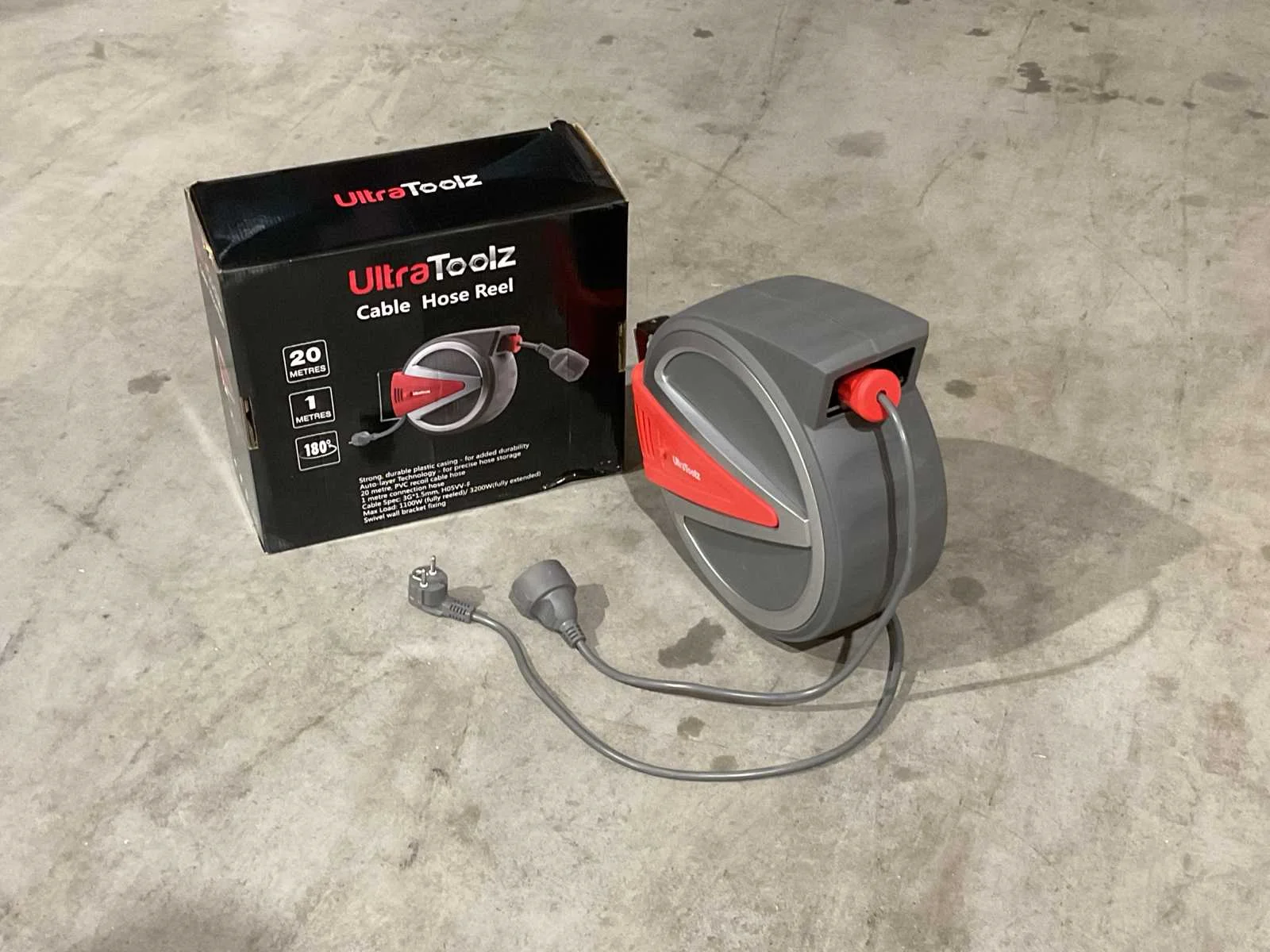 Voorzien van Voltage 230 V 12A; Kabellengte op haspel 20m; Muurbevestiging; 180° draaibaar; Lengte aansluitkabel 1 meter; Maximale stroombelasting van de kabel 1100W (opgerold), 3200W (uitgerold); Dikte kabel 3G 2.5 mm2; IP klasse IP44; Bruto gewicht 9km; verpakkingsafmeting: 14kg 395x345x335mm; Ongebruikt in doos Merk: Ultratoolz Type: 20m Bouwjaar: 2025 Aansluiting: 220V Male-male: true Male-female: true Op haspel: true Lengte: 20m