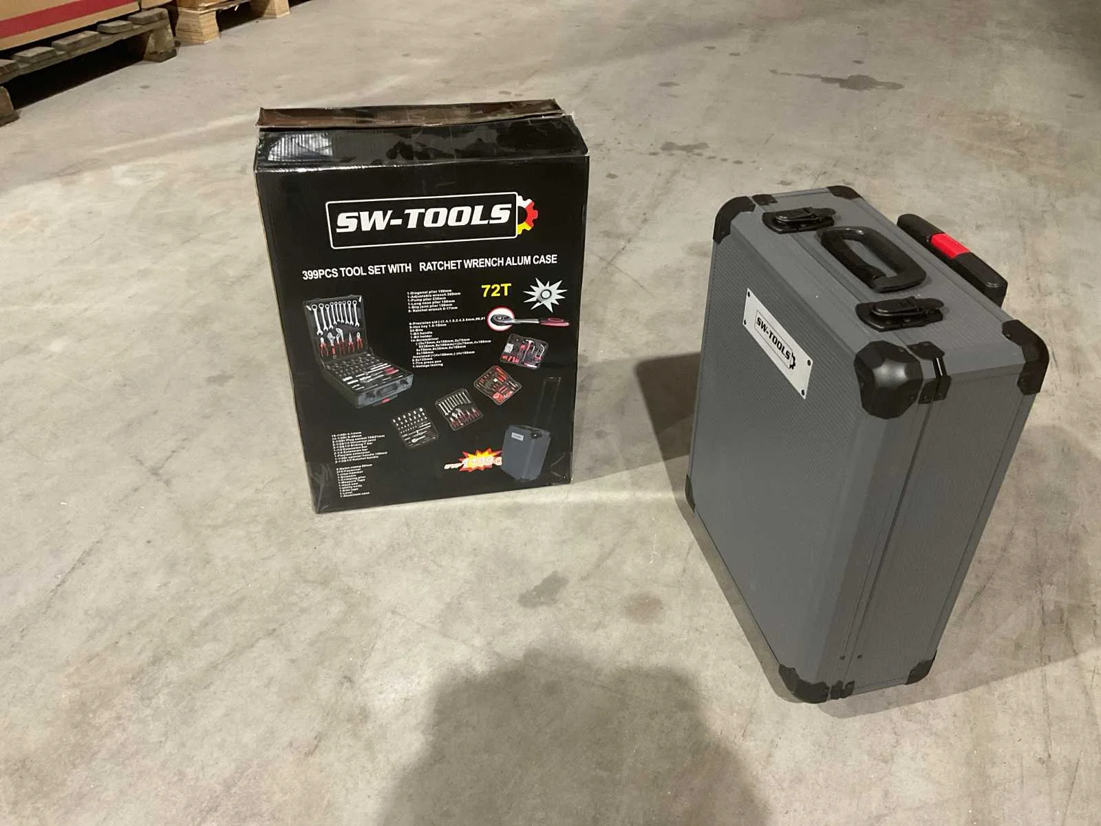 Voorzien van Schroevendraaierset; Zaag; Waterpas; Hamer; Bitset; Inbussleutels; Spanningsmeter; Handgereedschap; Spijkers; pluggen; Aluminium Koffer; Telescoop handgreep; wielen; ongebruikt in doos Merk: SW Tool Type: 399PCS Aluminium: true Metaal: true Met inhoud: true Afmeting l: 38.5mm Afmeting b: 20.5mm Afmeting h: 52mm Eigen gewicht: 13kg