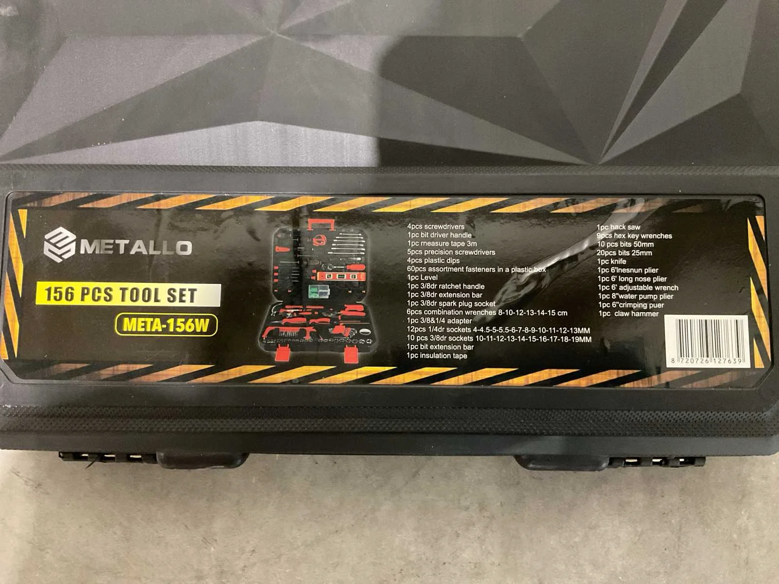 Voorzien van 4 stuks schroevendraaiers SL6*38, SL6*100; PH2*38, PH2*100; 1 stuk bit driver handvat; 1 stuk meetlint 3m; 5 stuks precisieschroevendraaiers; 4 stuks plastic dips; 60 stuks assortiment bevestigingsmiddelen in een doos; 1 stuk Niveau; 1 stuk 3/8dr ratelhandvat; 1 stuk 3/8dr verlengstuk; 1 stuk 3/8dr bougiedop; 6 ringsteeksleutels 8-10-12-13-14-15 cm; 1 stuk 3/8&1/4 adapter; 12 stuks 1/4dr doppen 4-4.5-5-5.5-6-7-8-9-10-11-12-13MM; 10 stuks 3/8dr doppen 10-11-12-13-14-15-16-17-18-19MM; 1 stuk bitverlengstuk; 1 stuk isolatietape; 1 stuk ijzerzaag; 9 stuks inbussleutels 1.5-2-2.5-3-4-5-6-8-10mm; 10 stuks bits 50 mm; 20 stuks bits 25mm; 1 stuk mes; 1 stuk 6'lnesnun tang; 1 stuk 6' langbektang; 1 stuks 6' verstelbare sleutel;1 stuk 8''waterpomptang; 1 stuk 6'' krimptang; 1 stuks klauwhamer; Ongebruikt in doos (Transport afmeting 450 x 90 x 360, Gewicht 5.58 KG) Merk: Metallo Met koffer: true Delig: 156 Type: META-156W Bouwjaar: 2025