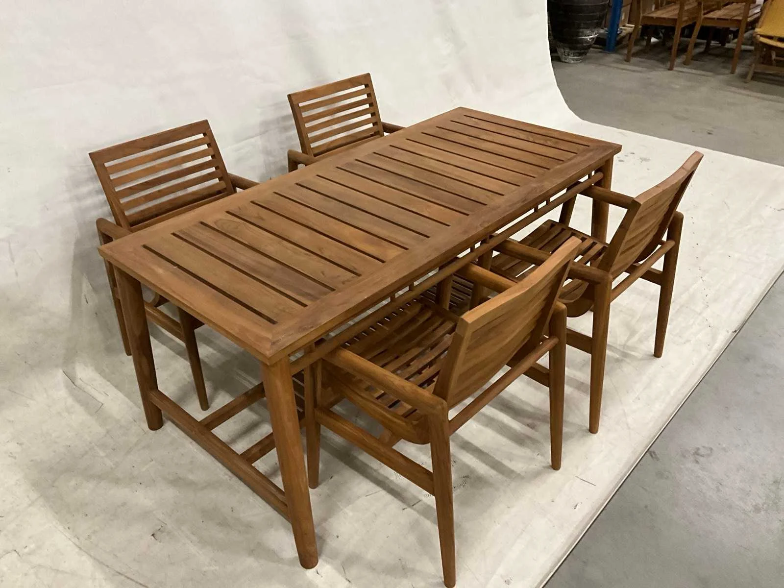 Teakhouten design tuinset, tafel 180x80 cm en 4 stoelen. Stoelen: 4 Breedte: 180cm Hoogte: 77cm Materiaal: Teakhout Diepte: 80