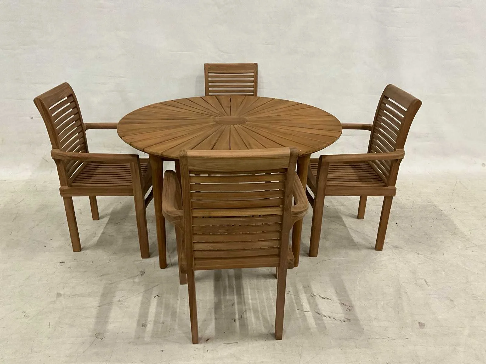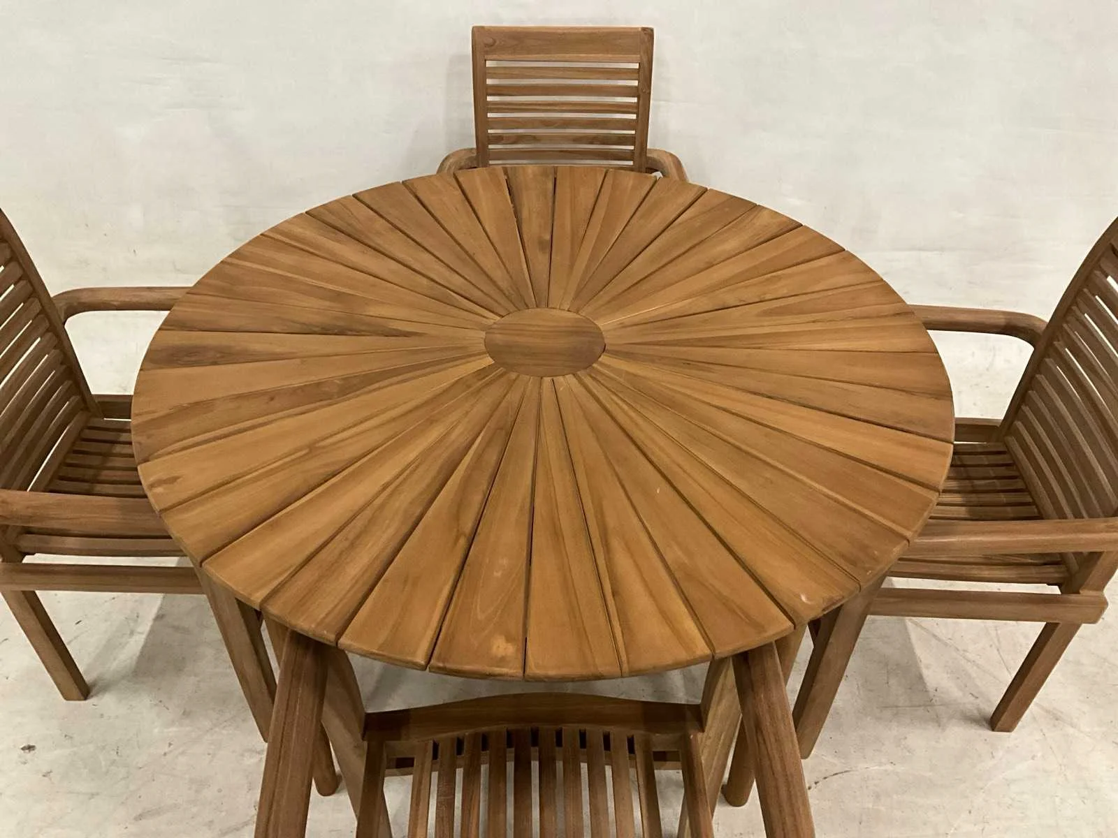 Teakhouten tuinset bestaande uit een 130 cm ronde tuintafel en 4 stapelbare stoelen. Stapelbaar: true Vorm: Rond Stoelen: 4 Lengte: 130cm Breedte: 130cm Hoogte: 76cm Materiaal: Teakhout Zithoogte: 45