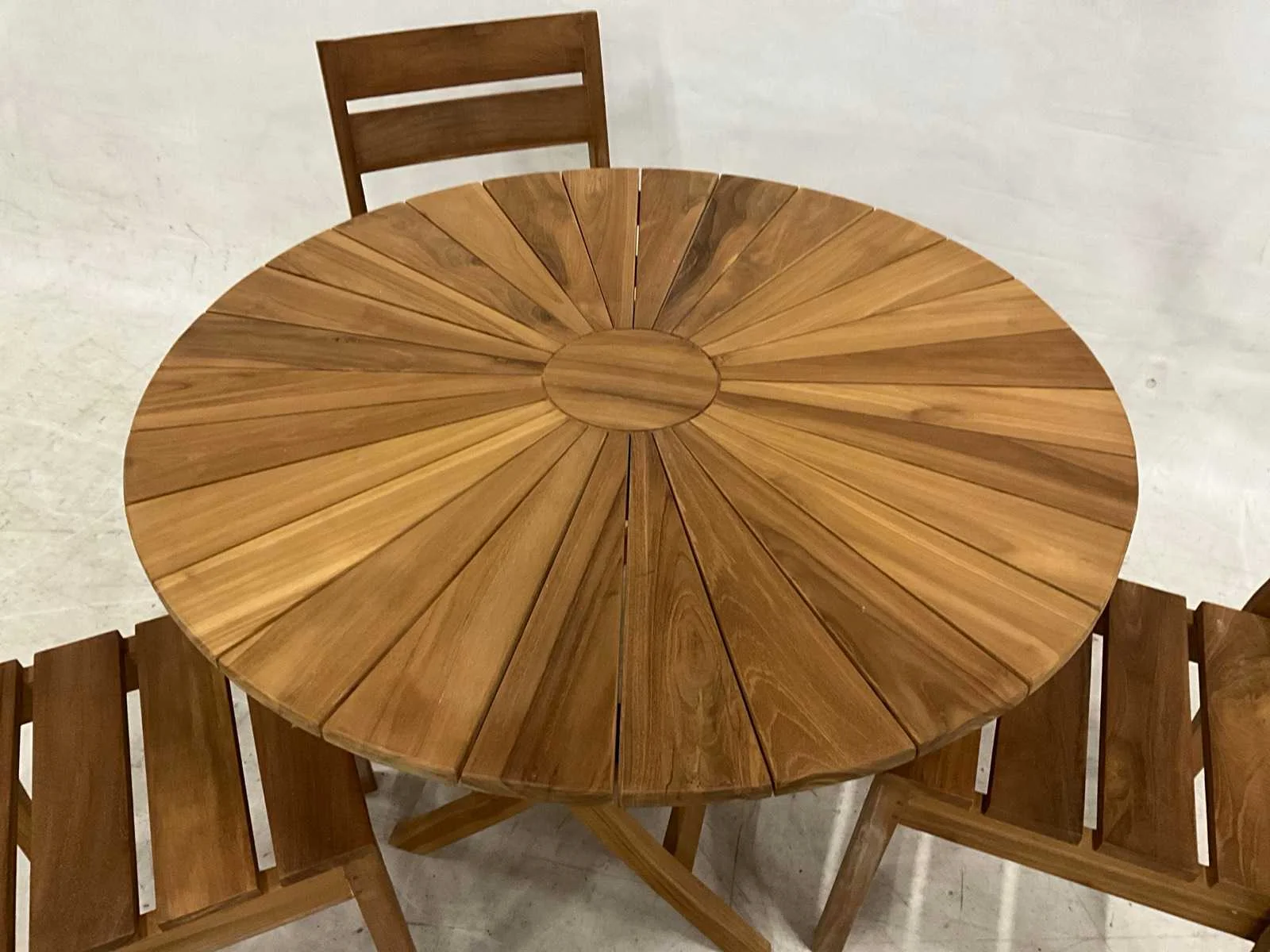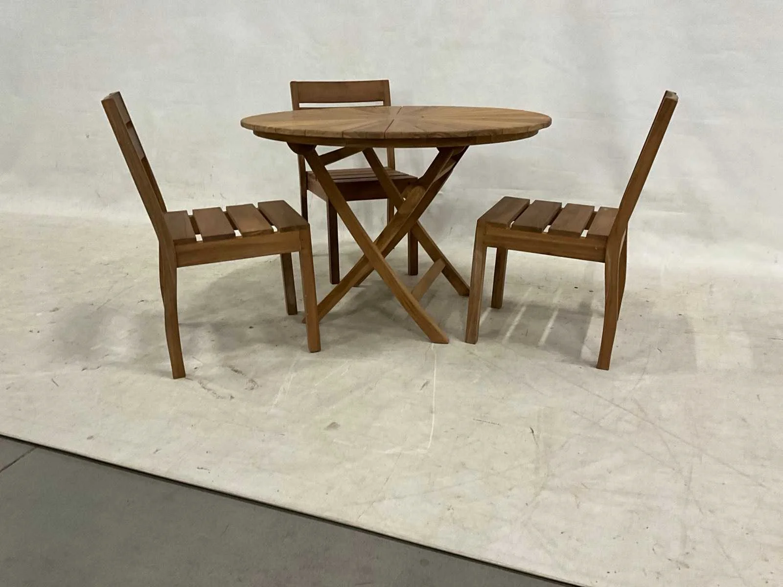 Teakhouten tuinset bestaande uit inklapbare tafel van 110 cm en 3 stapelbare stoelen. Vorm: Rond Stoelen: 3 Lengte: 110cm Breedte: 110cm Hoogte: 76cm Materiaal: Teakhout Zithoogte: 46
