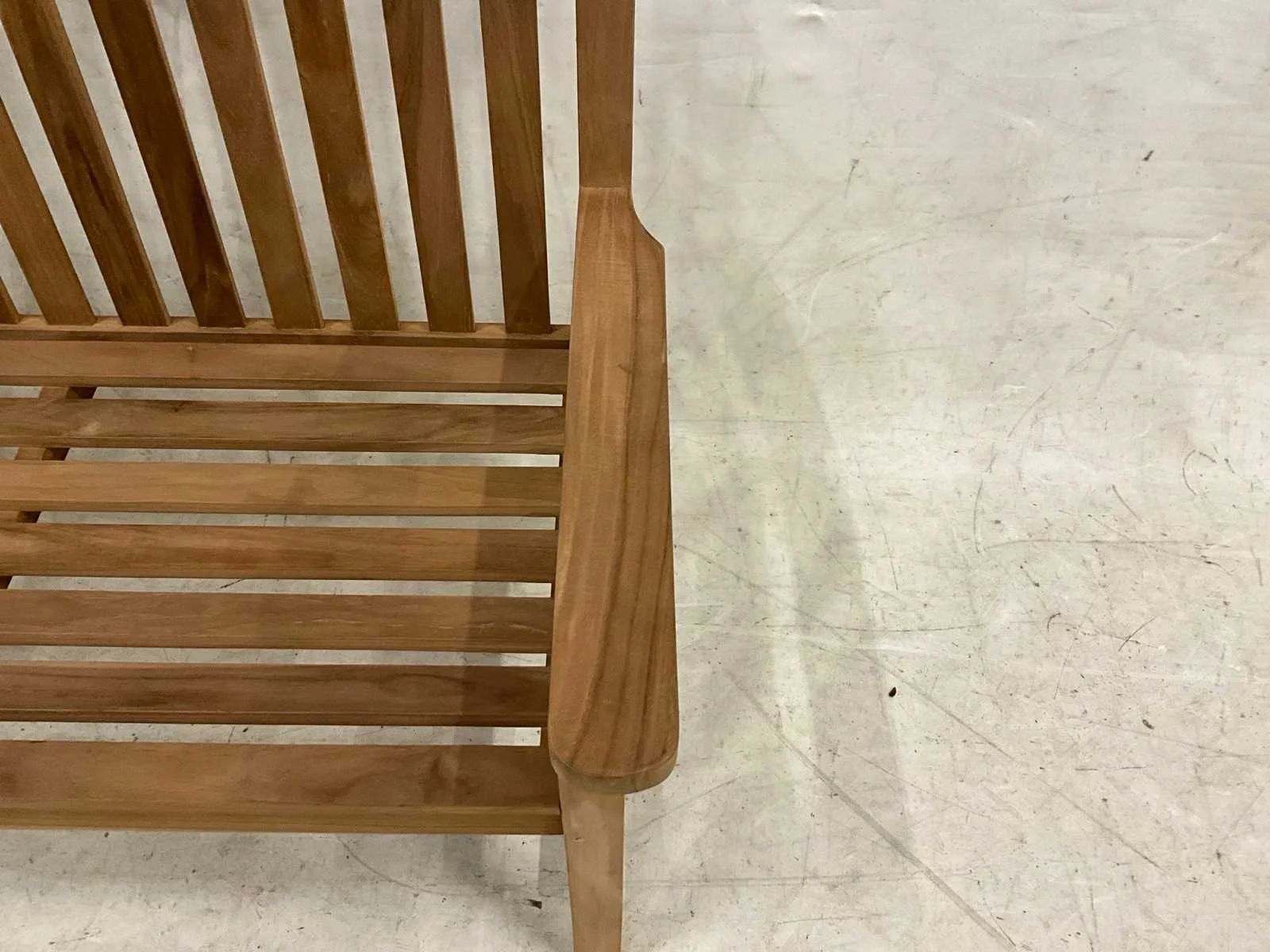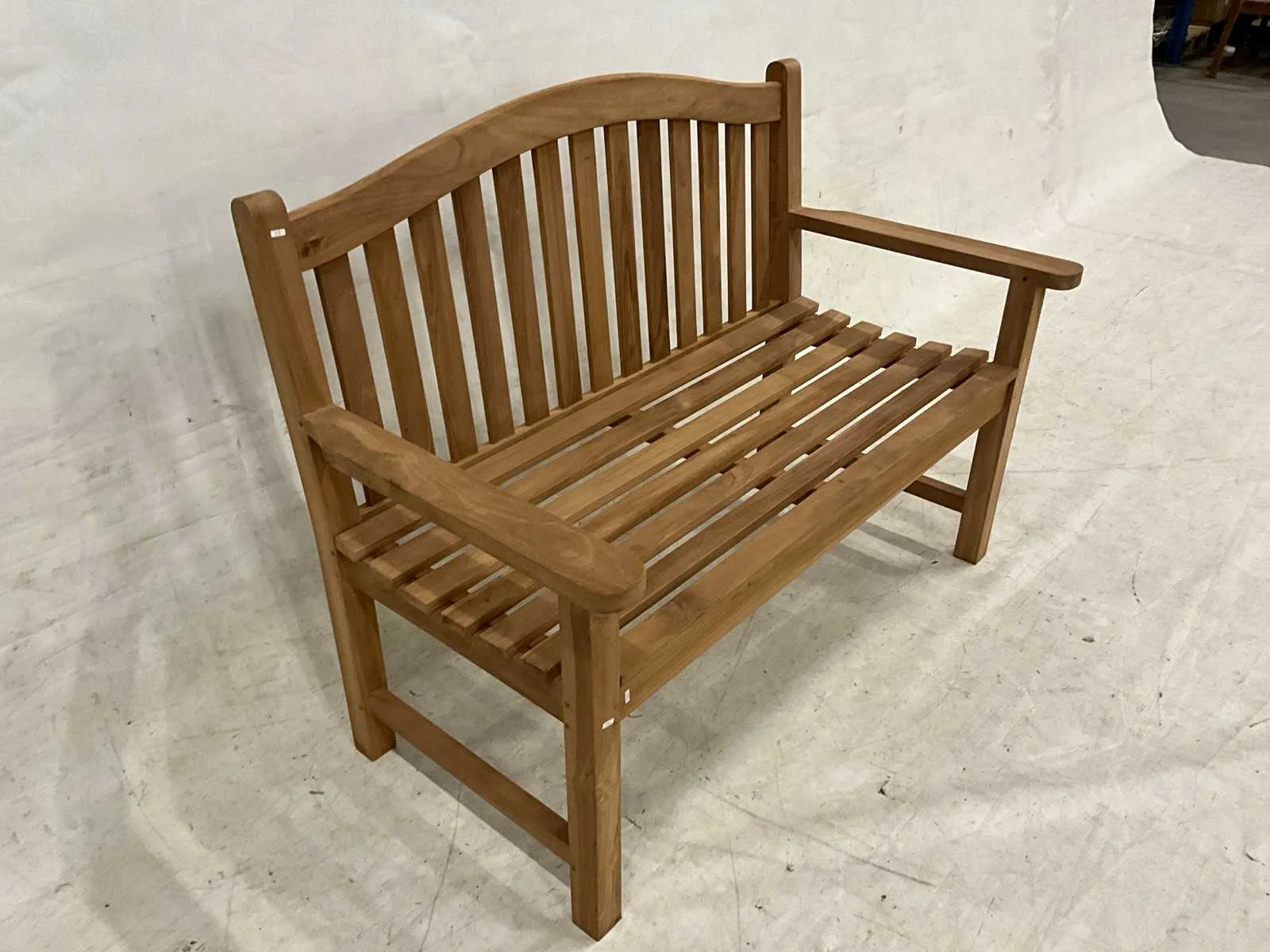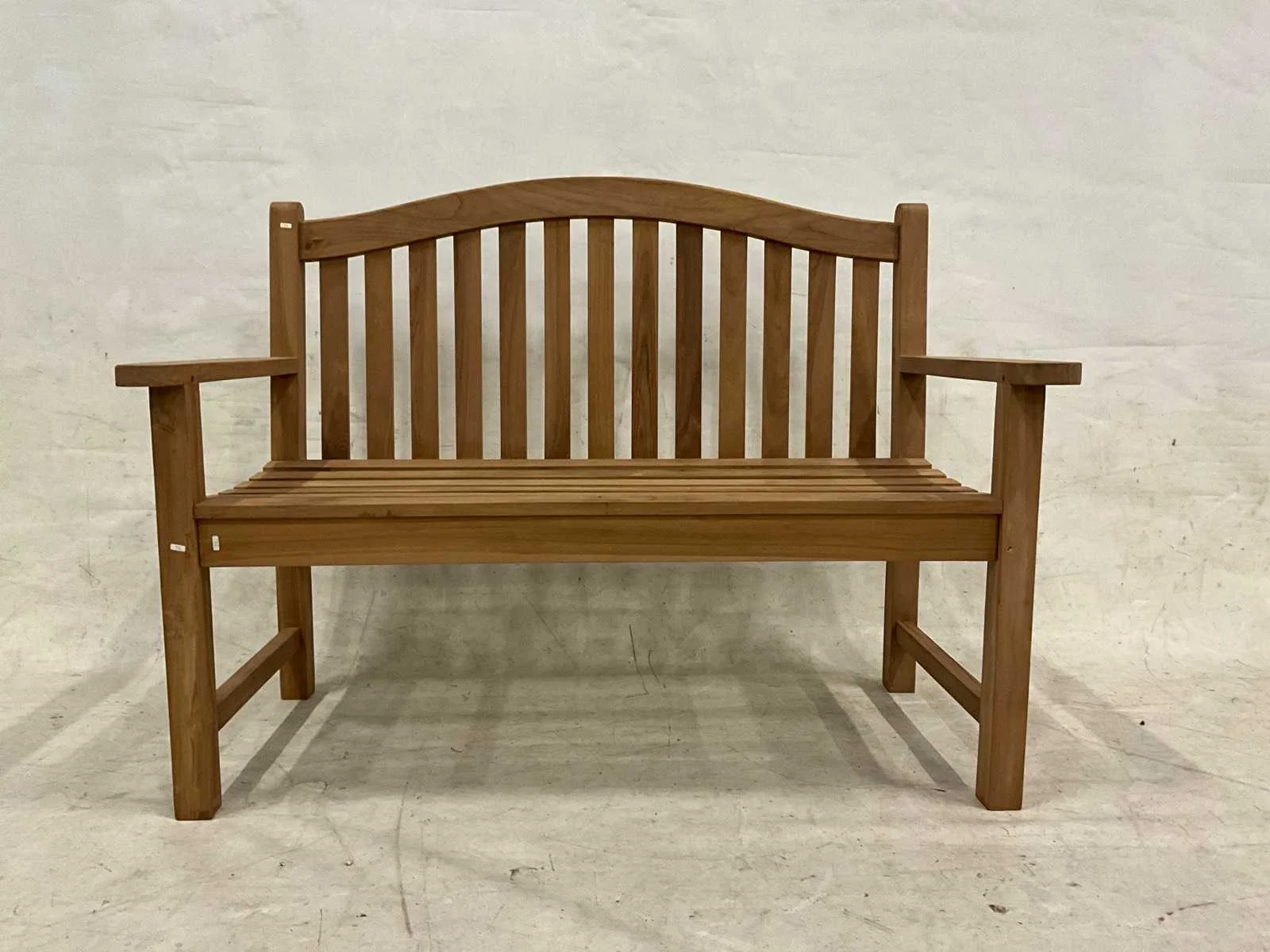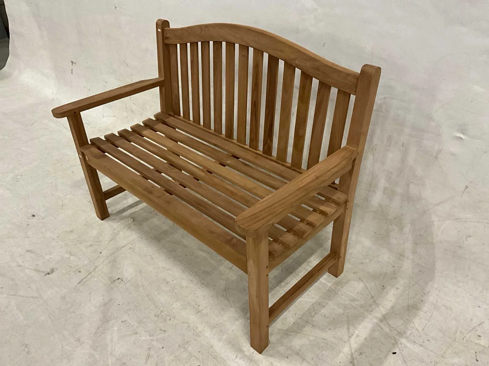 Showroom tuinbank met brede armleuning. Model: 120 cm Breedte: 120cm Hoogte: 92cm Zithoogte: 45 Diepte: 50 Materiaal: Teakhout