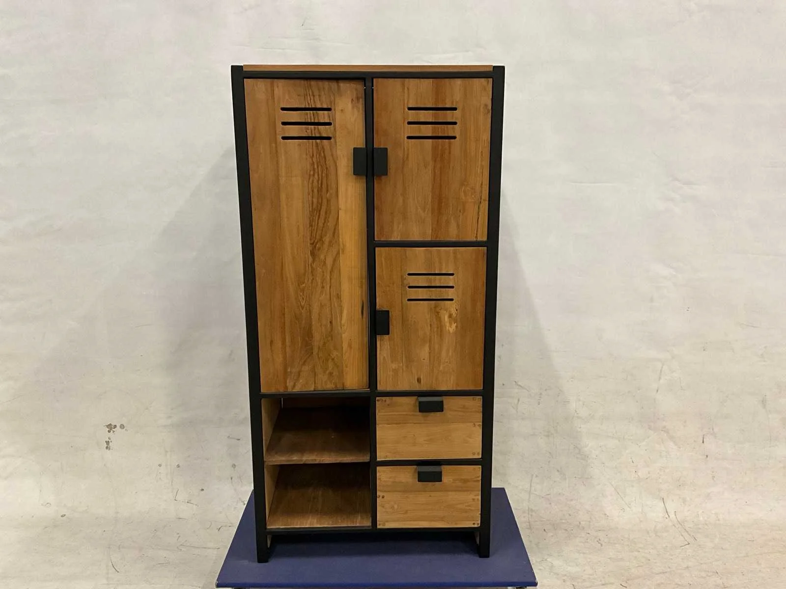 Opberg / kledingkast met vakken, deuren en lades Kleur: Bruin Breedte: 78cm Hoogte: 160cm Diepte: 50cm Materiaal: Teakhout en staal