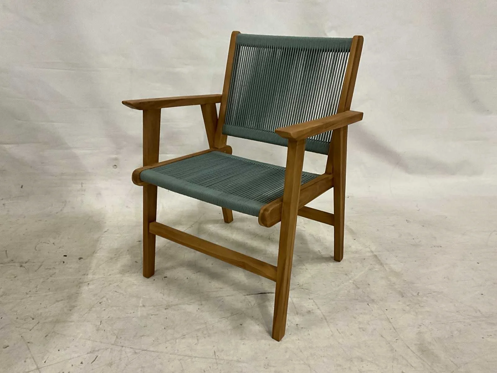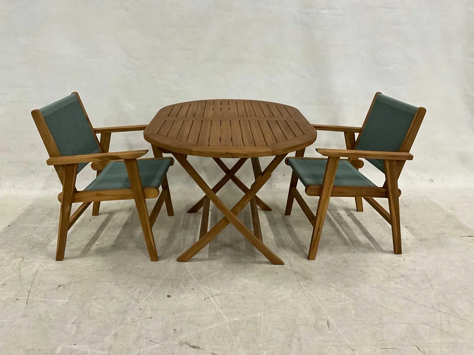 Tuinset bestaande uit ovale inklapbare tafel en twee stoelen Vorm: Ovaal Stoelen: 2 Kleur: Groen Lengte: 130cm Breedte: 90cm Hoogte: 76cm Materiaal: Teakhout en synthetische rope