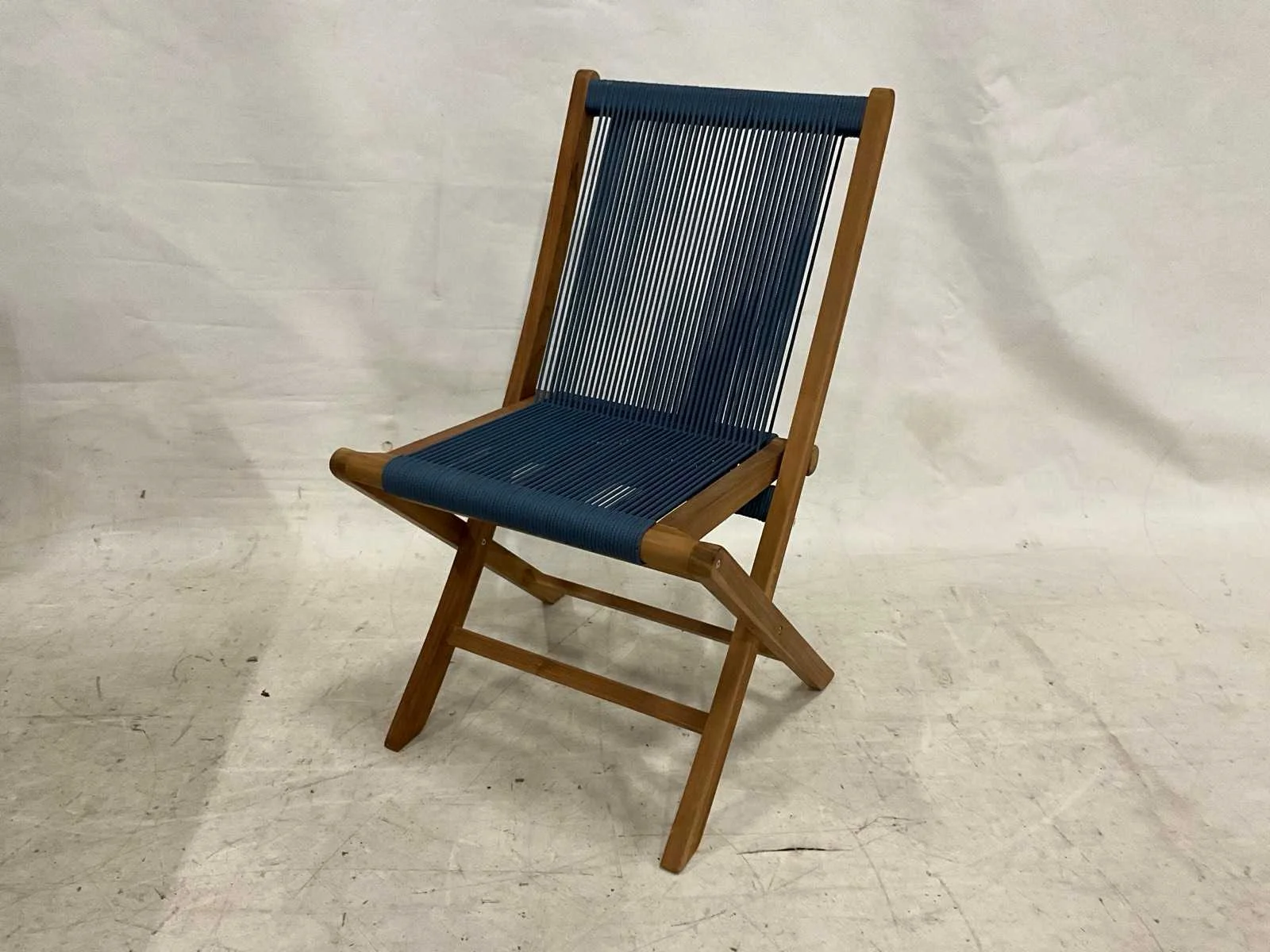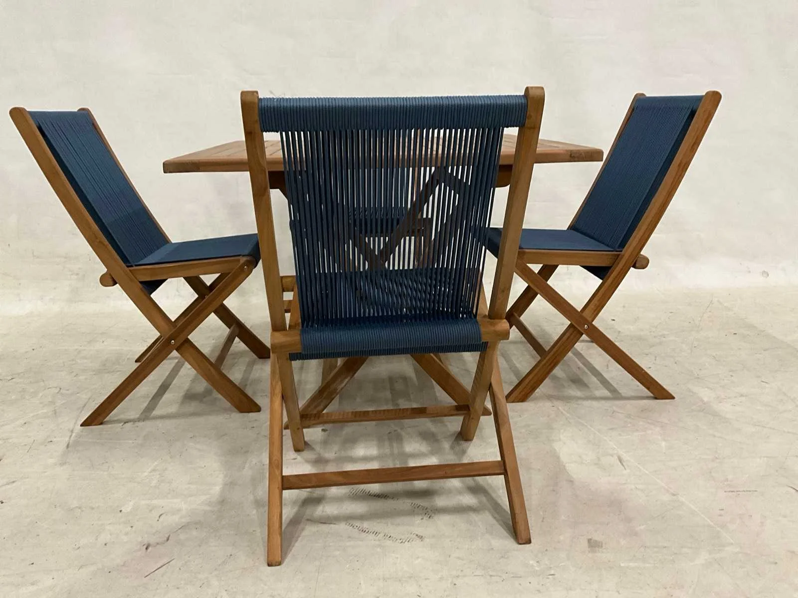 Teakhouten tuinset bestaande uit inklapbare tuintafel van 100x100 en 4 inklapbare stoelen. Vorm: Rond Stoelen: 4 Kleur: Staalblauw Lengte: 100cm Breedte: 100cm Hoogte: 76cm Materiaal: Teakhout en synthetische rope Zithoogte: 45