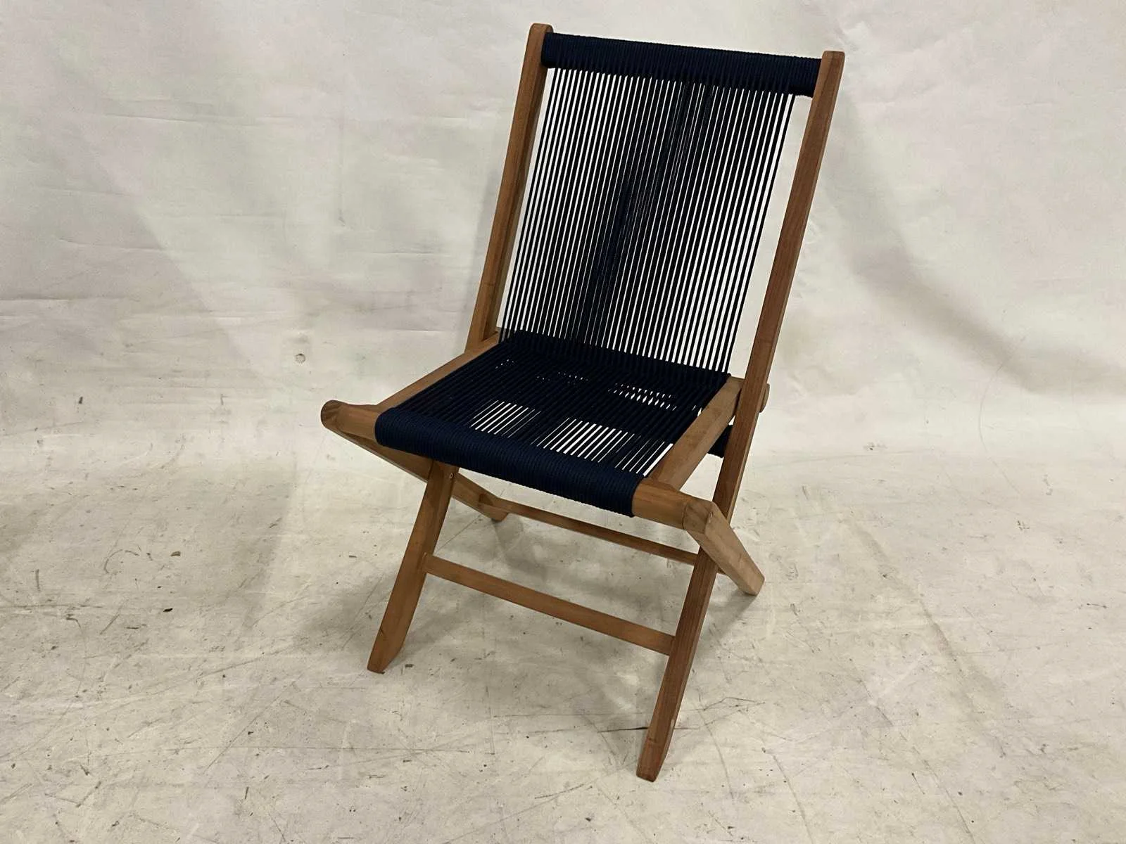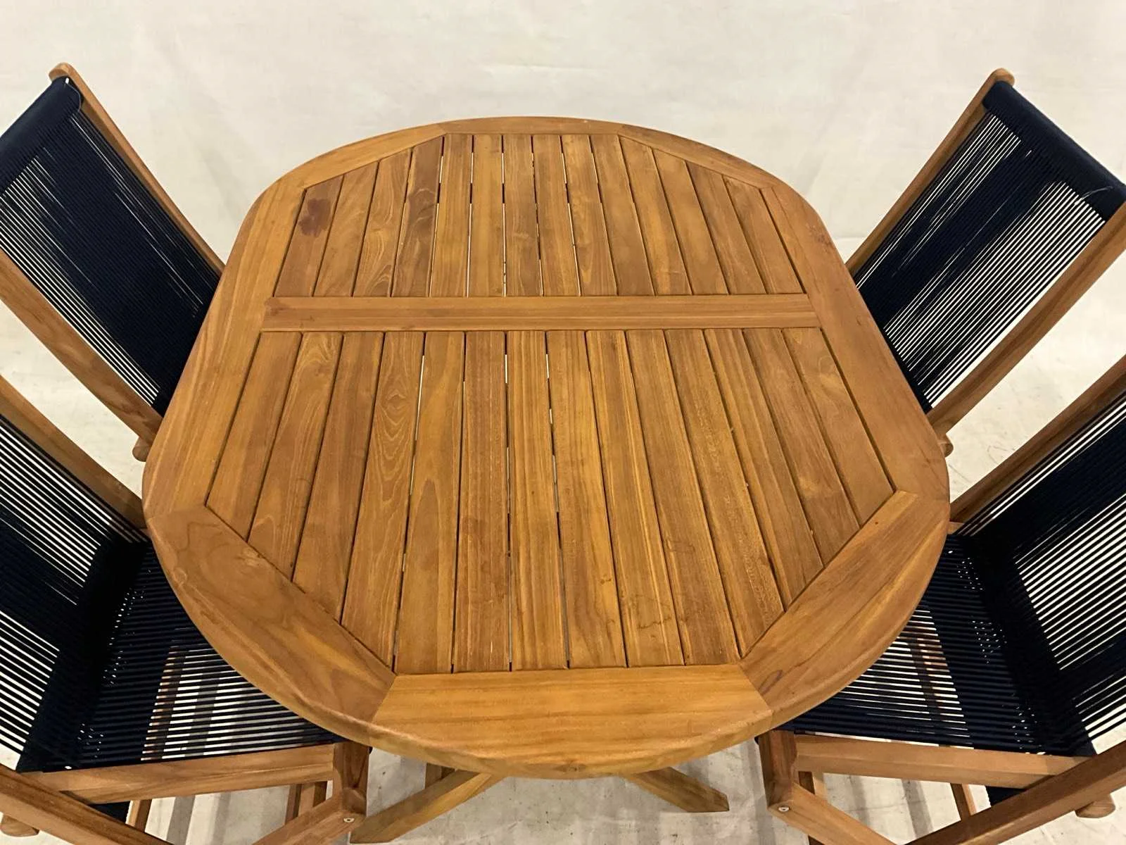 Tuinset bestaande uit ovale inklapbare tafel en 4 inklapbare stoelen Vorm: Ovaal Stoelen: 4 Kleur: Donker blauw Lengte: 130cm Breedte: 90cm Hoogte: 76cm Materiaal: Teakhout en synthetische rope