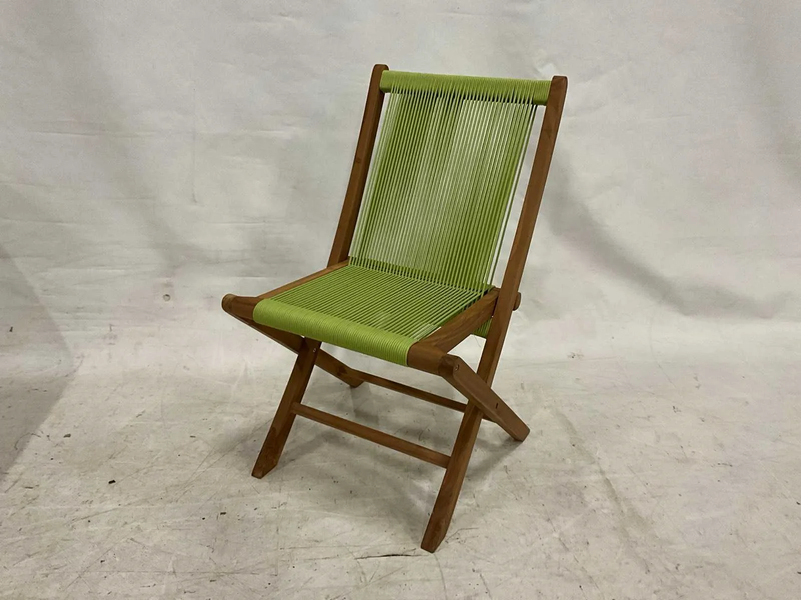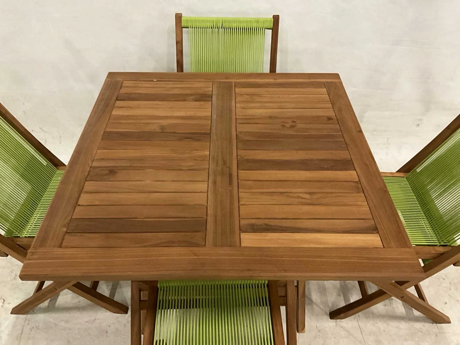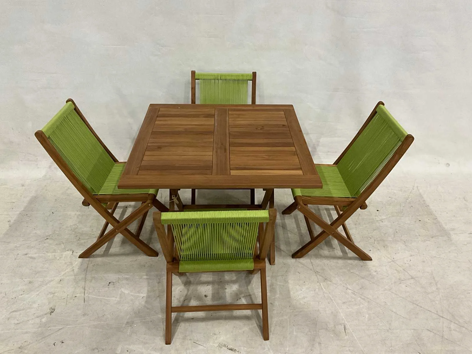 Teakhouten tuinset bestaande uit inklapbare tuintafel van 100x100 en 4 inklapbare stoelen. Vorm: Rond Stoelen: 4 Kleur: Groen Lengte: 100cm Breedte: 100cm Hoogte: 76cm Materiaal: Teakhout en synthetische rope Zithoogte: 45
