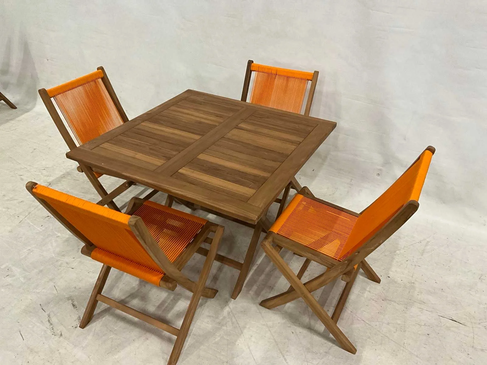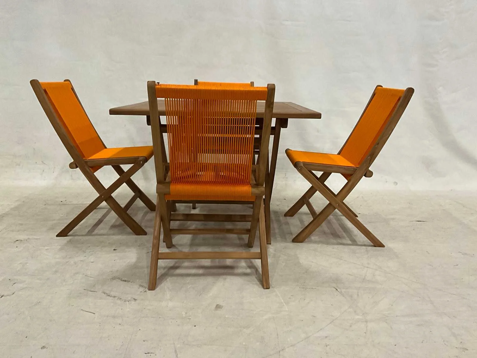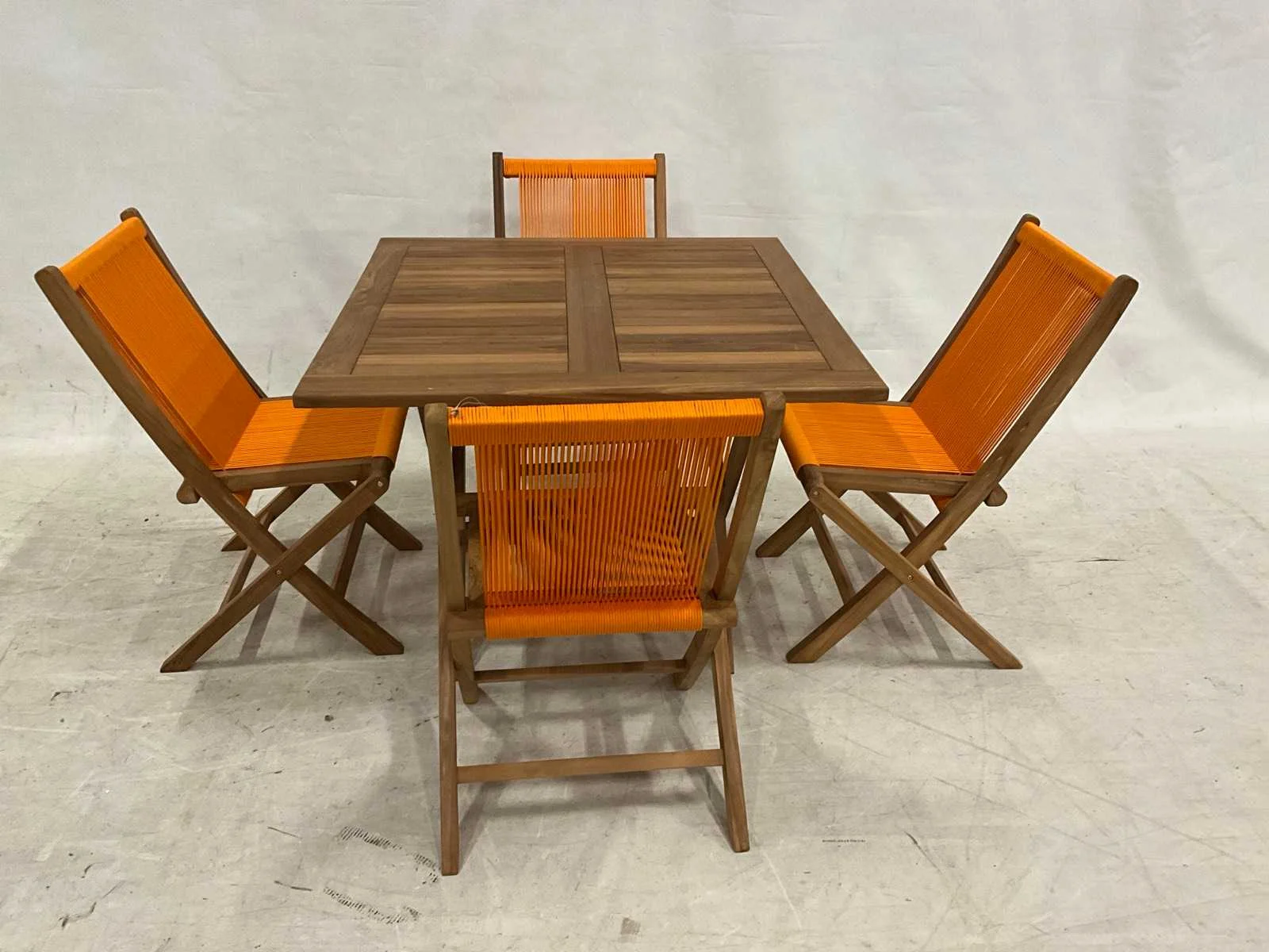 Teakhouten tuinset bestaande uit inklapbare tuintafel van 100x100 en 4 inklapbare stoelen. Vorm: Rond Stoelen: 4 Kleur: Oranje Lengte: 100cm Breedte: 100cm Hoogte: 76cm Materiaal: Teakhout en synthetische rope Zithoogte: 45