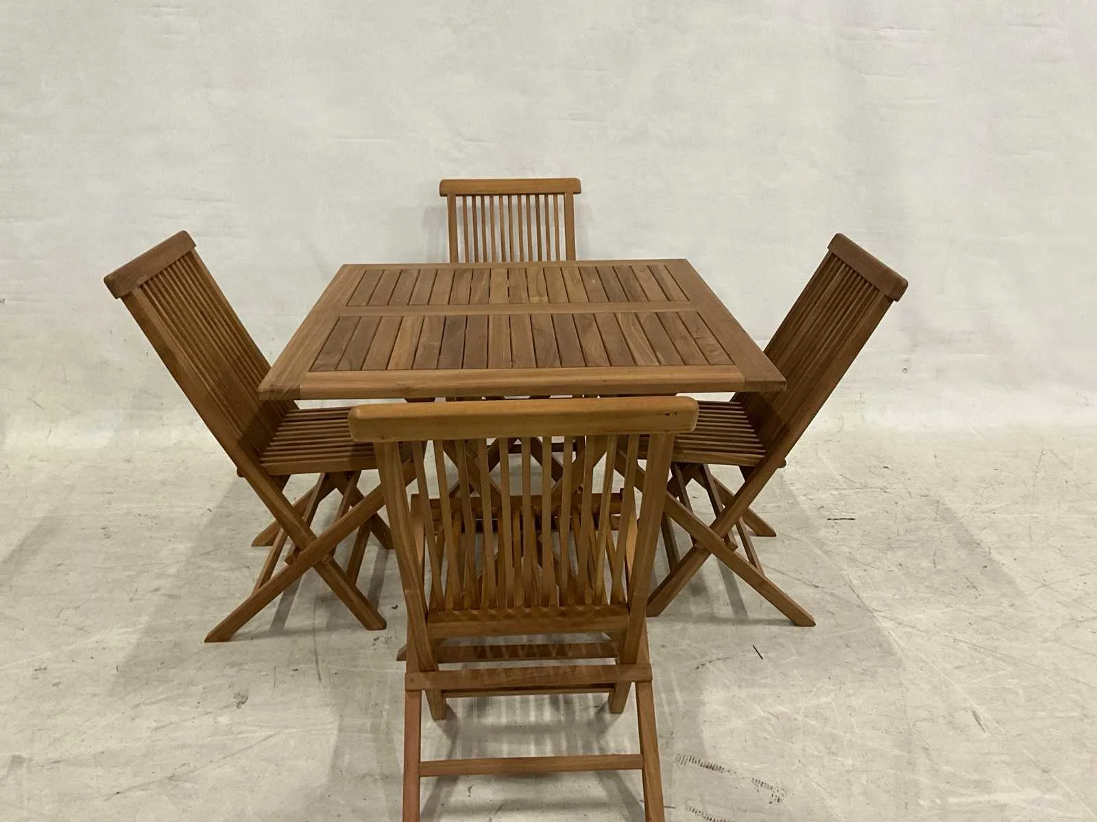 Teakhouten tuinset bestaande uit inklapbare tuintafel van 100x100 en 4 inklapbare stoelen. Vorm: Vierkant Stoelen: 4 Lengte: 100cm Breedte: 100cm Hoogte: 76cm Materiaal: Teakhout Zithoogte: 45