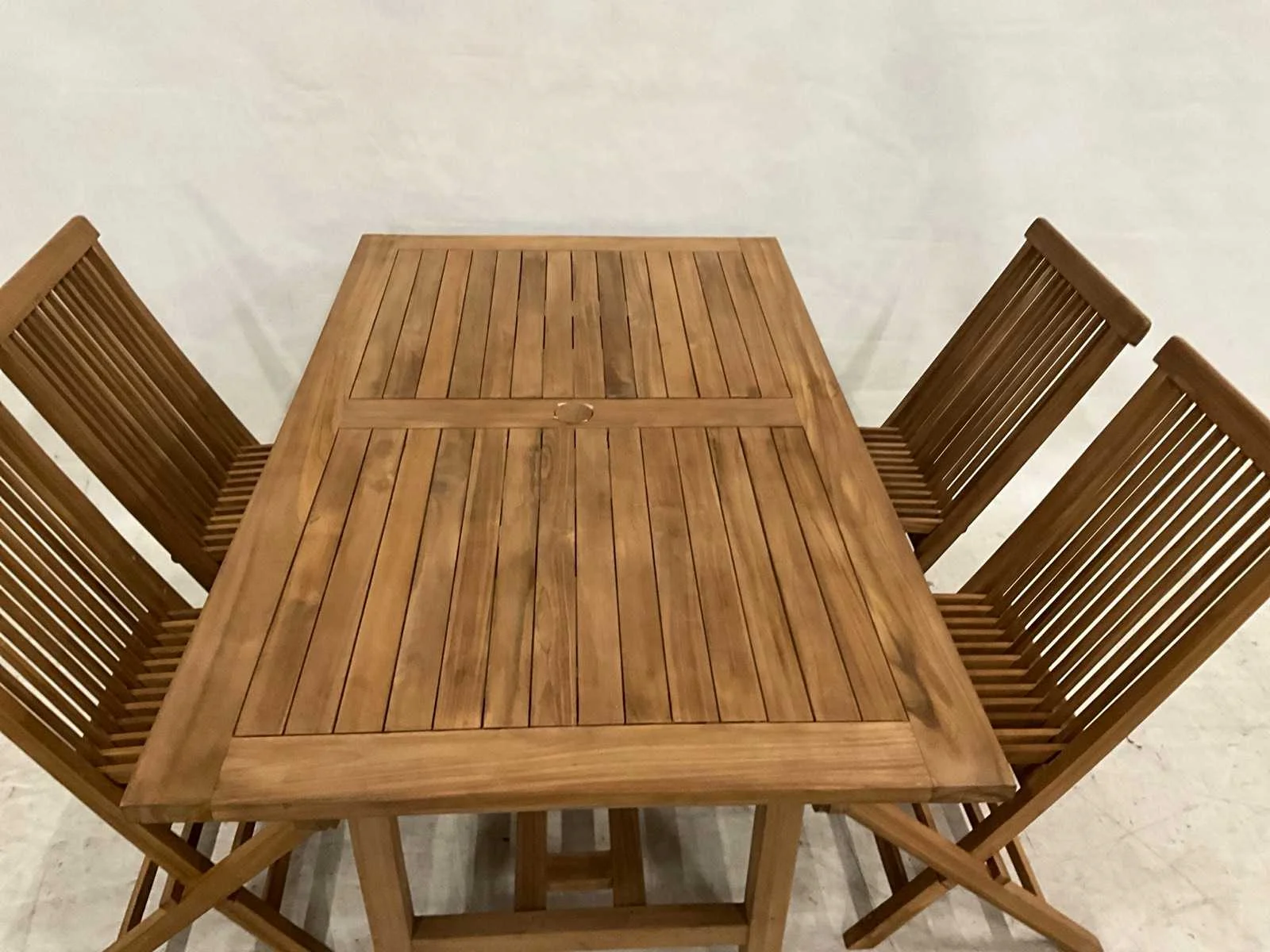 Teakhouten tuinset bestaande uit een tafel van 150x90 en 4 inklapbare tuinstoelen Vorm: Rechthoek Stoelen: 4 Lengte: 150cm Breedte: 90cm Hoogte: 76cm Materiaal: Teakhout Zithoogte: 45