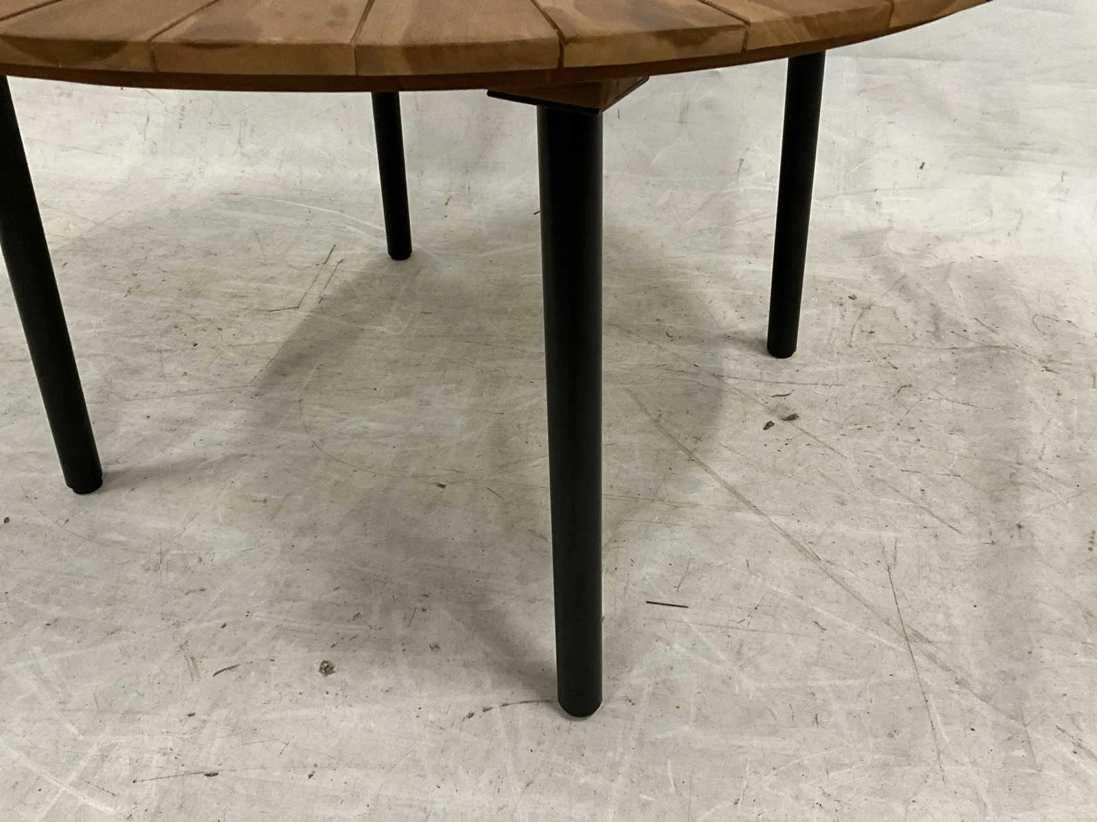 Ronde teakhouten tuintafel van 130 cm doorsnede, met zwarte poten Vorm: Rond Lengte: 130cm Breedte: 130cm Hoogte: 76cm Materiaal: Teakhout en aluminium