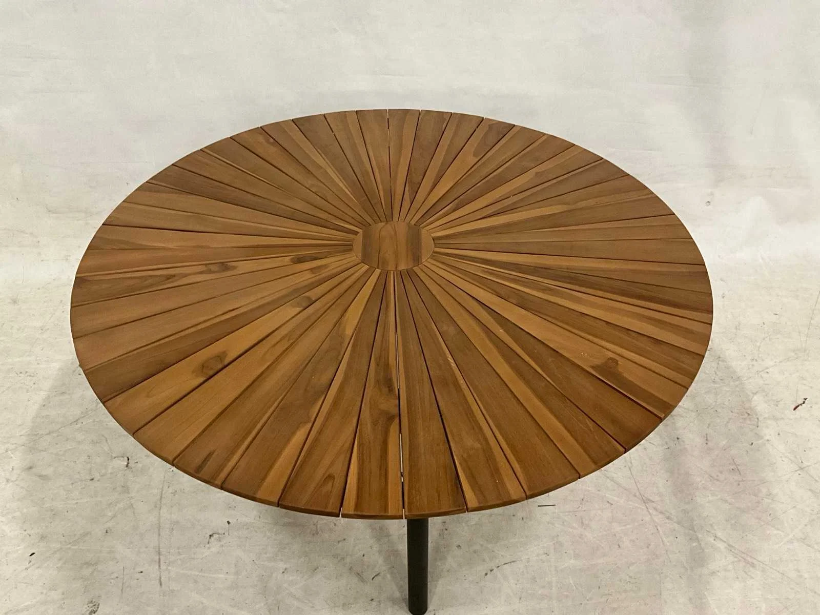 Ronde teakhouten tuintafel van 150 cm doorsnede, zwarte aluminium poten Vorm: Rond Lengte: 150cm Breedte: 150cm Hoogte: 76cm Materiaal: Teakhout en aluminium