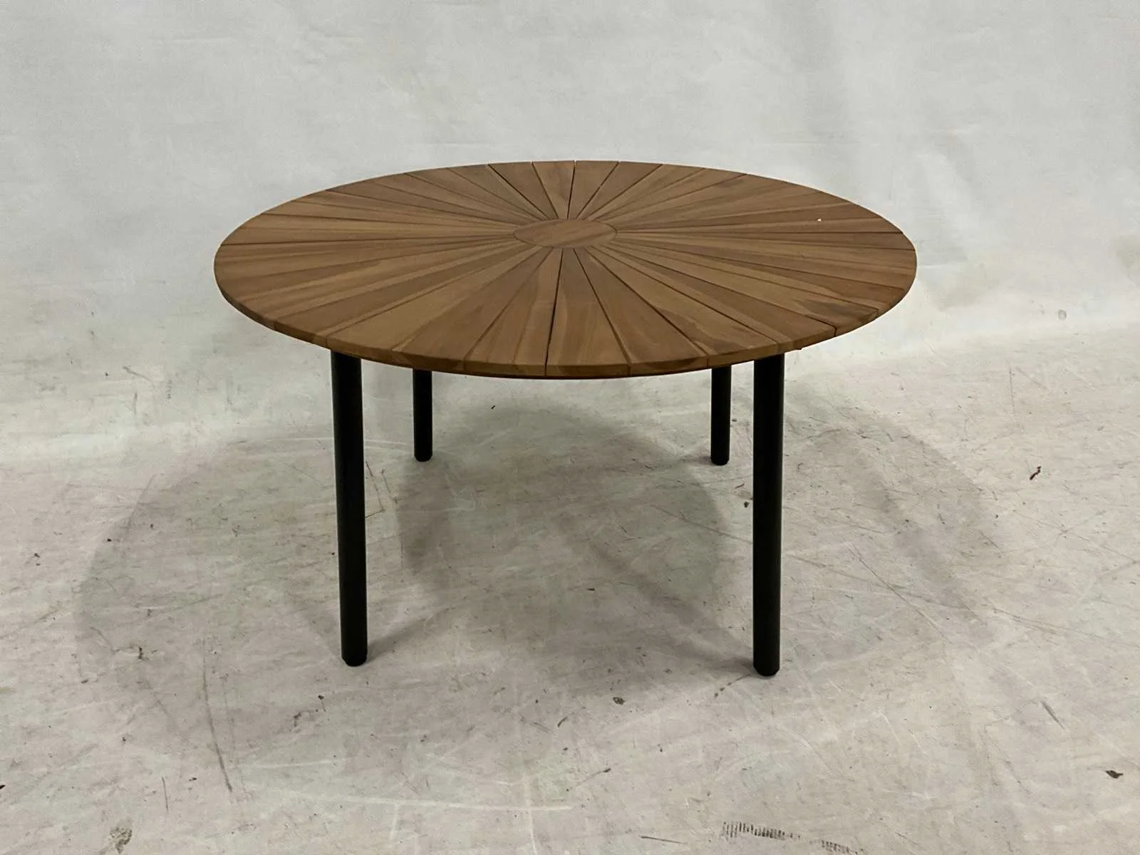 Ronde teakhouten tuintafel van 130 cm doorsnede, met zwarte poten Vorm: Rond Lengte: 130cm Breedte: 130cm Hoogte: 76cm Materiaal: Teakhout en aluminium