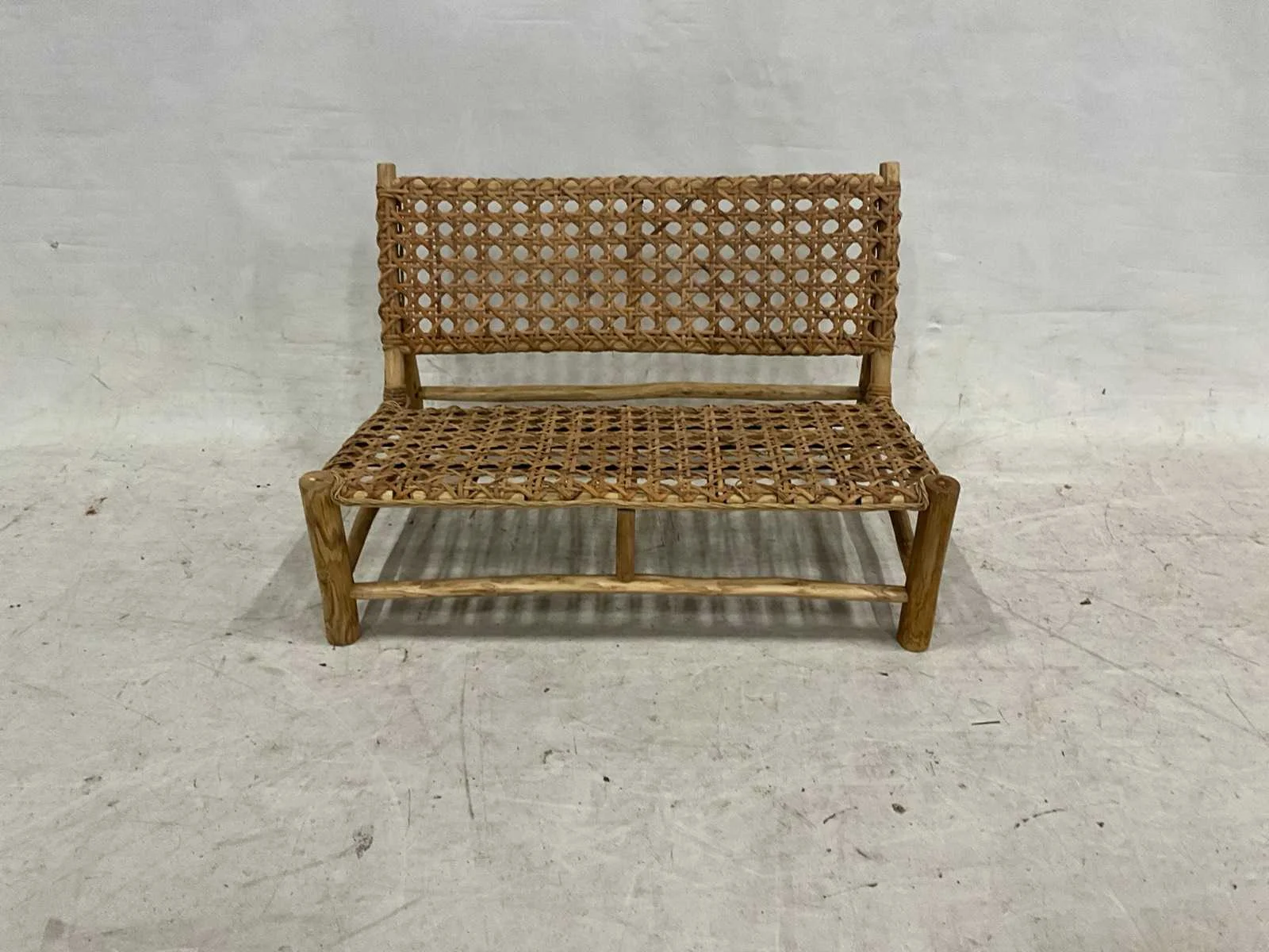 Tuinbank geschikt voor patio of tuinhuis. Breedte: 115cm Hoogte: 75cm Zithoogte: 35 Diepte: 70 Materiaal: Teakhout en rotan