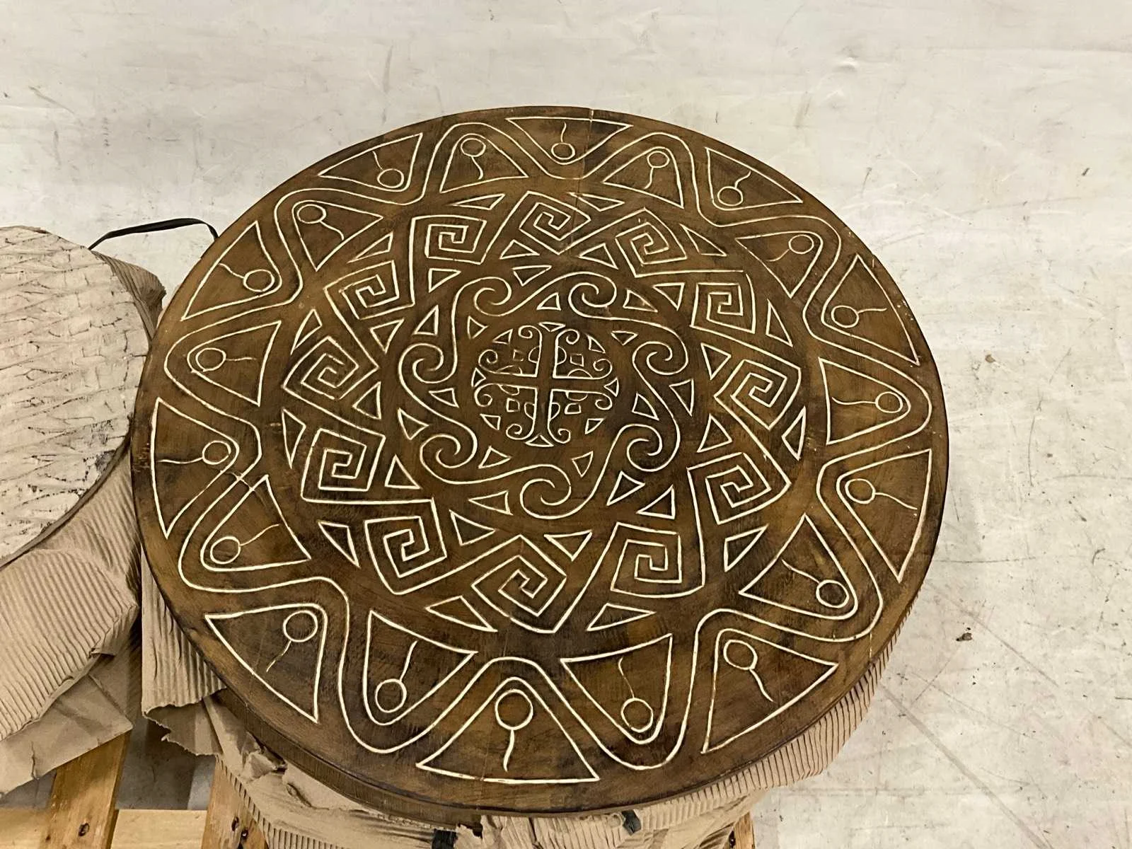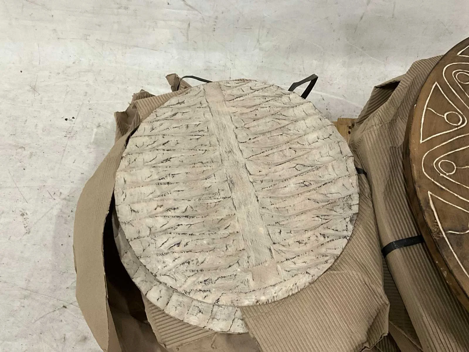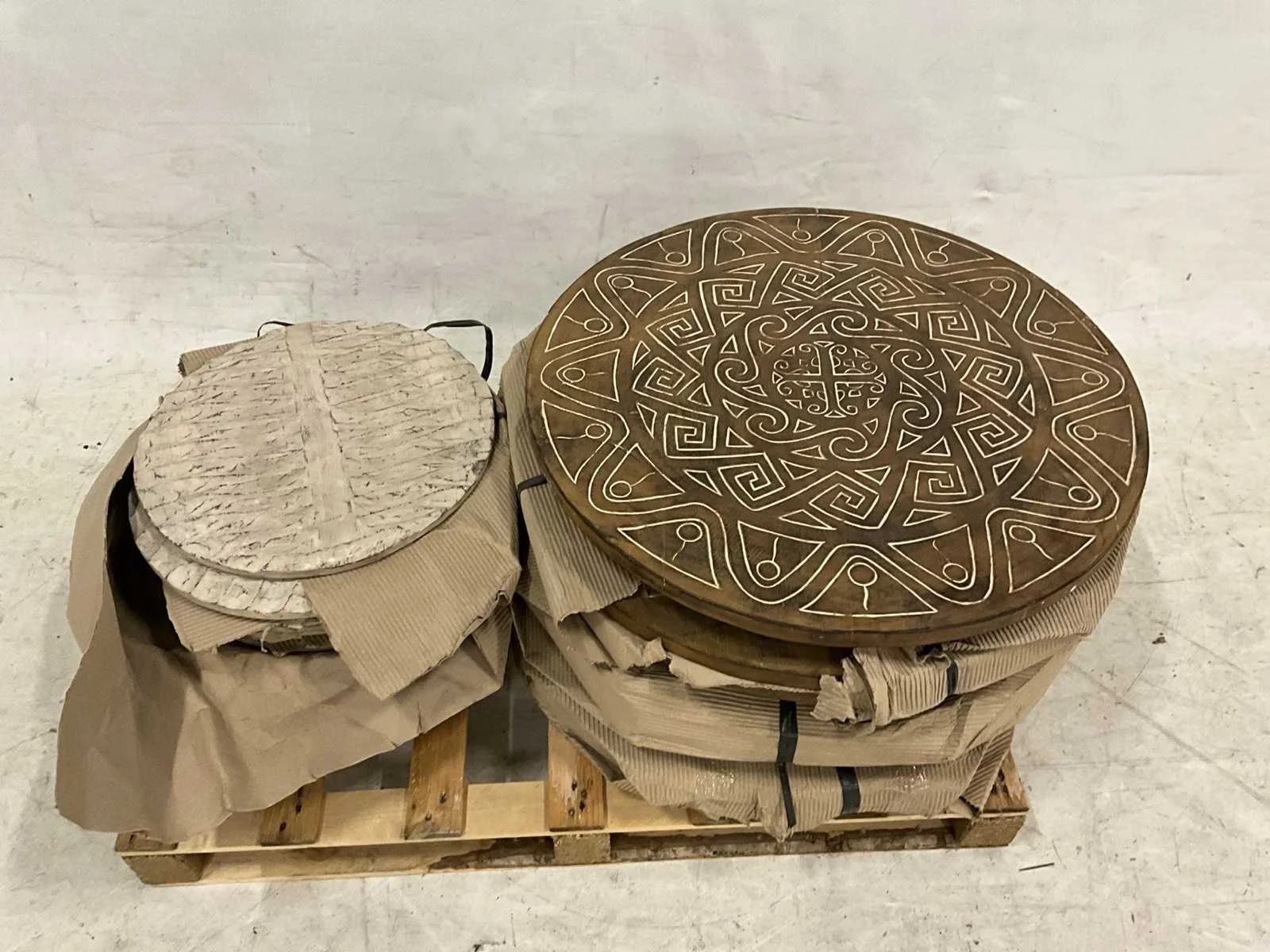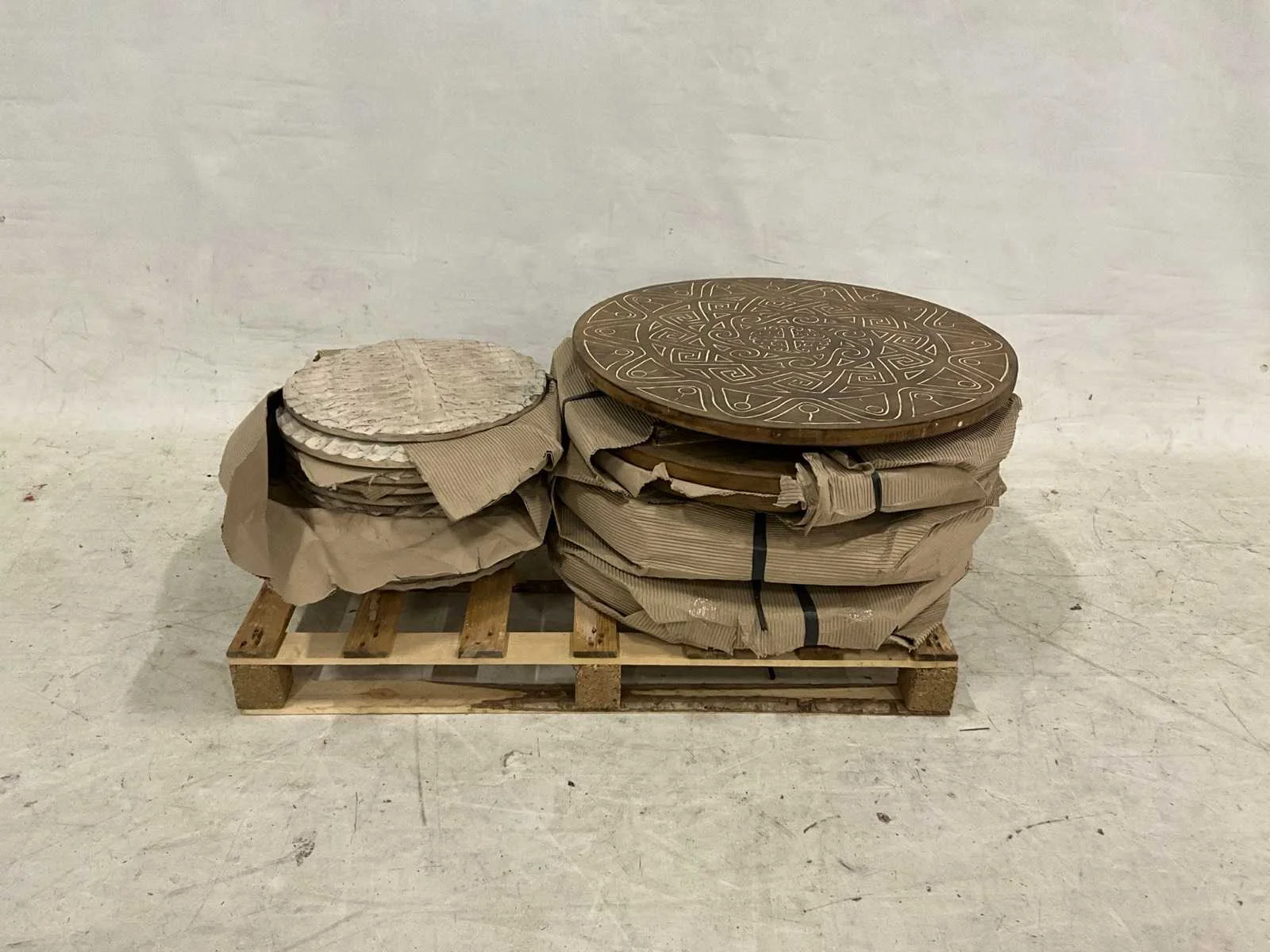 17 stuks Wandpanelen van 80 en 50 cm doorsnede . Kleur: Bruin en whitewash Lengte: 80cm Breedte: 80cm Materiaal: Suarhout