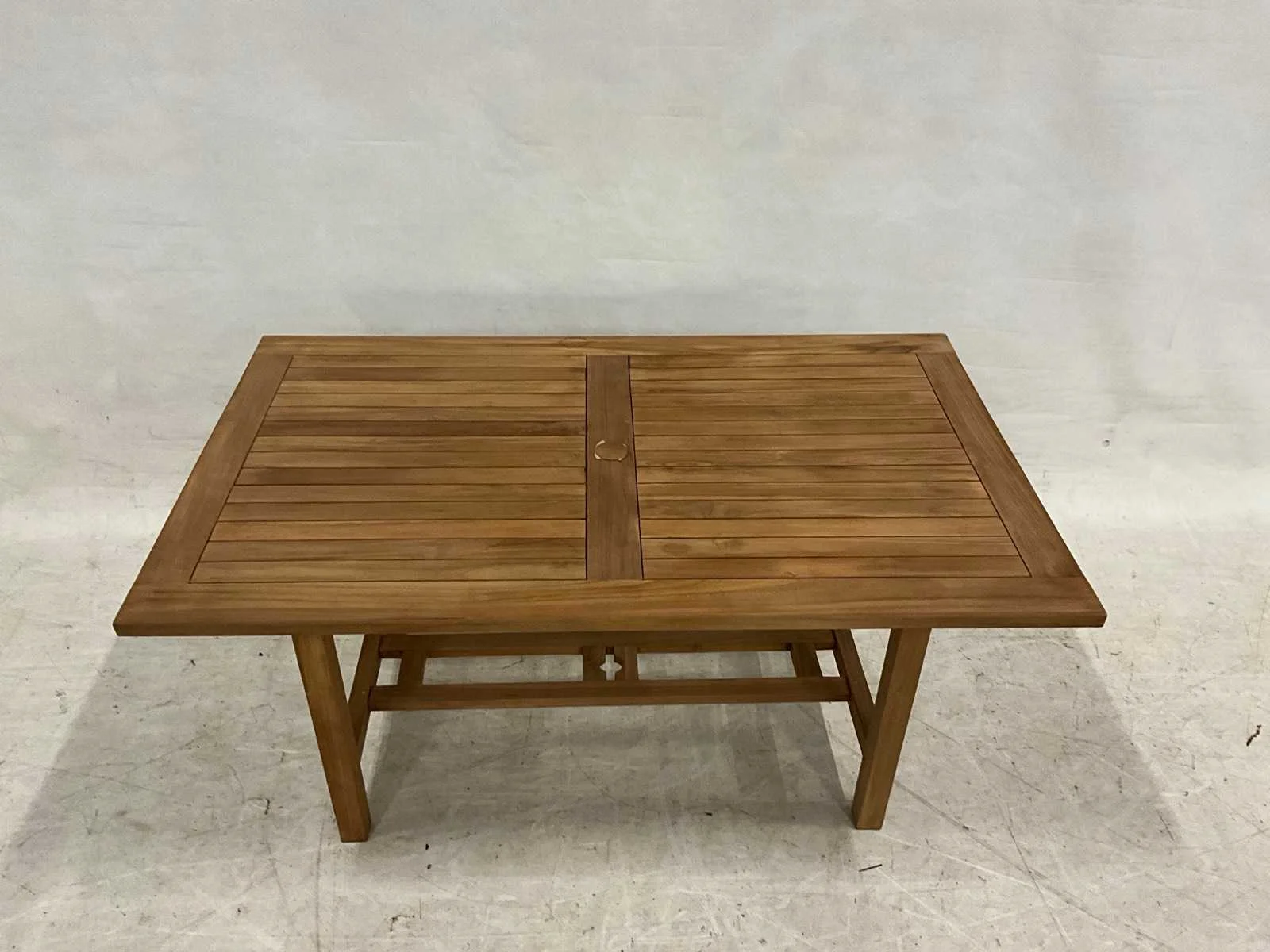 Teakhouten tafel van 150x90 cm met parasol gat. Vorm: Rechthoek Lengte: 150cm Breedte: 90cm Hoogte: 76cm Materiaal: Teakhout