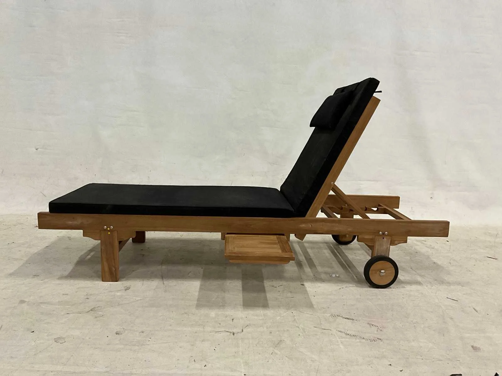 Ligbed in 3 standen verstelbaar, met een zwart kussen en verrijdbaar Kussens: true Verstelbaar: true Kleur: Zwart Lengte: 200cm Breedte: 65cm Hoogte: 35cm Materiaal: Teakhout