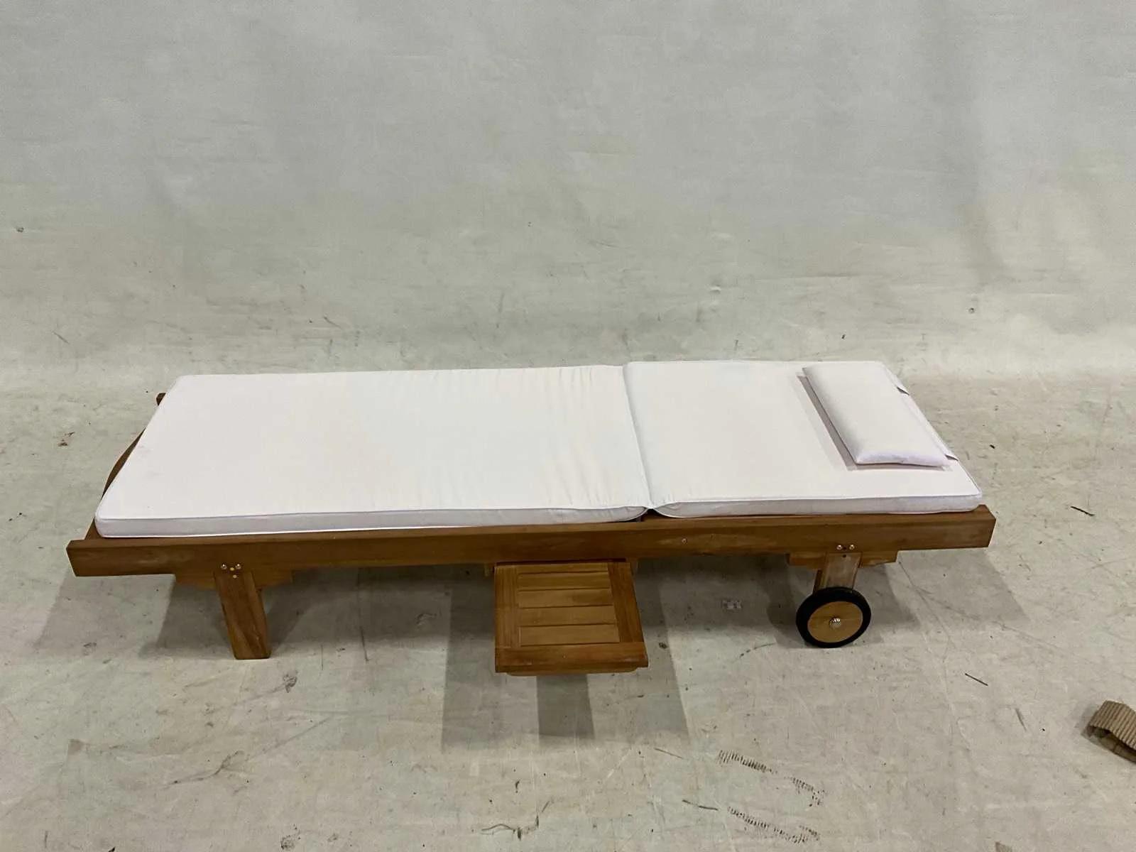 Ligbed in 3 standen verstelbaar, met een wit kussen en verrijdbaar Kussens: true Verstelbaar: true Kleur: Wit Lengte: 200cm Breedte: 65cm Hoogte: 35cm Materiaal: Teakhout