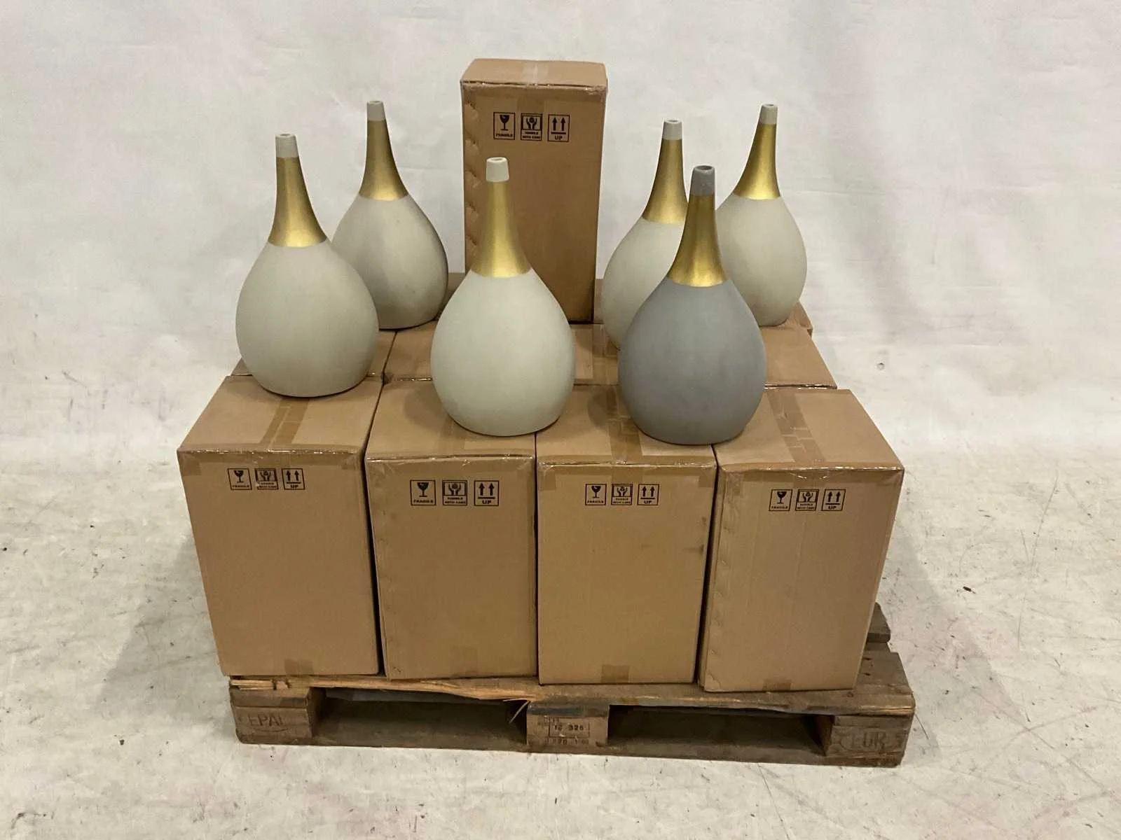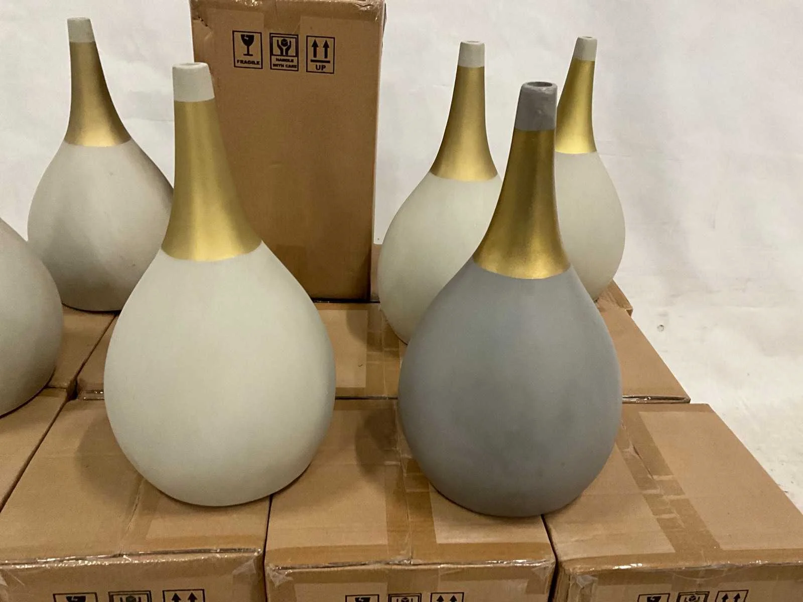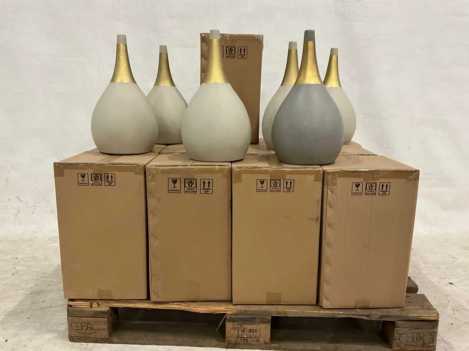 Partij vaasjes, in twee tinten grijs. Kleur: Grijs - Goud Lengte: 25cm Breedte: 25cm Hoogte: 40cm Materiaal: Fibercement