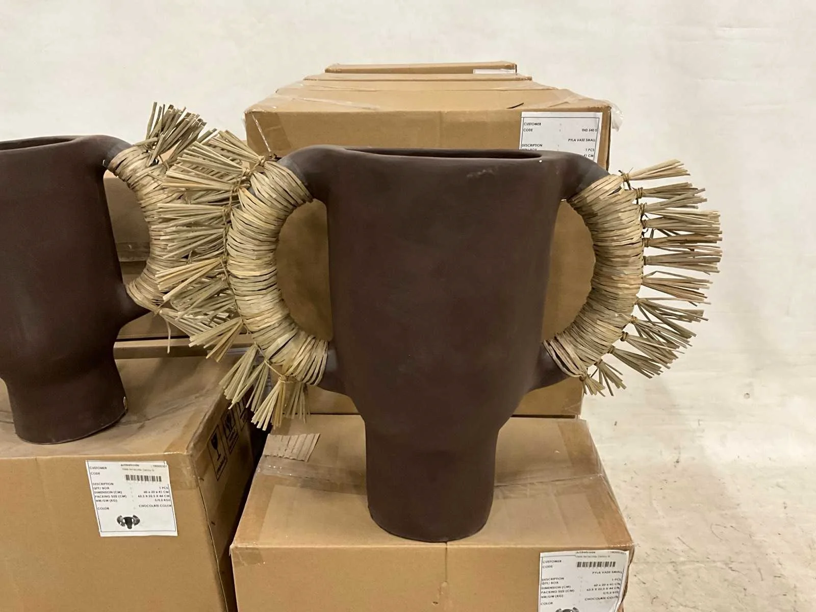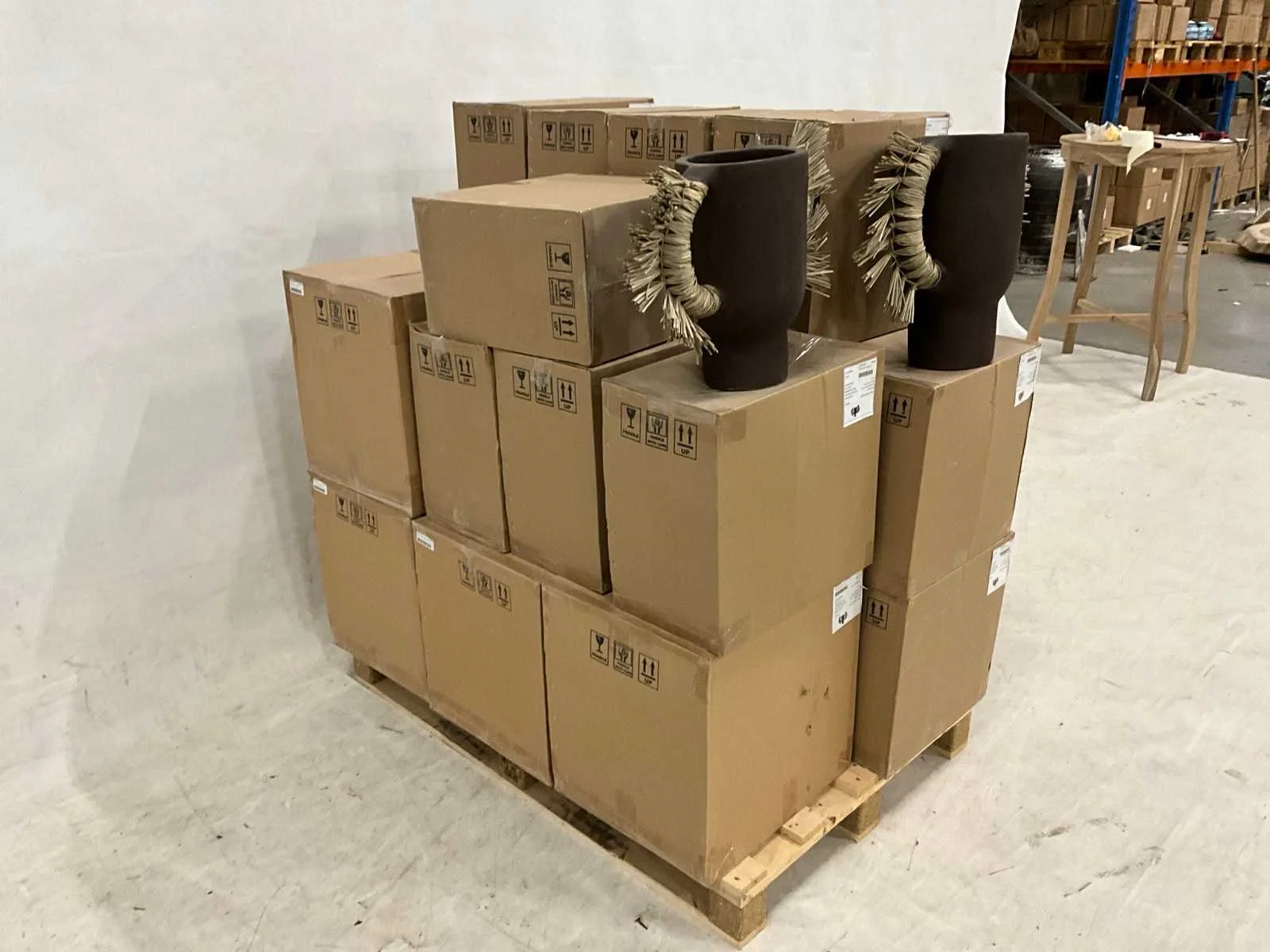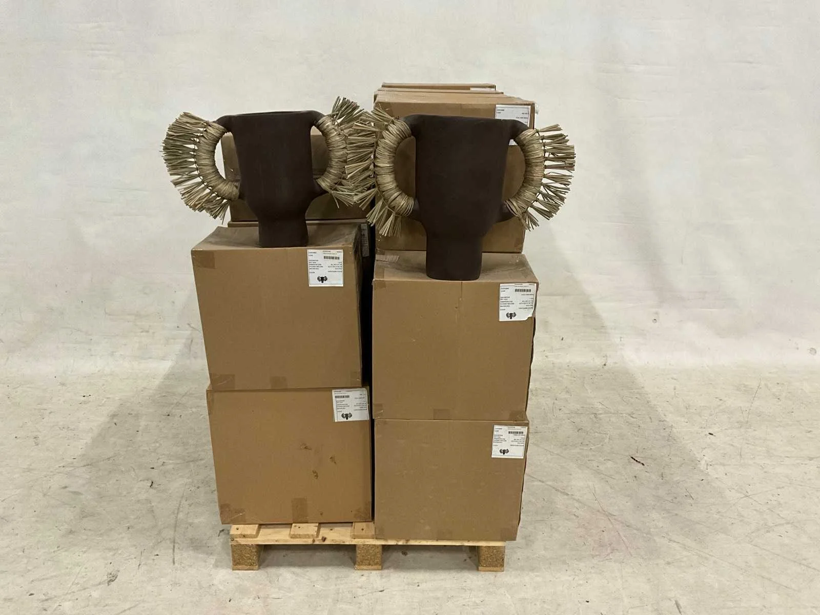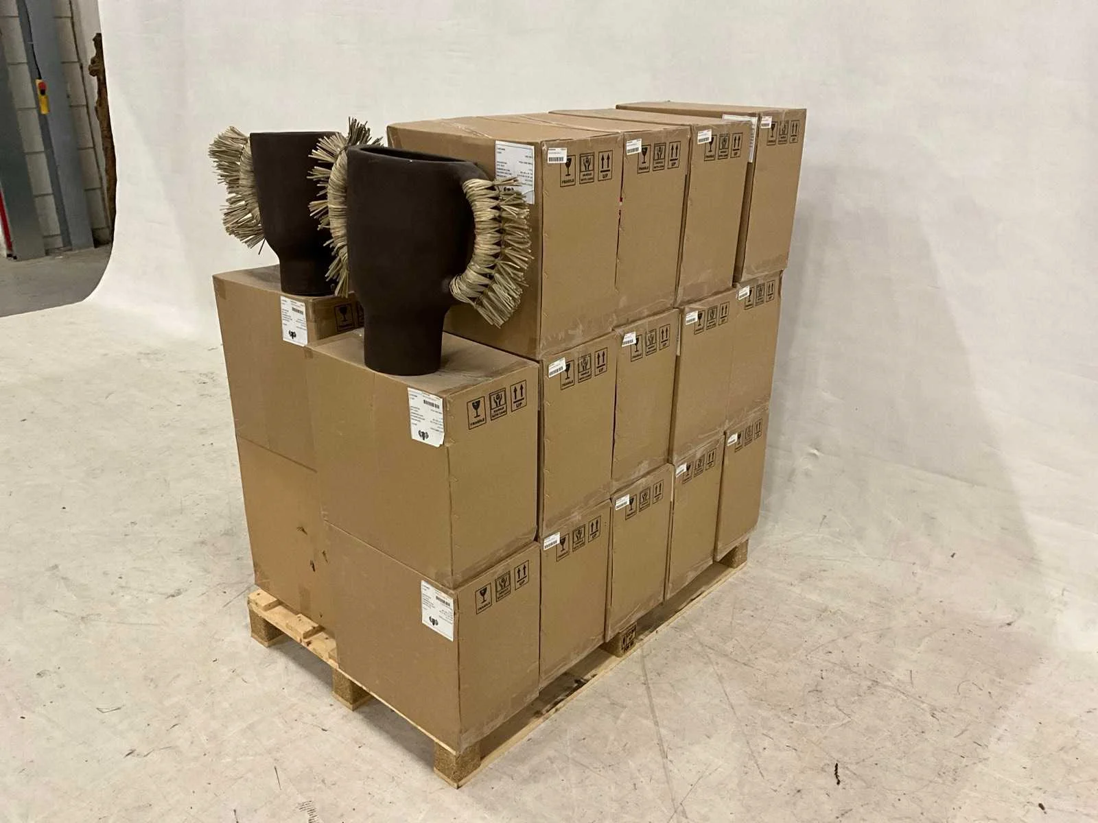 Partij vaasjes, in twee maten. 5x L en 19x S Kleur: Grijs - Goud Lengte: 25cm Breedte: 40cm Hoogte: 40cm Materiaal: Fibercement