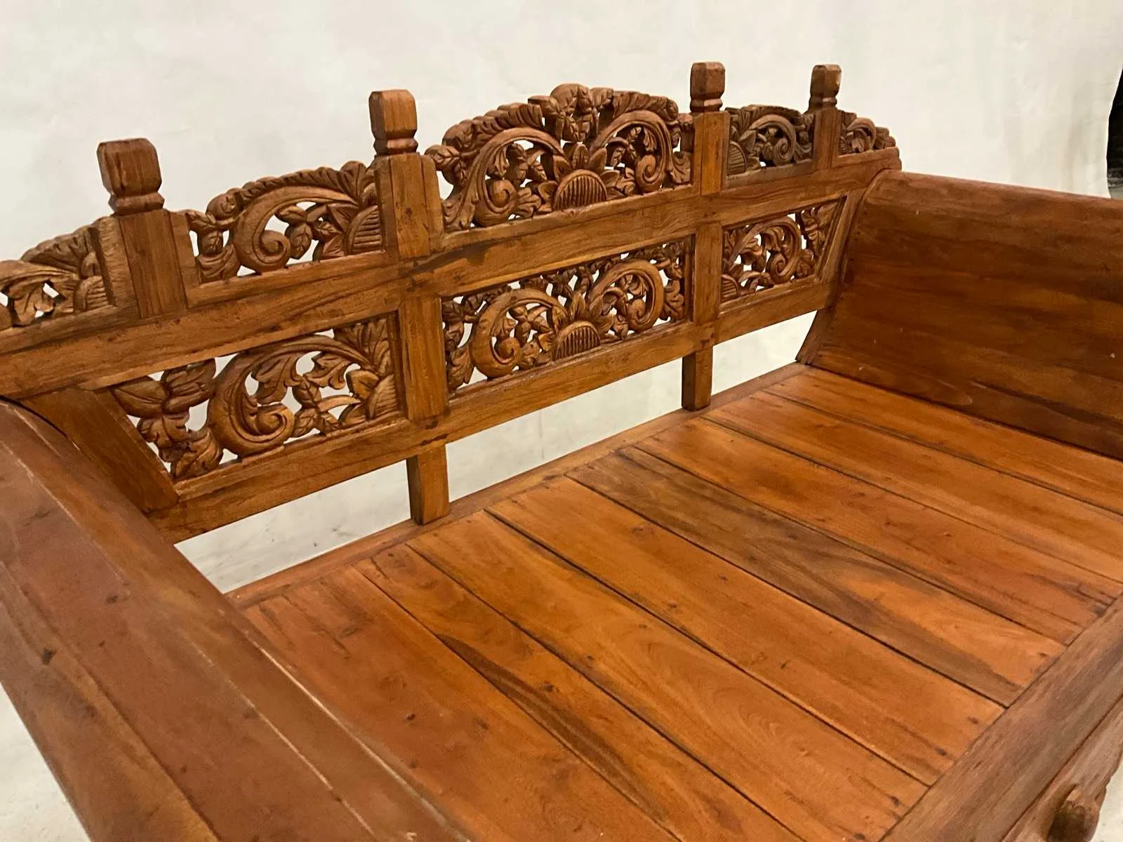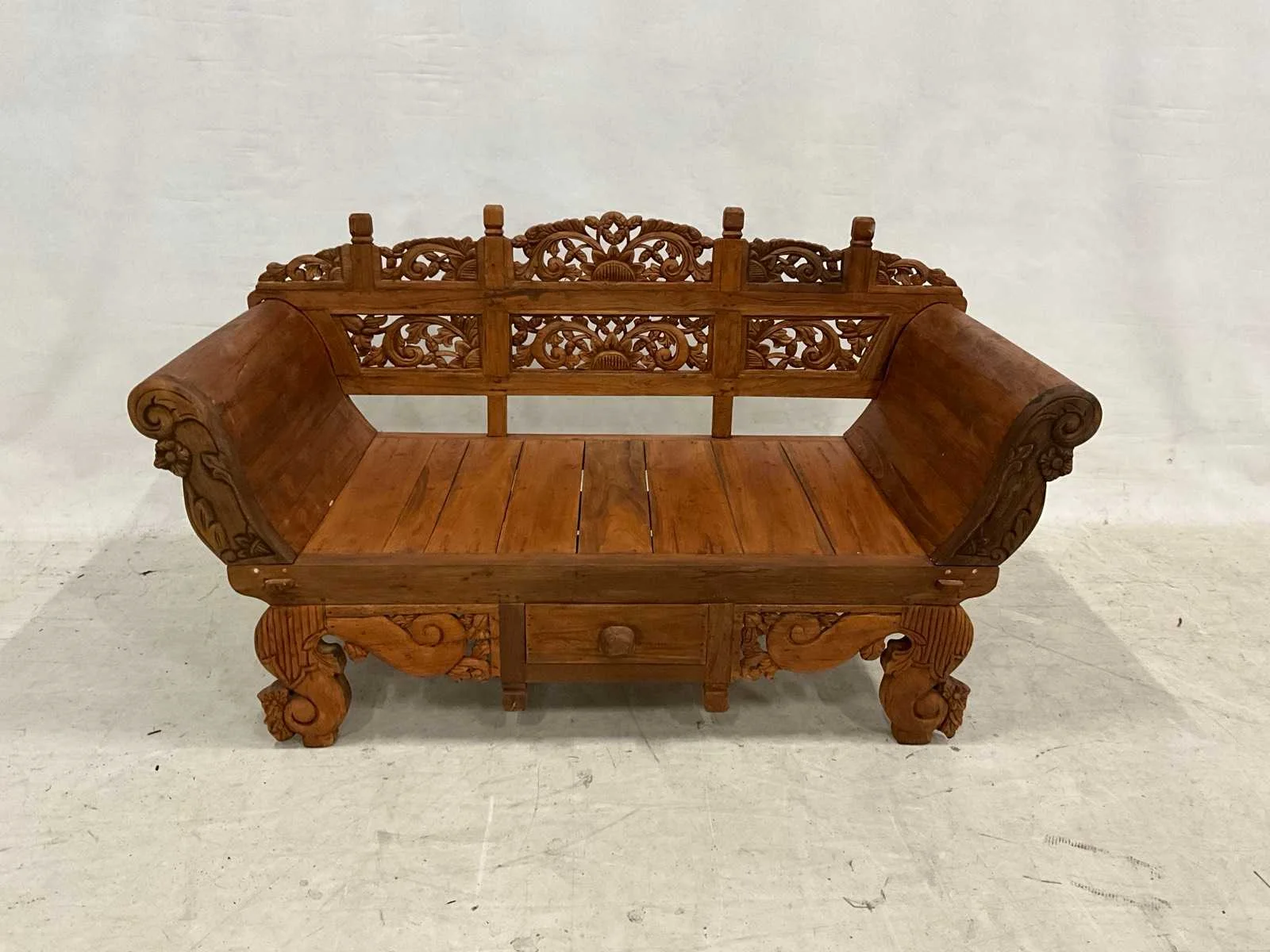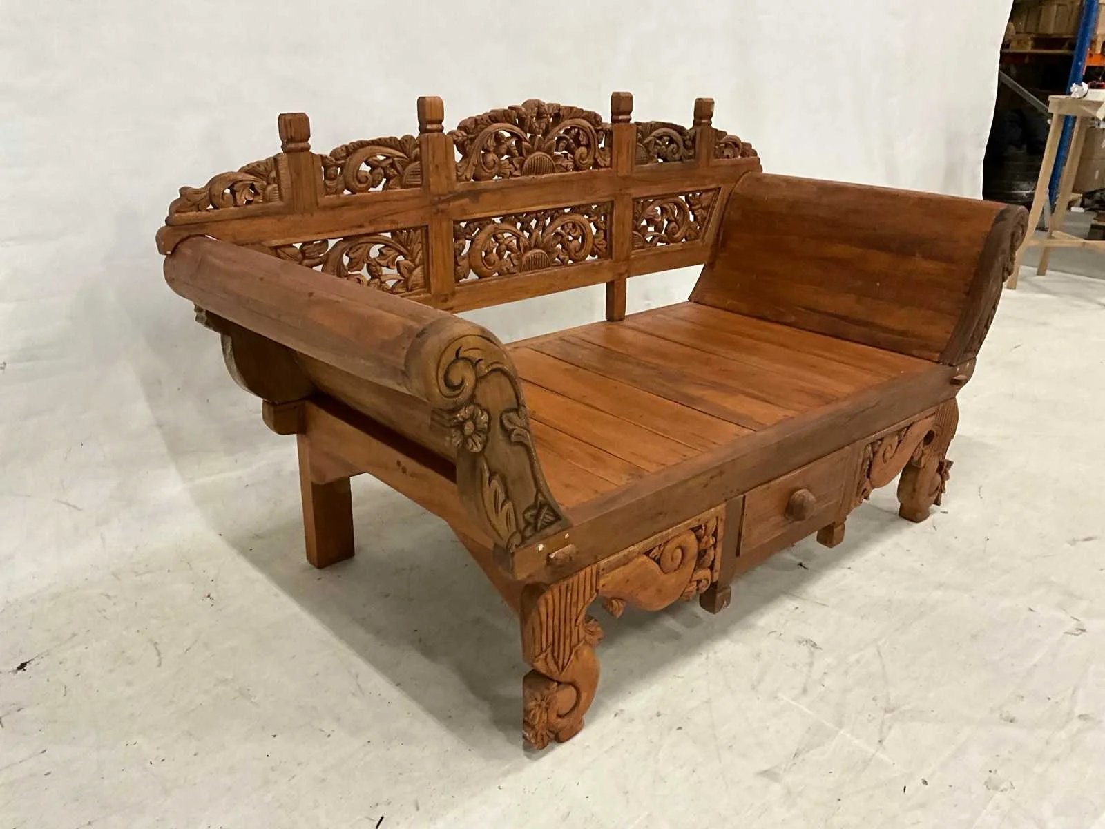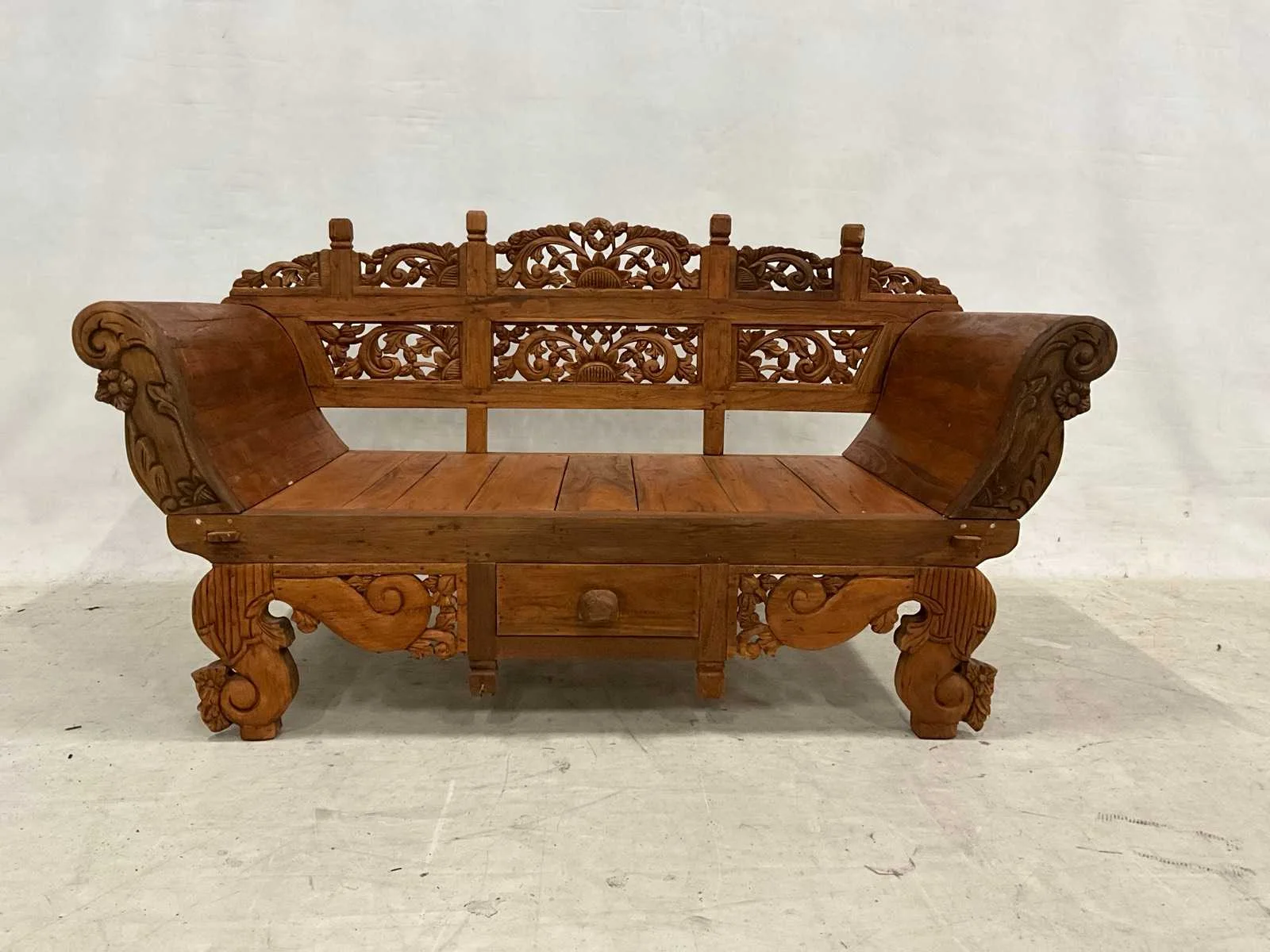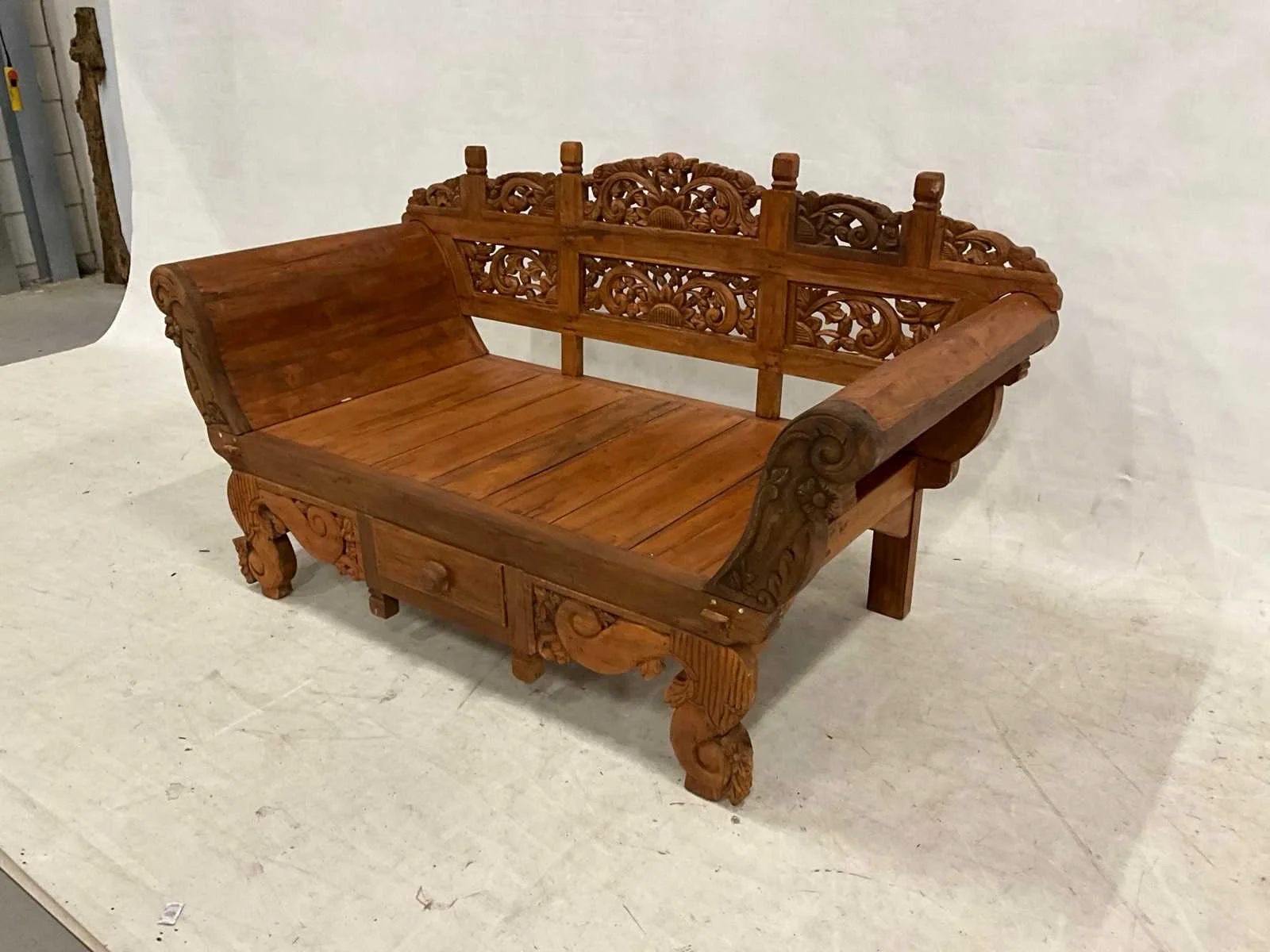 Rustieke tuinbank met lade en houtsnijwerk van 200 cm geschikt voor Patio of tuinhuis. Breedte: 200cm Hoogte: 110cm Zithoogte: 46 Diepte: 90 Materiaal: Recycled teakhout