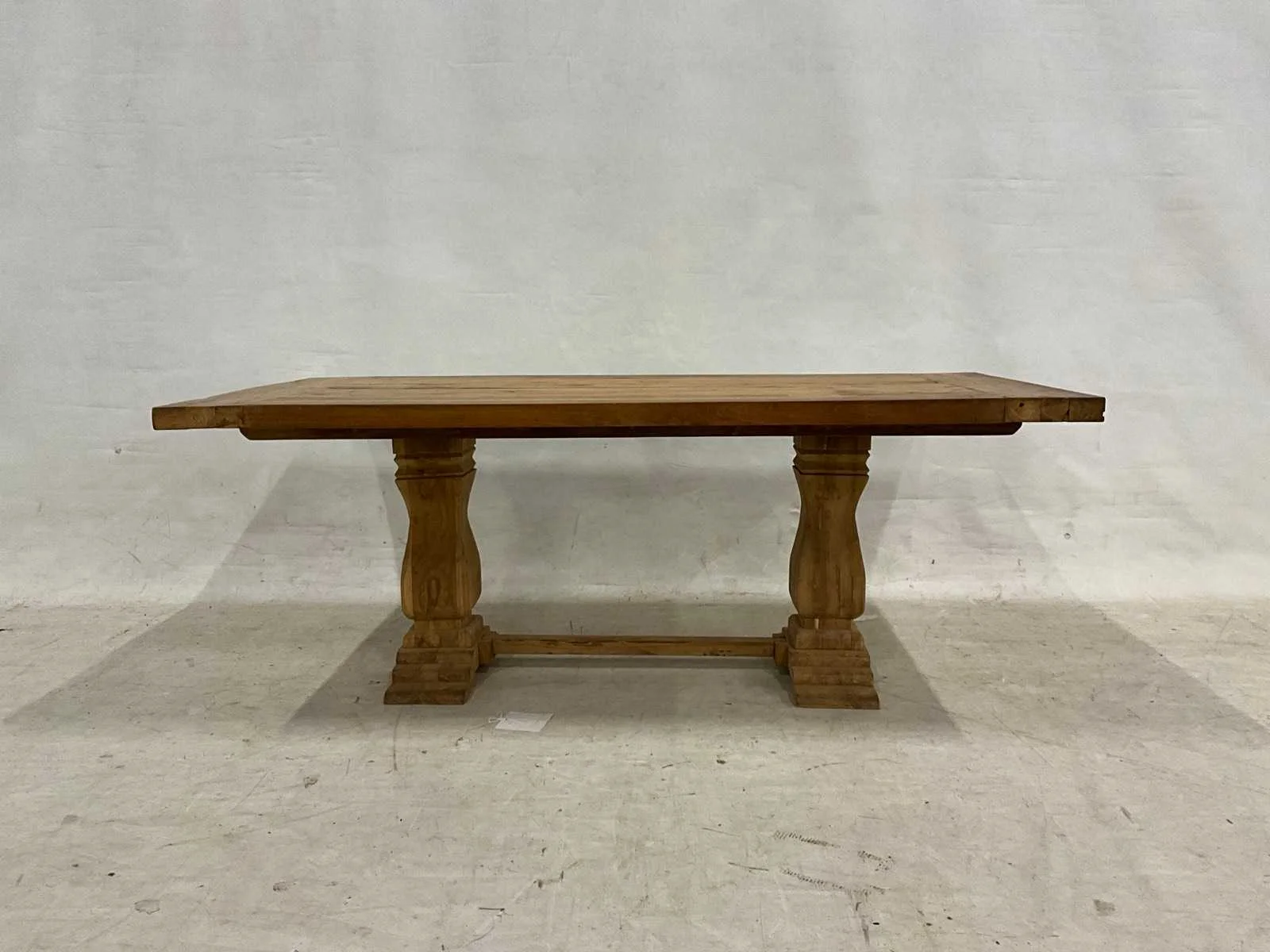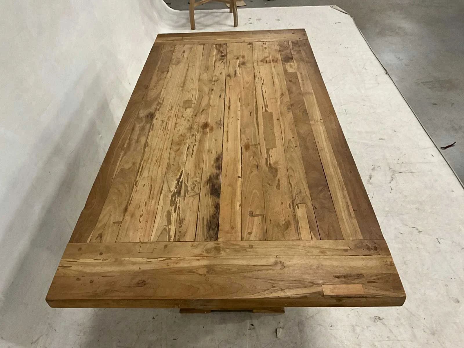 Showmodel kasteeltafel van 200 cm Vorm: Rechthoek Lengte: 200cm Breedte: 10cm Hoogte: 76cm Materiaal: Recycled teakhout