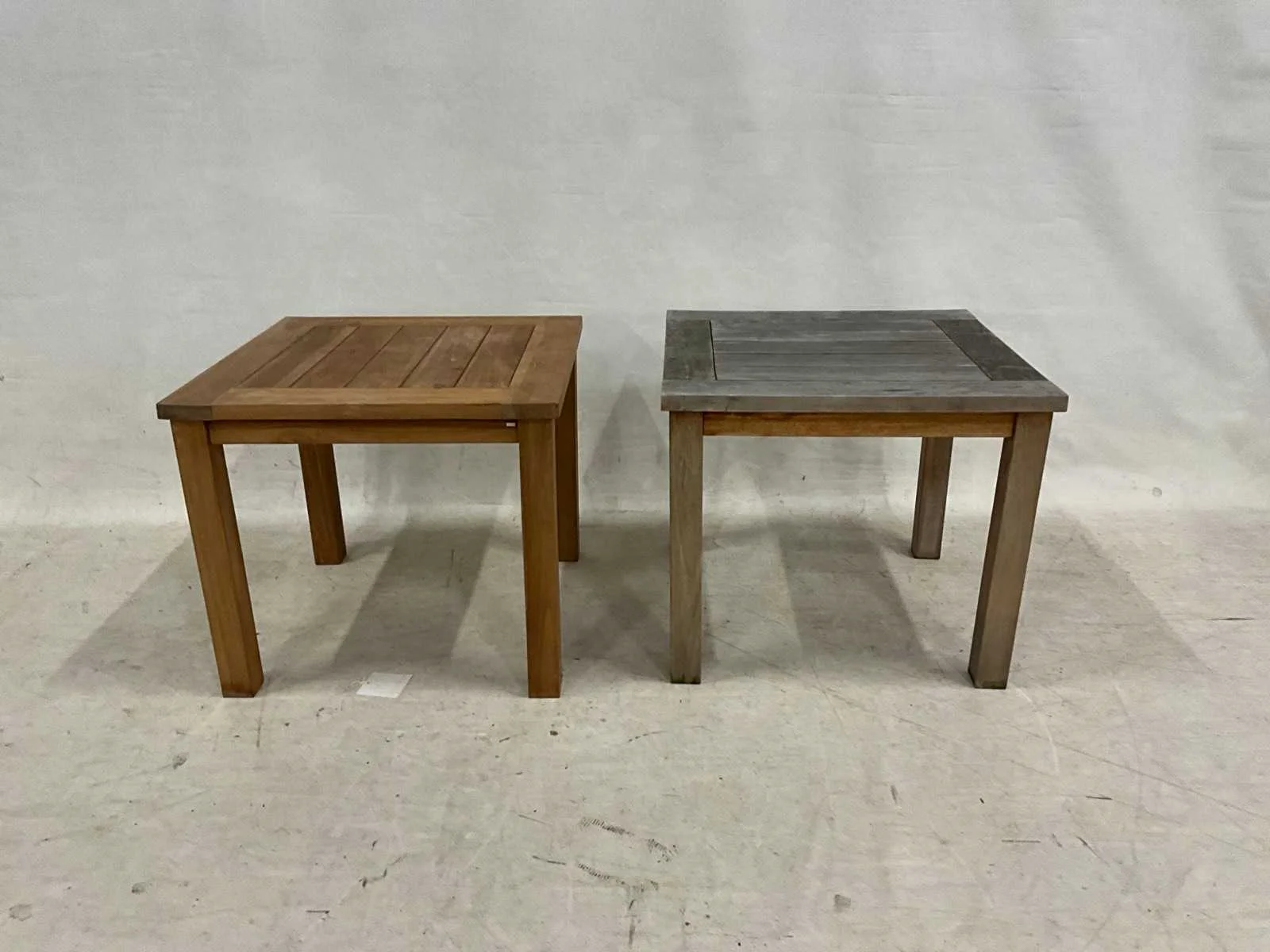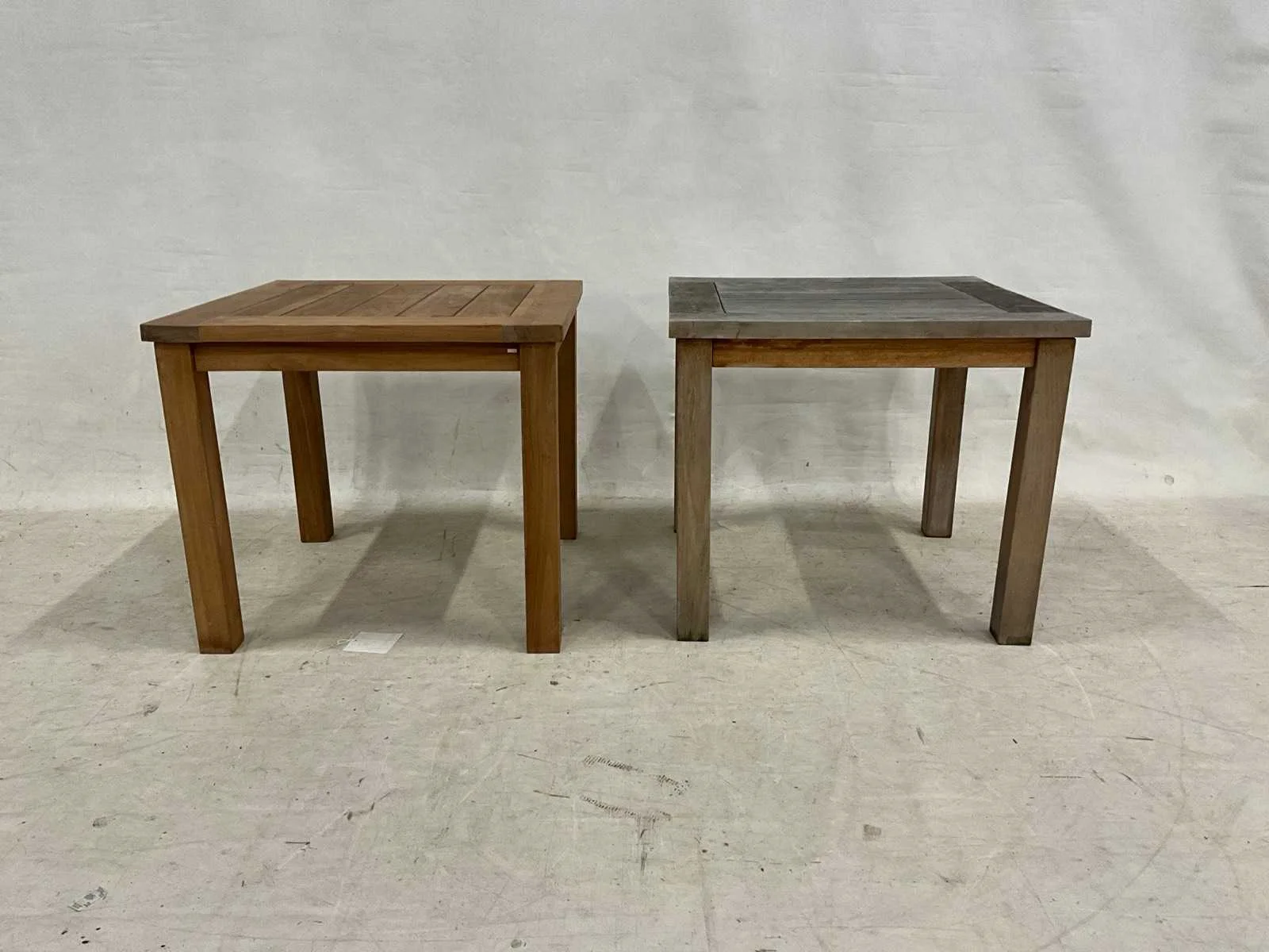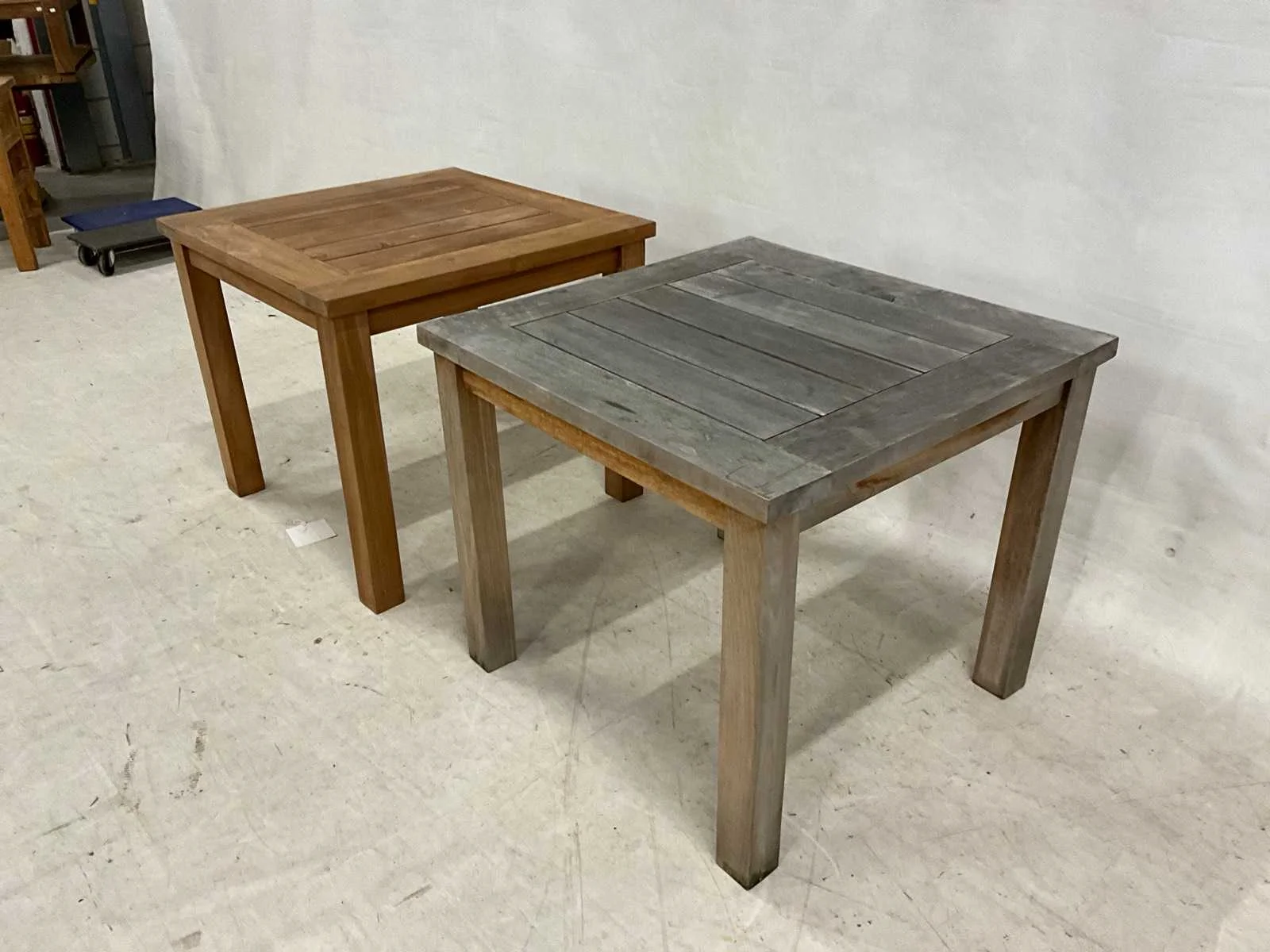 2x B-Keus / gebruikte tuintafel van 90x90x76 cm. Lengte: 90cm Breedte: 90cm Hoogte: 76cm Materiaal: Teakhout