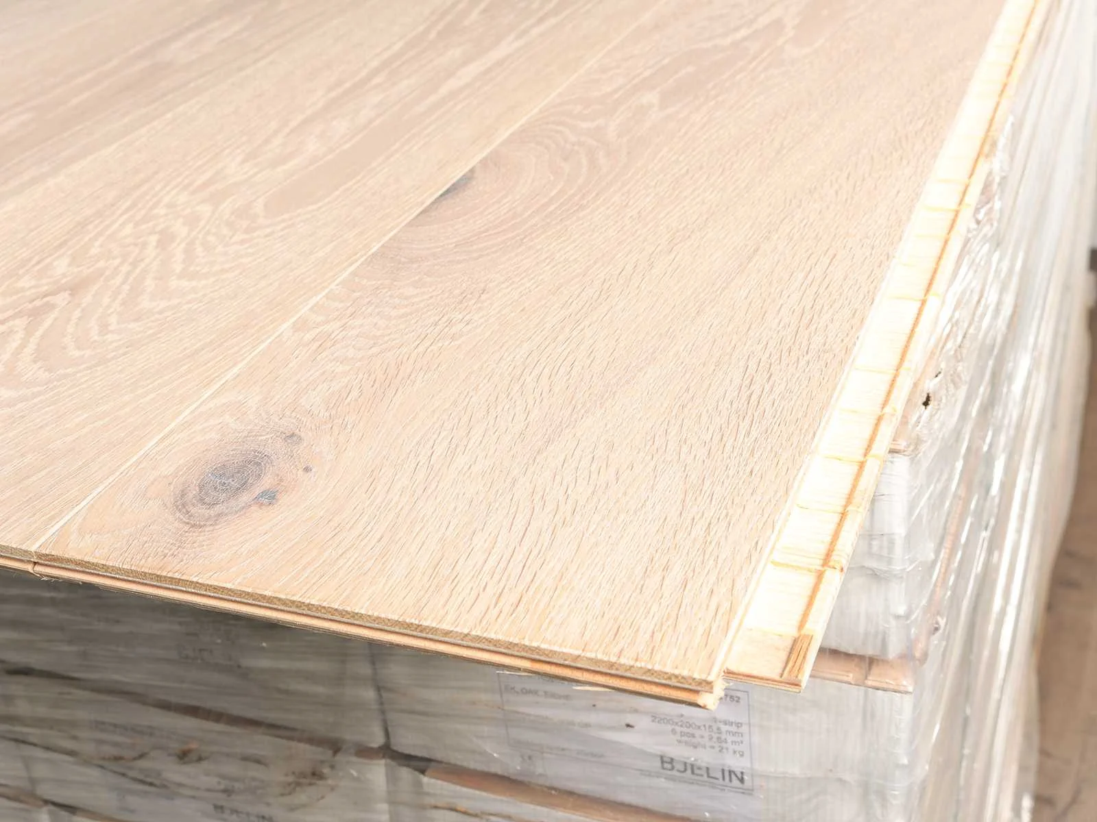 Gemakkelijk te leggen wegens clicksysteem, geschikt voor alle soorten vloer en koelverwarmingen, kwaliteits parketvloer, vloer is van hoogwaardig Europees eiken hout, kant en klaar behandeld, dikte 15 mm, toplaag 4 mm, 37 pakken a 2,72 m2 Bezorgtermijn 14 dagen Merk: Angelwood TR Product type: Parket Oppervlakte: 100m² Geschikt voor vloerverwarming: Ja V-groef: Ja Afwerking: Geolied, geborsteld, Eiken toplaag, met v-groef Aantal m² per verpakking: 2.72m² Kleur: Country 254-2 Gewicht: 825kg Lengte: 2420mm Breedte: 187mm Materiaal: Eiken multiplank