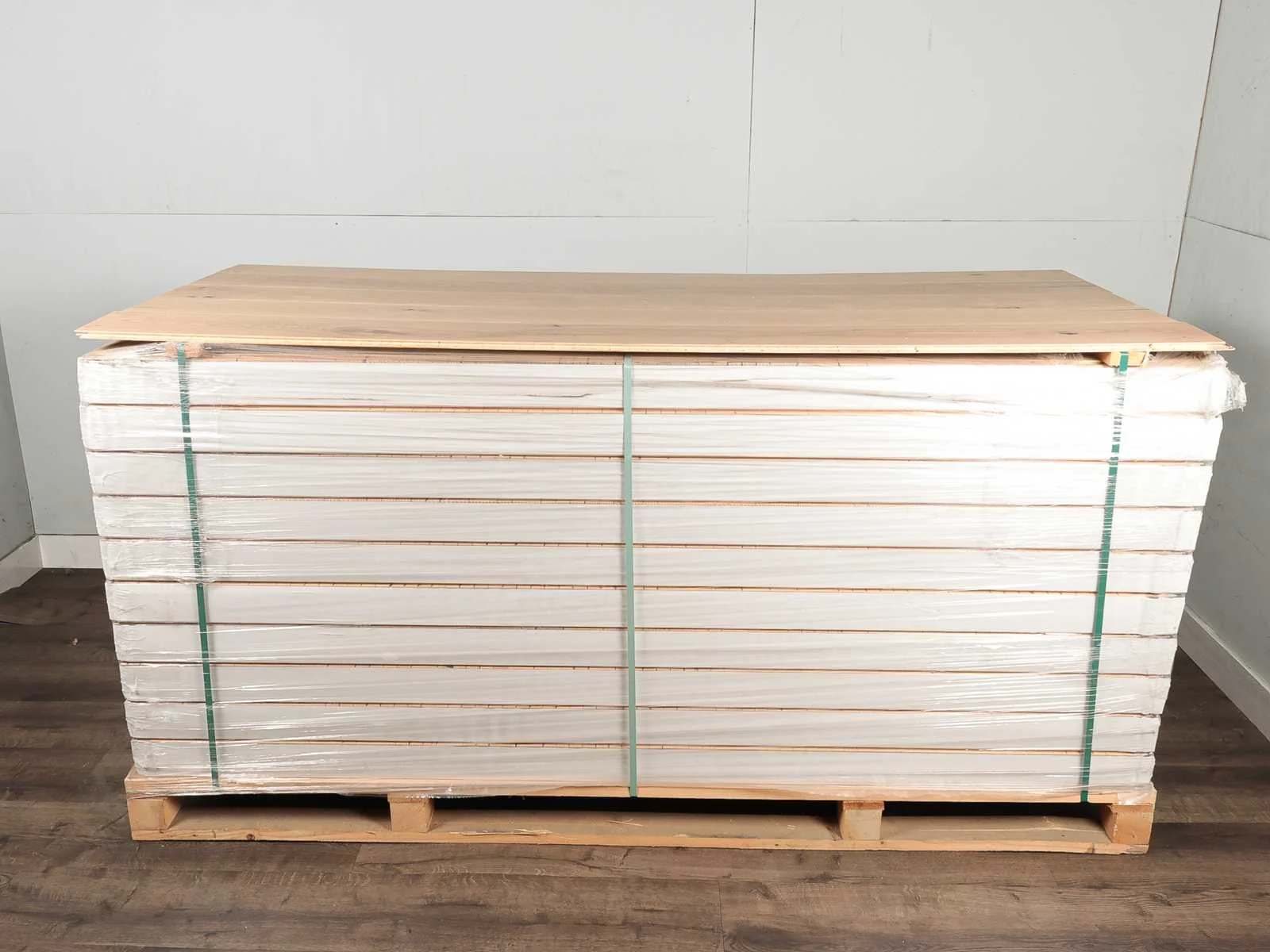 Gemakkelijk te leggen wegens 5G clicksysteem, geschikt voor alle soorten vloer en koelverwarmingen, kwaliteits parketvloer, vloer is van hoogwaardig Europees eiken hout, kant en klaar behandeld, dikte 14 mm, toplaag 3 mm, 18 pakken a 2,77 m2 Bezorgtermijn 14 dagen Merk: Ambiance Product type: Parket Oppervlakte: 49m² Geschikt voor vloerverwarming: Ja V-groef: Ja Afwerking: Mat gelakt, geborsteld, Eiken toplaag, met v-groef Aantal m² per verpakking: 2.77m² Kleur: Brown smoked effect 345 Gewicht: 400kg Lengte: 2200mm Breedte: 180mm Materiaal: Eiken multiplank