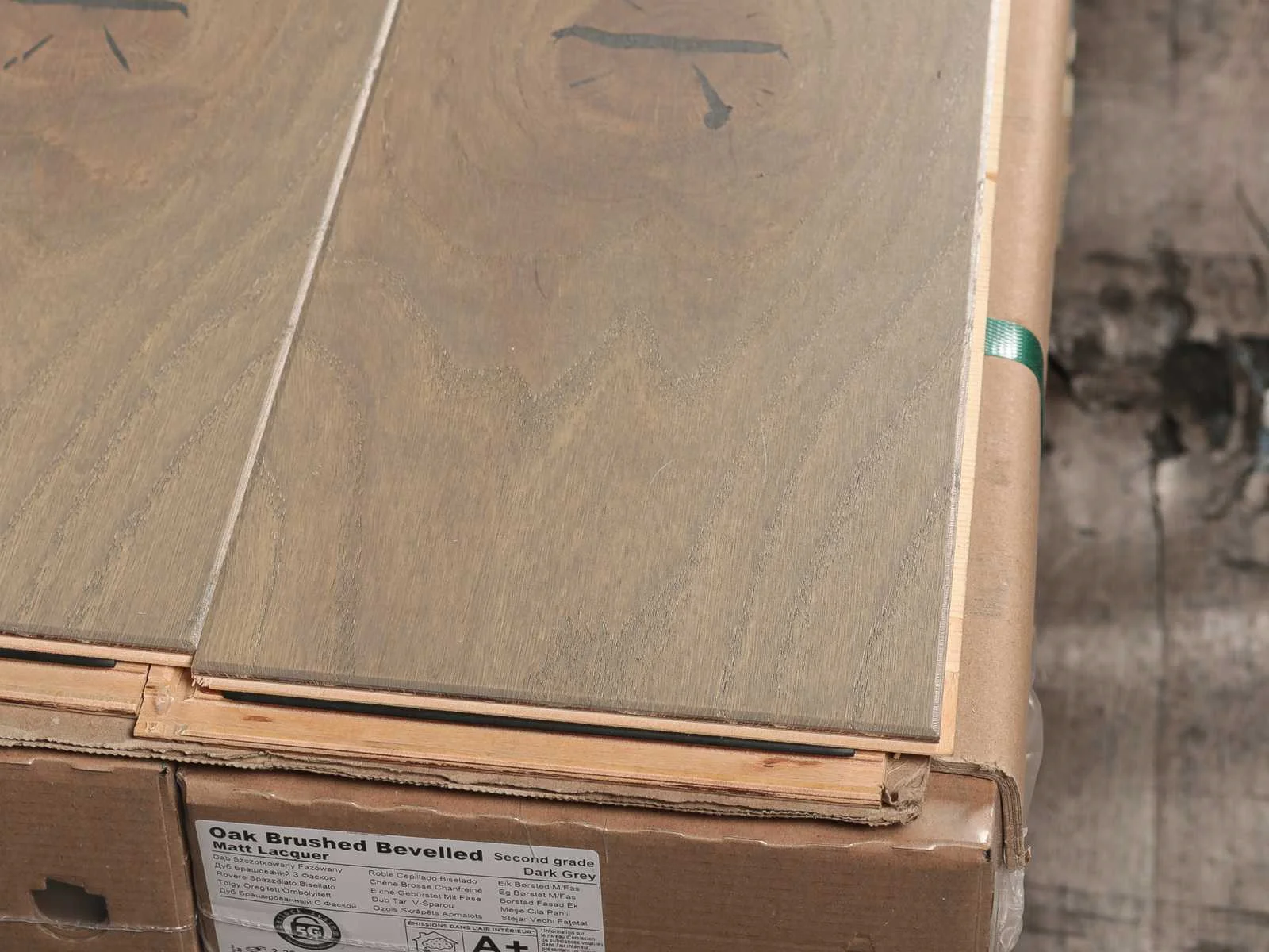 Gemakkelijk te leggen wegens 5G clicksysteem, geschikt voor alle soorten vloer en koelverwarmingen, kwaliteits parketvloer, vloer is van hoogwaardig Europees eiken hout, kant en klaar behandeld, dikte 14 mm, toplaag 3 mm, 19 pakken a 2,26 m2 Bezorgtermijn 14 dagen Merk: Ambiance Product type: Parket Oppervlakte: 42m² Geschikt voor vloerverwarming: Ja V-groef: Ja Afwerking: Mat gelakt, geborsteld, met v-groef Aantal m² per verpakking: 2.26m² Kleur: Dark grey oak 882 Gewicht: 350kg Lengte: 1800mm Breedte: 180mm Materiaal: Eiken multiplank