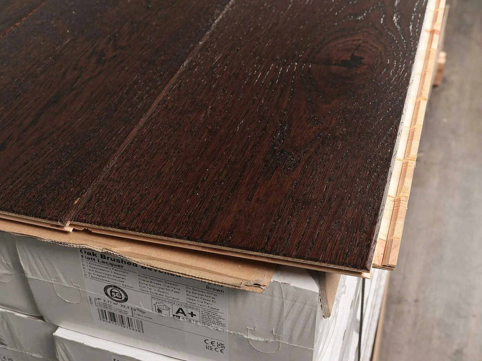 Gemakkelijk te leggen wegens 5G clicksysteem, geschikt voor alle soorten vloer en koelverwarmingen, kwaliteits parketvloer, vloer is van hoogwaardig Europees eiken hout, kant en klaar behandeld, dikte 14 mm, toplaag 3 mm, 36 pakken a 2,77 m2 Bezorgtermijn 14 dagen Merk: Ambiance Product type: Parket Oppervlakte: 99m² Geschikt voor vloerverwarming: Ja V-groef: Ja Afwerking: Mat gelakt, geborsteld, met v-groef Aantal m² per verpakking: 2.77m² Kleur: Brown oak 638 Gewicht: 825kg Lengte: 2200mm Breedte: 180mm Materiaal: Eiken multiplank
