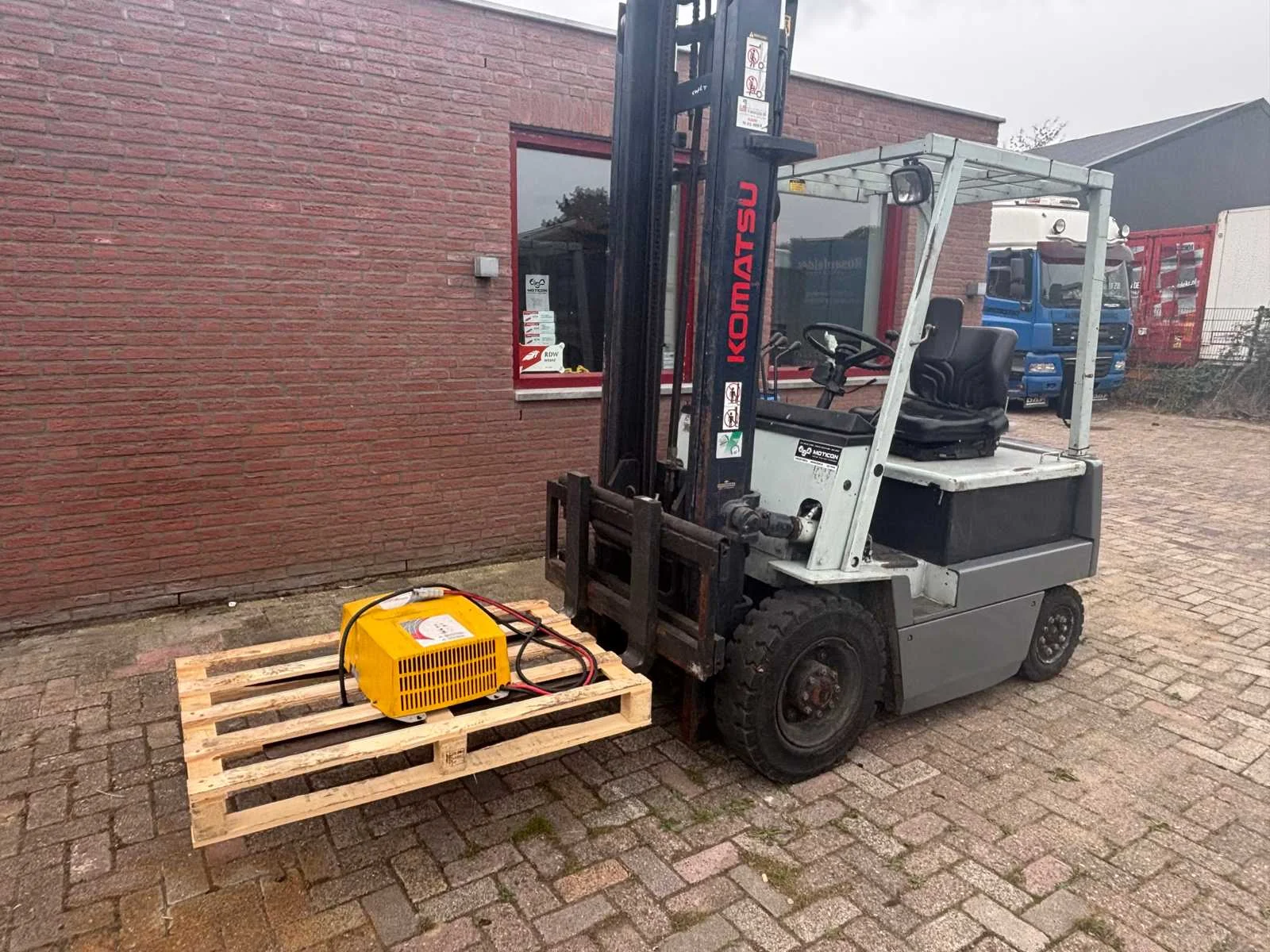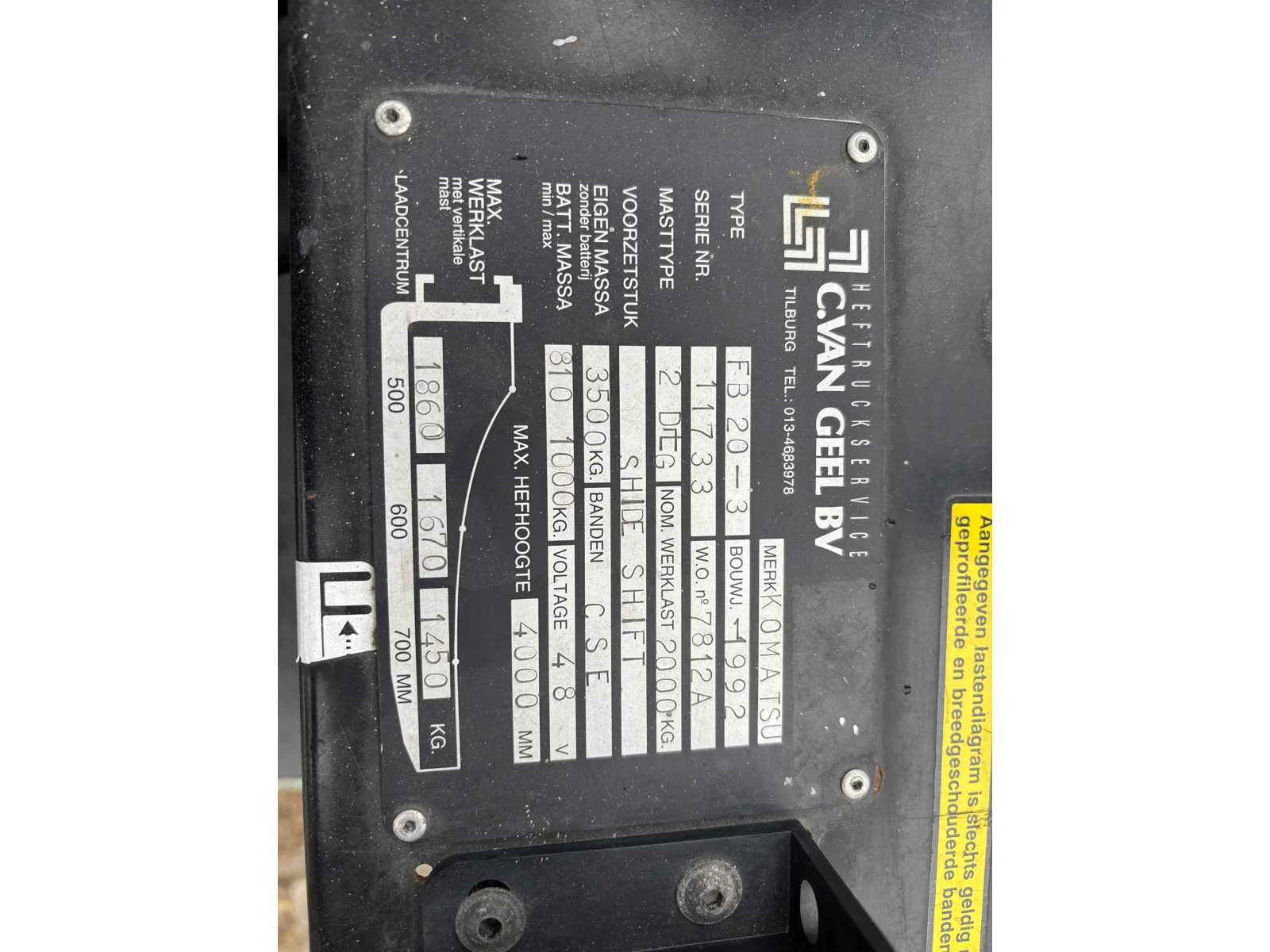Werking getest Inclusief acculader Merk: Komatsu Type: FB-20-3 Bouwjaar: 1992 Brandstof: Elektrische Mast: Duplo Soort band: Volrubber Aantal wielen: 4 Afgelezen urenstand: 20911 Accu lader: true Side-shift: true Duplex mast: true Eigen gewicht: 3500kg Hefvermogen: 2000kg Max. hefhoogte: 4000mm Vol rubber banden: true