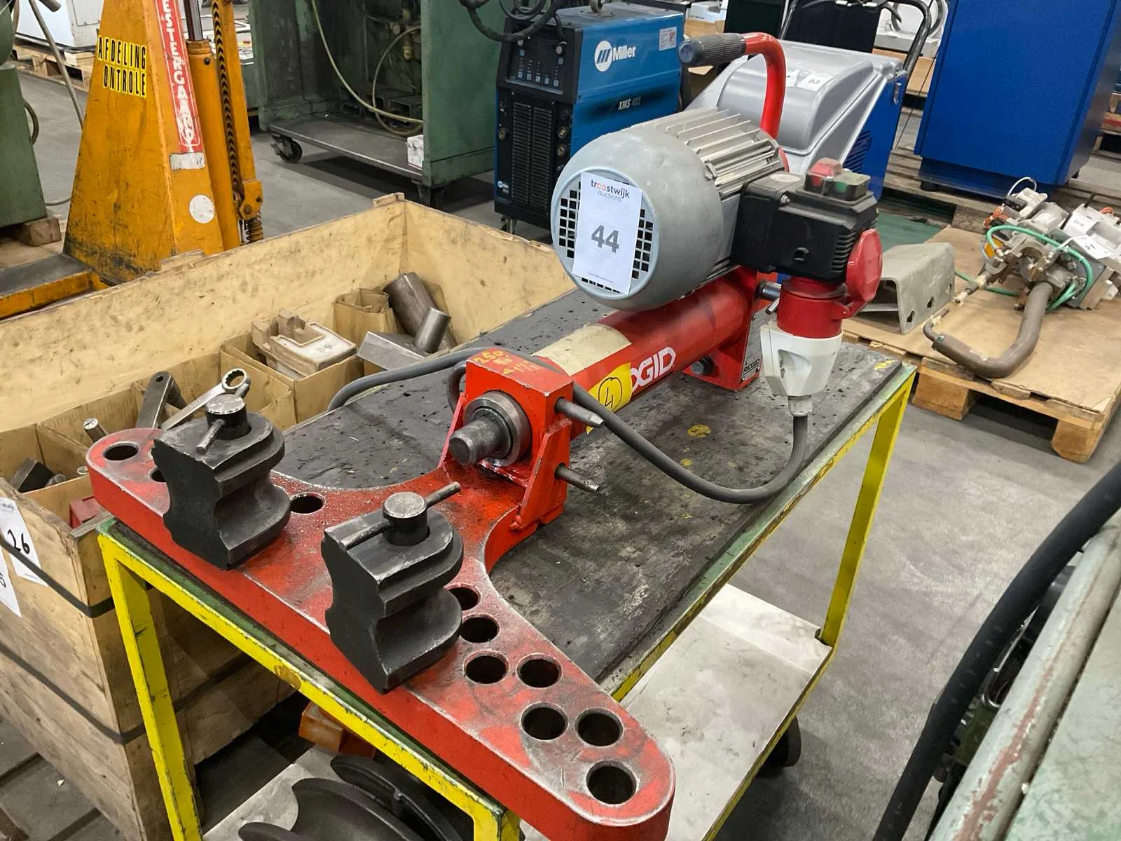 Capaciteit: 3/8” - 2”, op verrijdbare tafel, inclusief buigmallen Merk: Ridgid Bouwjaar: 2001 Serienummer: 4315 Motorvermogen (kW): 1.5kW Aansluiting: 400V Machinegewicht: 42kg Afmeting l: 960mm Afmeting b: 650mm Afmeting h: 1150mm