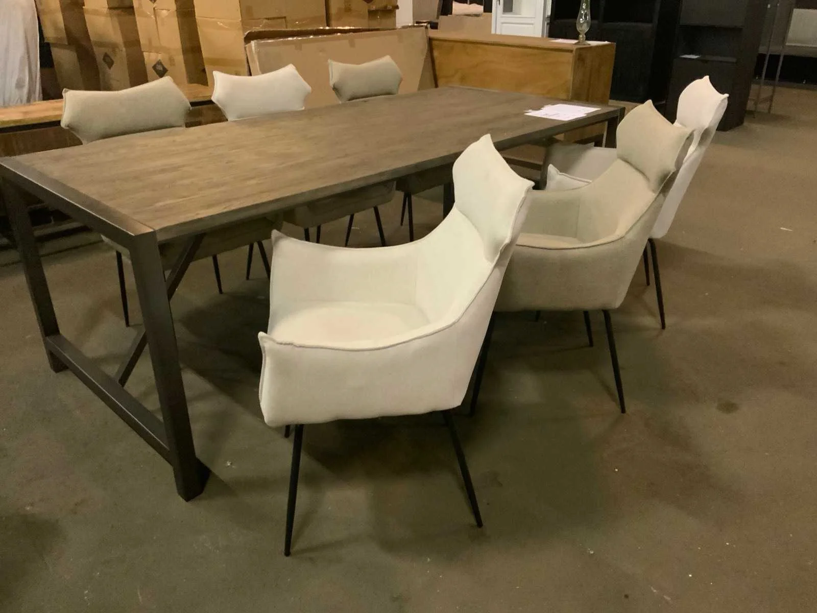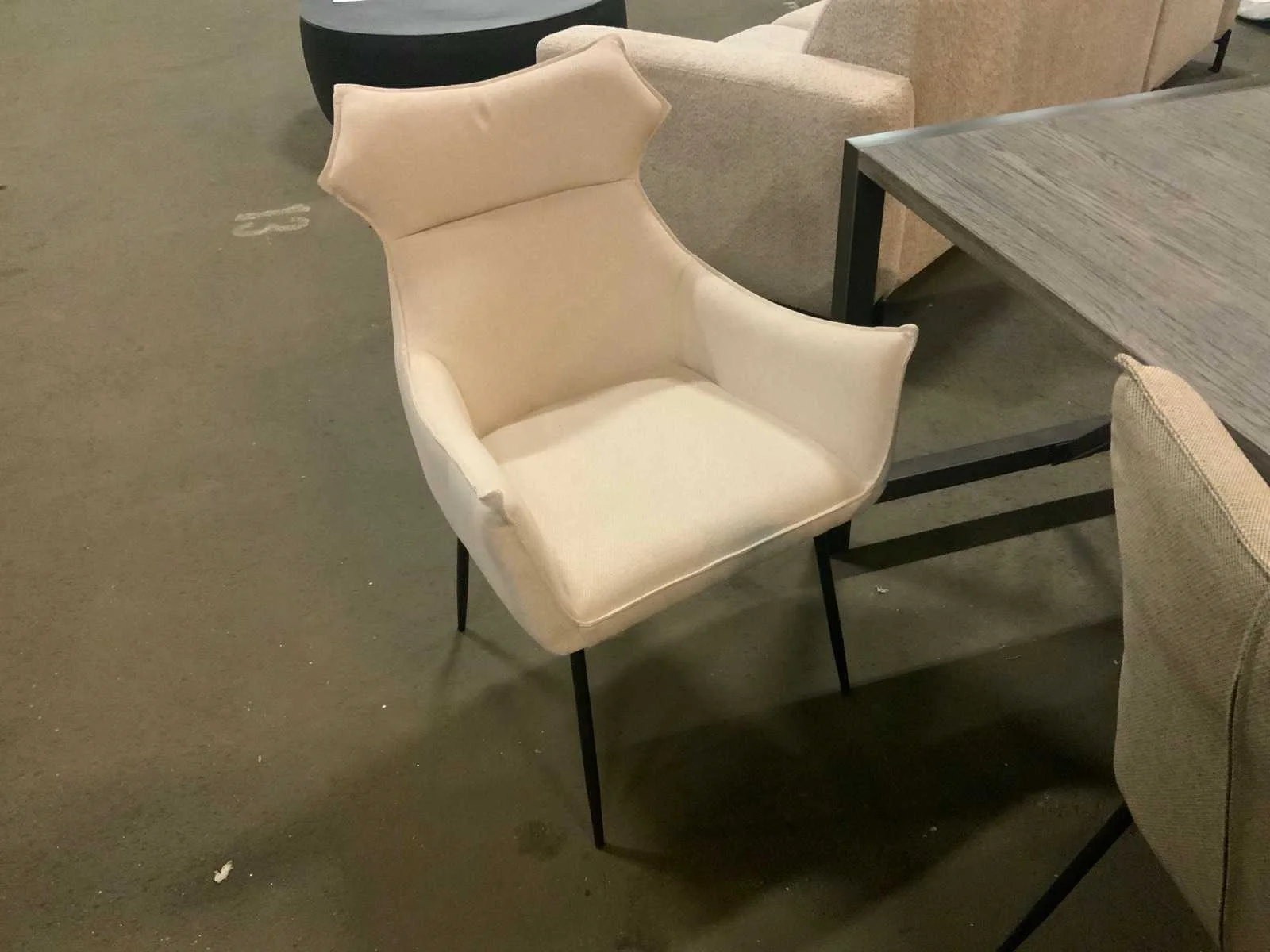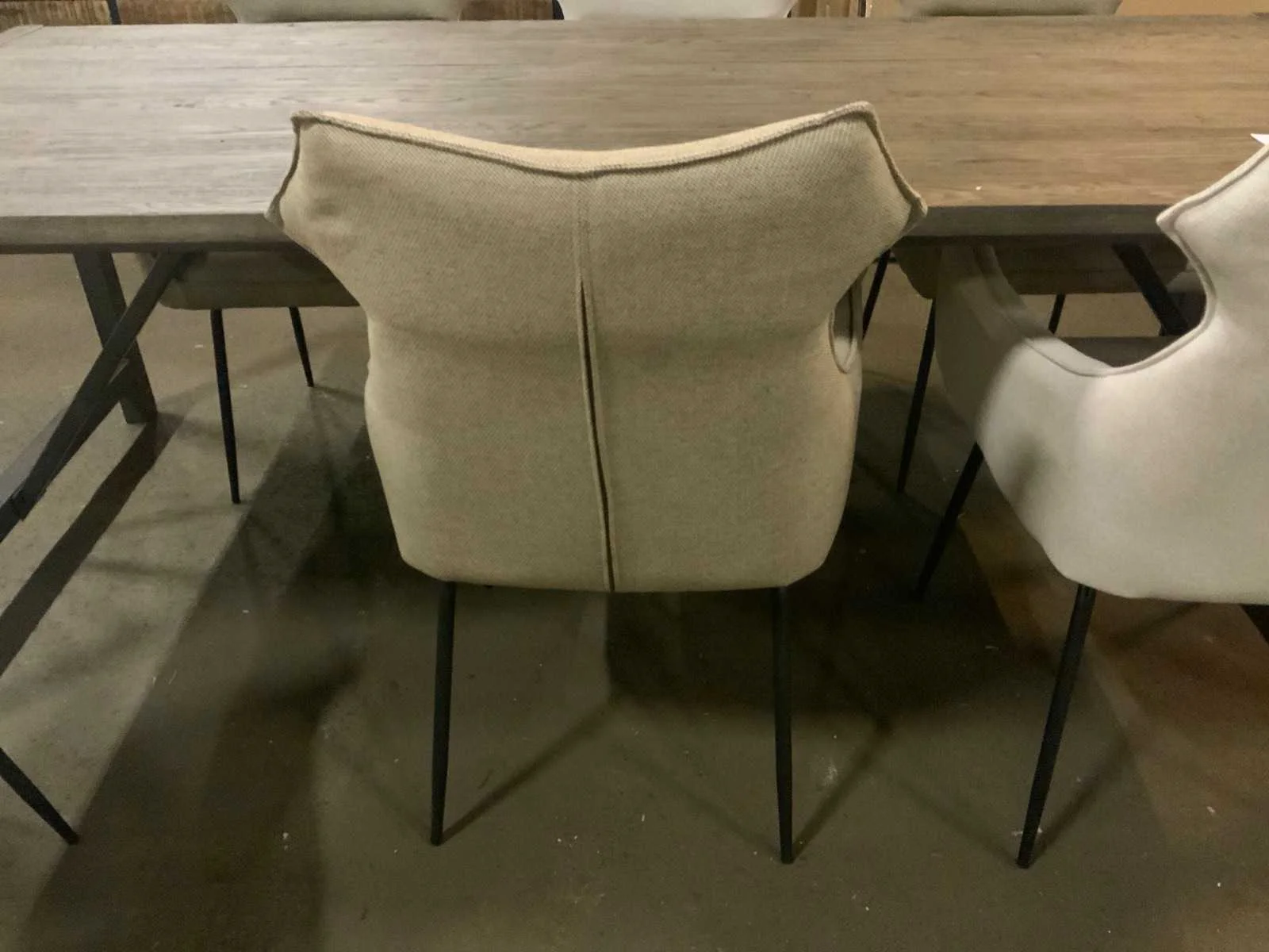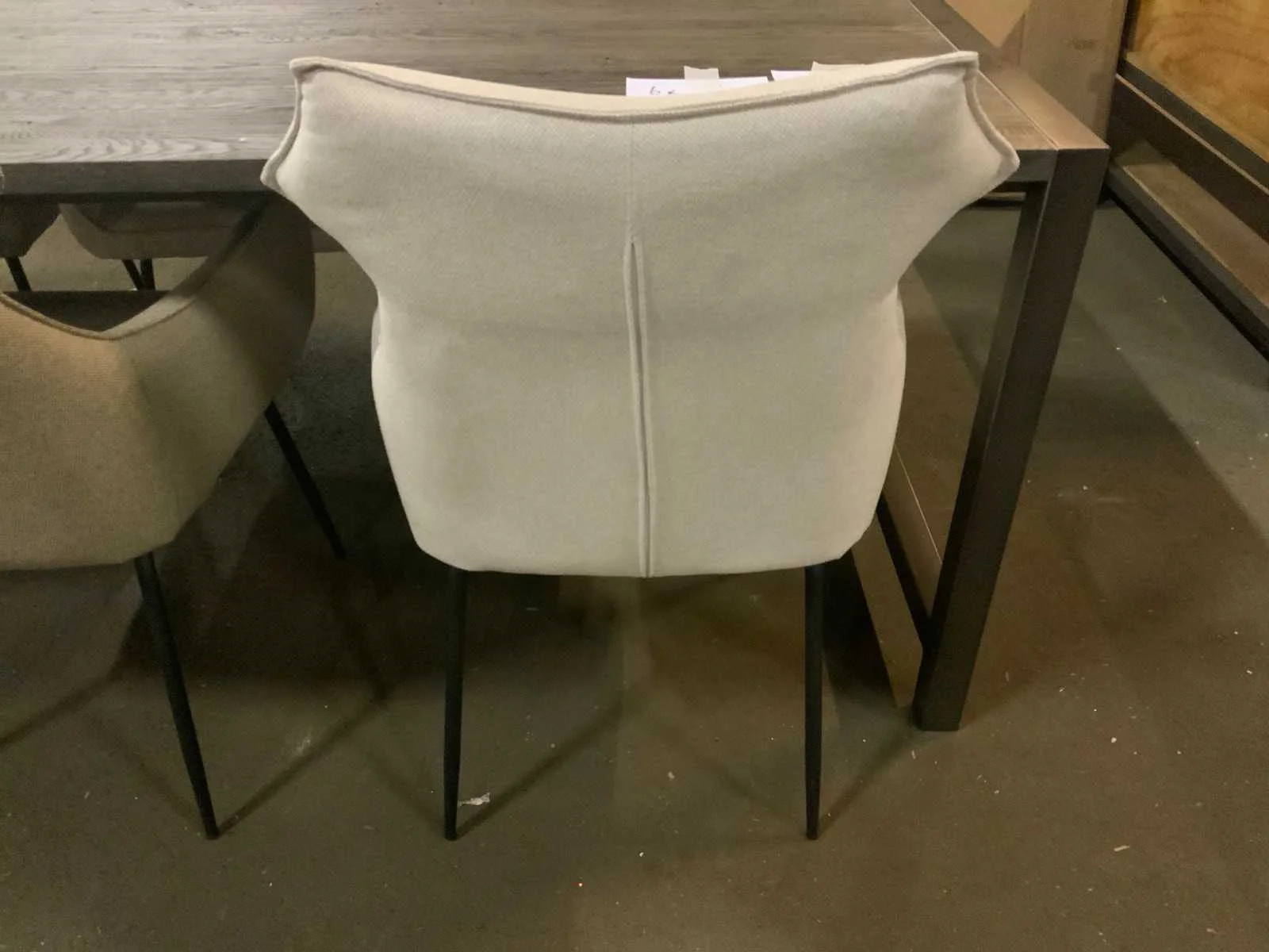 Model: Dyonne Kleur: Creme wit / grijs Breedte: 60cm Hoogte: 90cm Zithoogte: 46cm Materiaal: Stalen poten voorzien van gestoffeerde zitting Diepte: 45cm