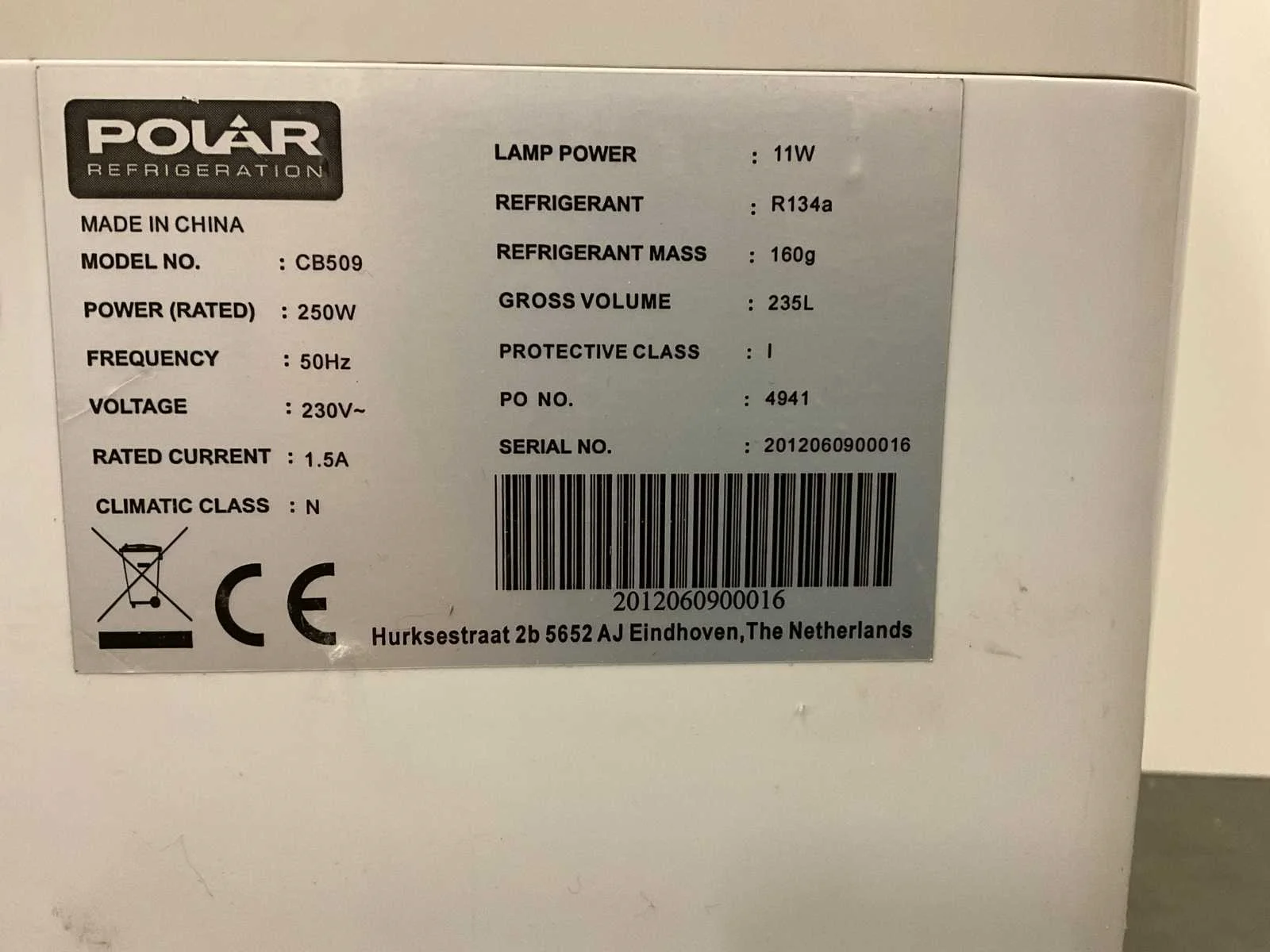 Scheur in kap zie laatste foto Merk: Polar Type: CB509 Serienummer: 2012060900016 Aansluiting: 230V Totale afmeting L: 470mm Totale afmeting Breedte: 520mm Totale afmeting Hoogte: 1700mm