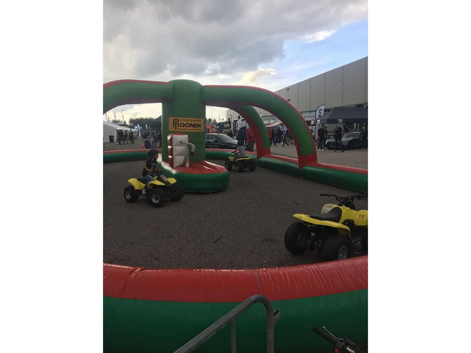 Opblaasbare boarding + 3 quads. Verkoop is exclusief blower, pallets en spanbanden. Attractie heeft een geldig certifitcaat. Lengte: 1700cm Breedte: 800cm