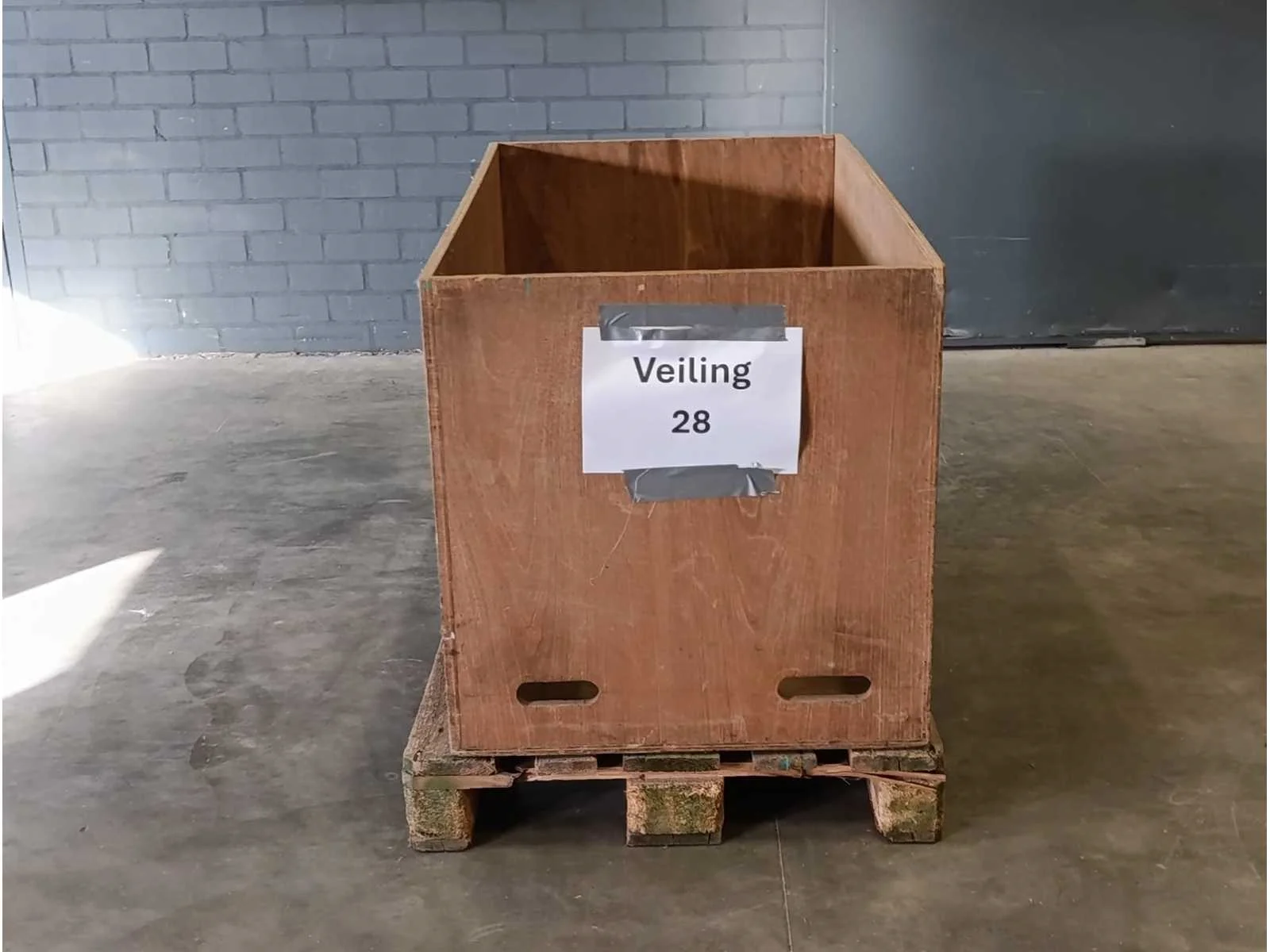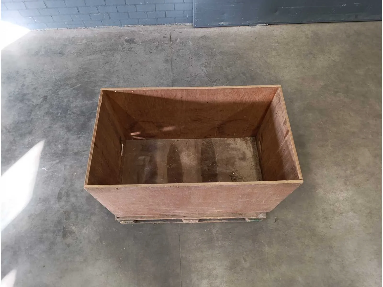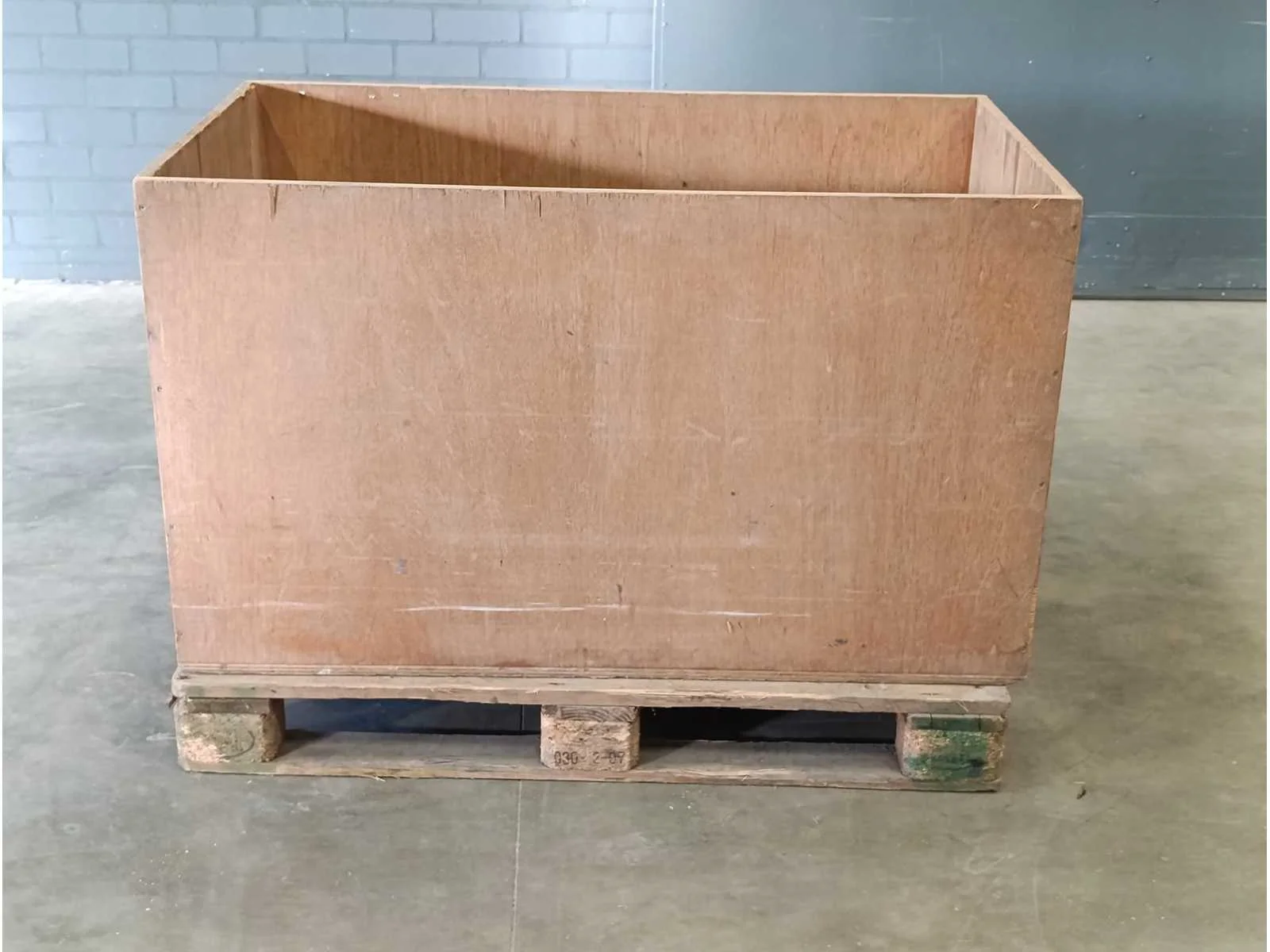 Lege houten bak. Verkoop exclusief pallet. Lengte: 122cm Breedte: 70cm Hoogte: 72cm