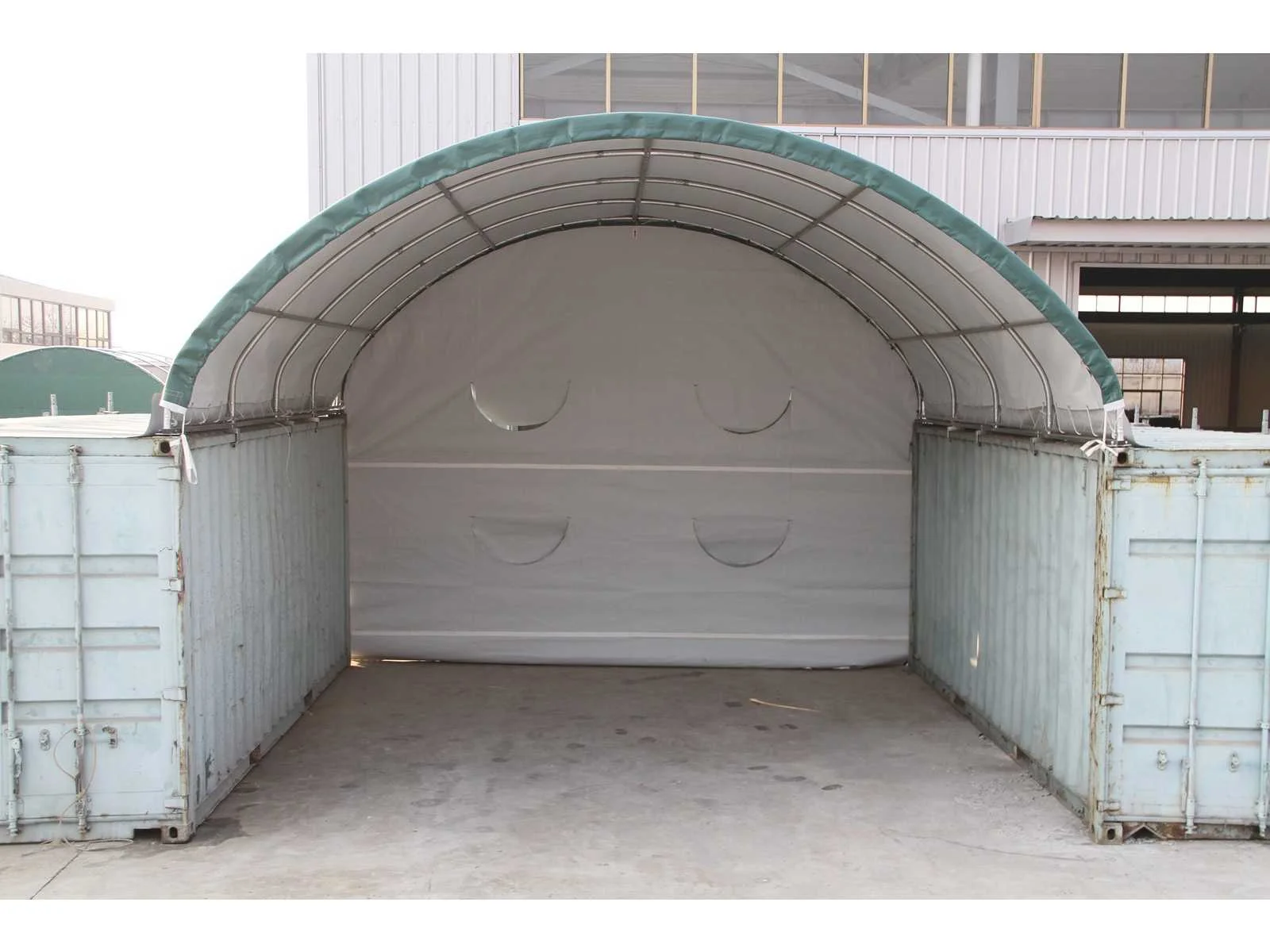 Gegalvaniseerd stalen frame rond, v.v. gesloten achterwand, 45 x 1,5 mm, gording 32 x 1.2 mm, PVC zeildoek 500 gram, kleur wit, geleverd in stalen kist, 750 x 1920 x 380 mm, ongebruikt Transportmaat: 200x60x60 cm Merk: Greenland Type: 6x6x2 meter Bouwjaar: 2025 Militaire container: true Totale afmeting L: 6000mm Totale afmeting Breedte: 6000mm Totale afmeting Hoogte: 2000mm